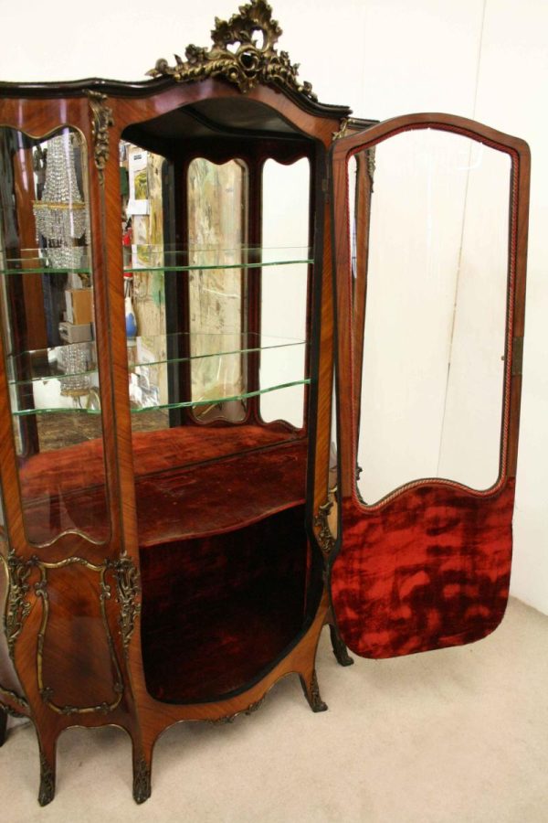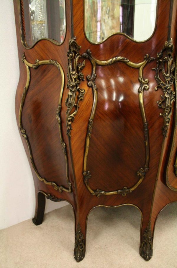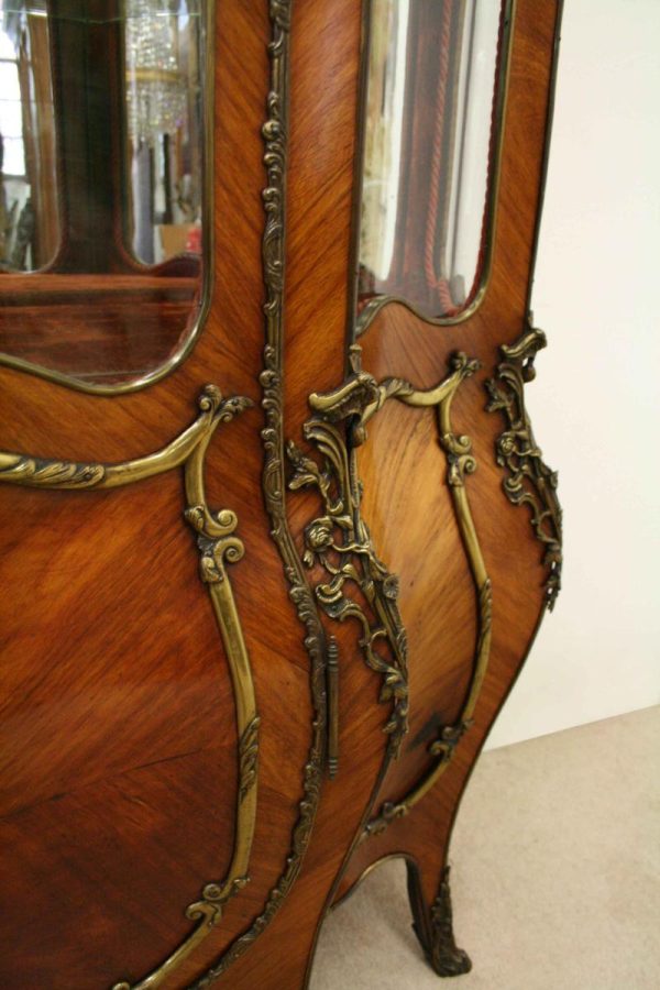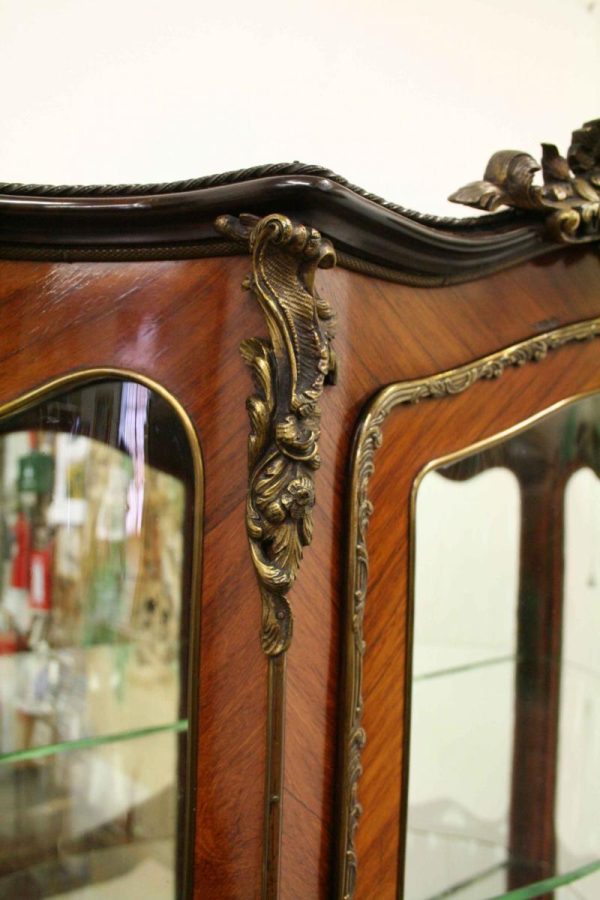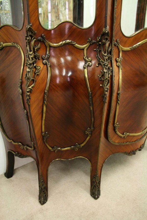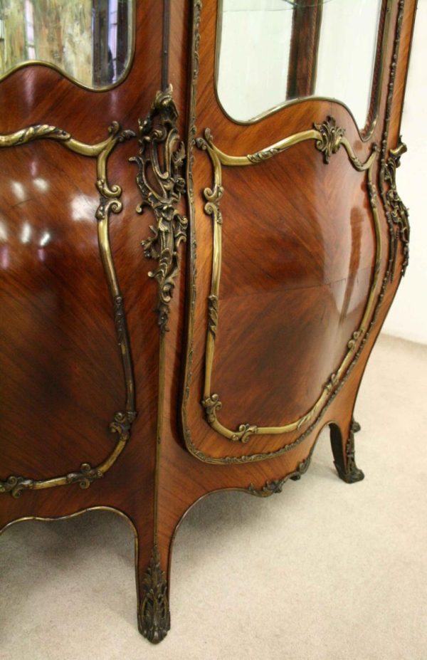Circa 1870, French kingwood serpentine bombe display cabinet, the arched cornice centred by a scrolling gilt bronze cresting above a glazed door opening to a shelved interior with mirror back; flanked by further glazed panels, the doors outlined in gilt bronze, raised on splayed legs with gilt bronze shoes.