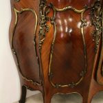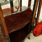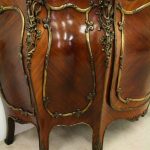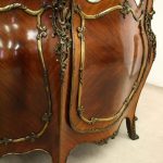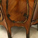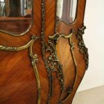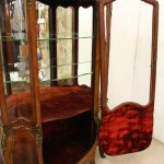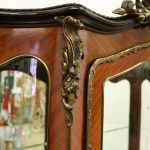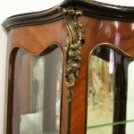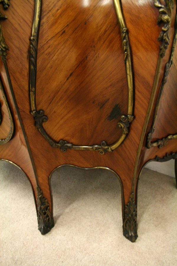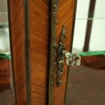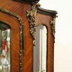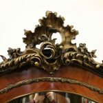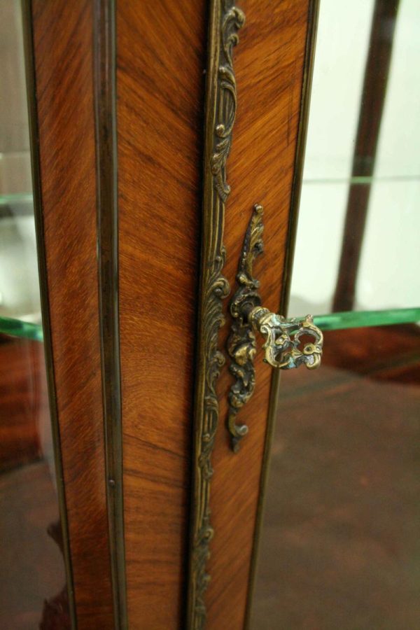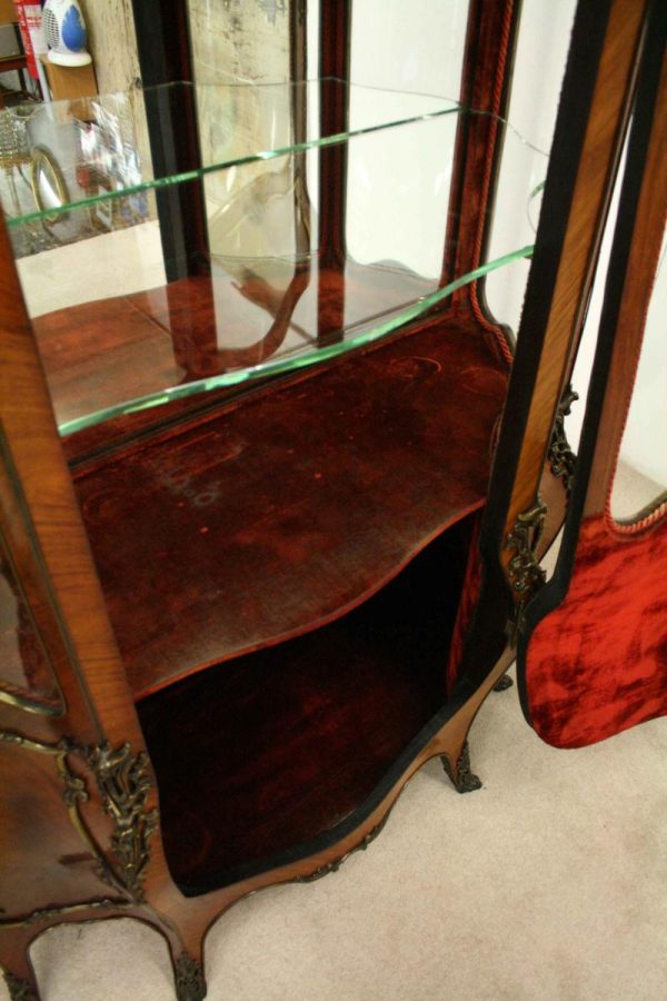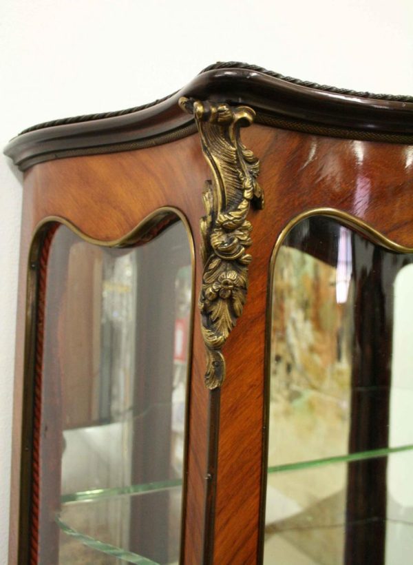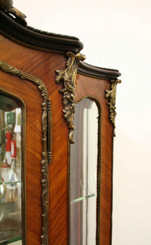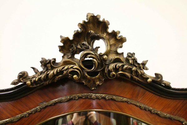 Circa 1870, French kingwood serpentine bombe display cabinet, the arched cornice centred by a scrolling gilt bronze cresting above a glazed door opening to a shelved interior with mirror back; flanked by further glazed panels, the doors outlined in gilt bronze, raised on splayed legs with gilt bronze shoes.