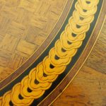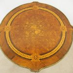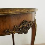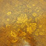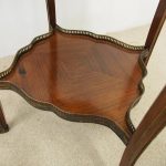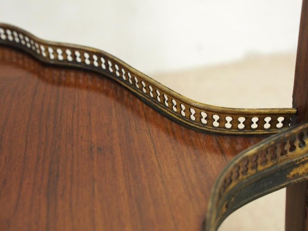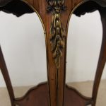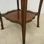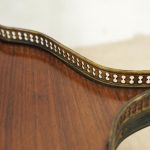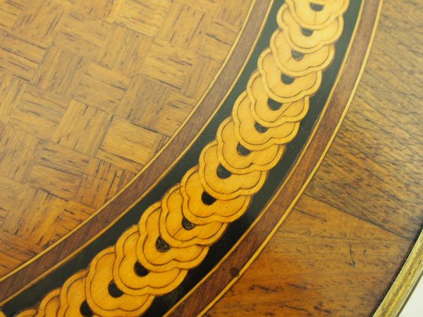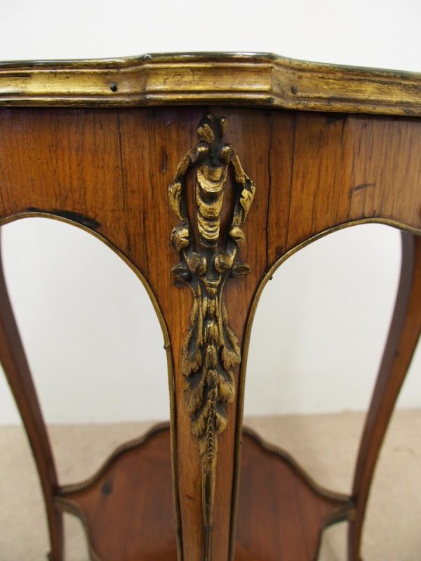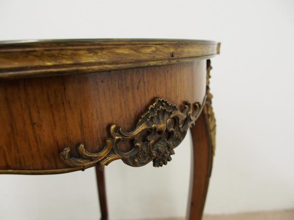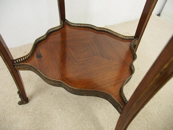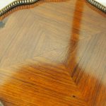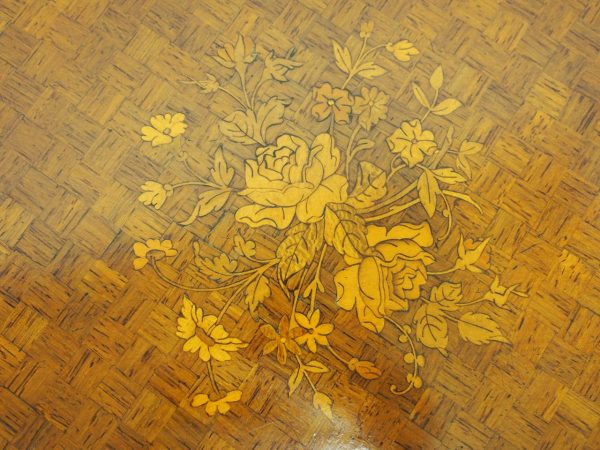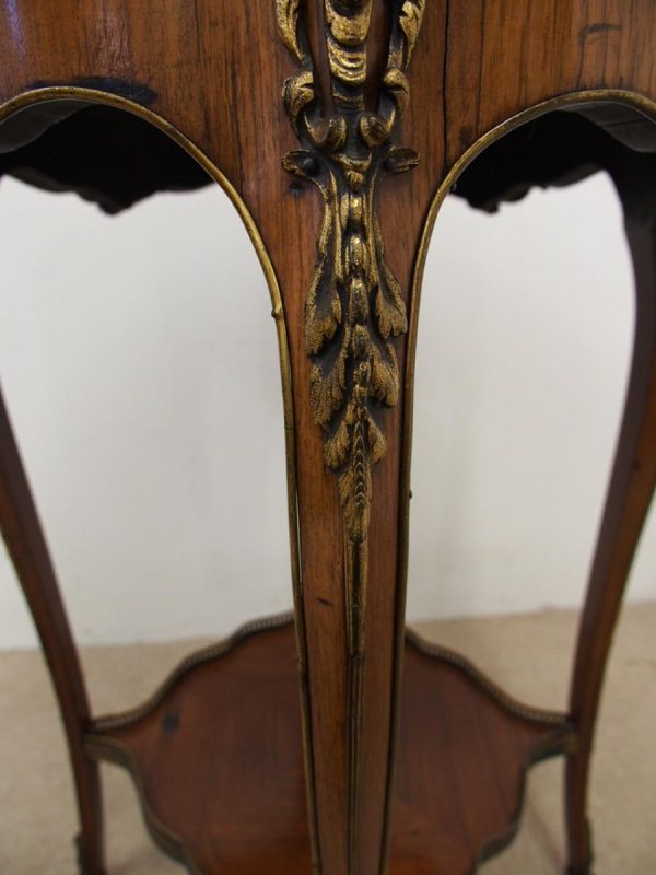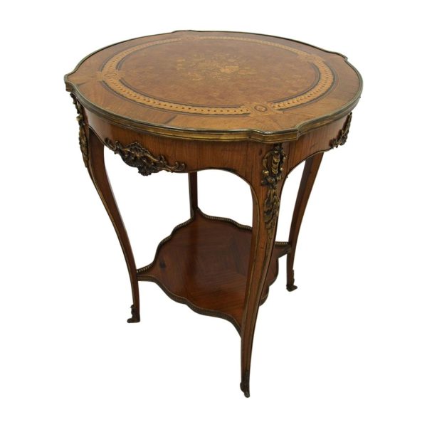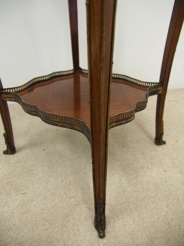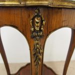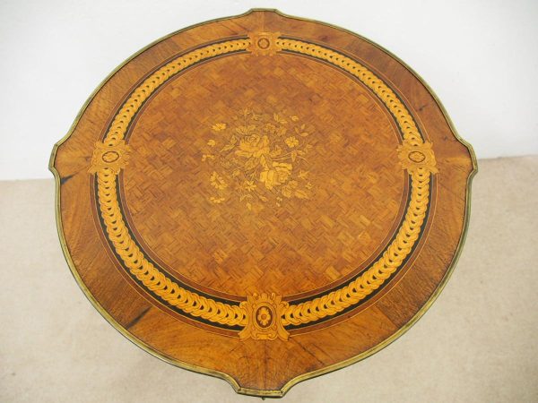 Circa 1890, French kingwood parquetry and marquetry side table. With a shaped circular top with banding and centred by excellent quality floral marquetry and parquetry inlaid. A shaped frieze has ormolu mounts and is raised on slender cabriole legs also with foliate ormolu mounts. These are all joined by a shaped, square parquetry inlaid undertier with a pierced brass gallery.