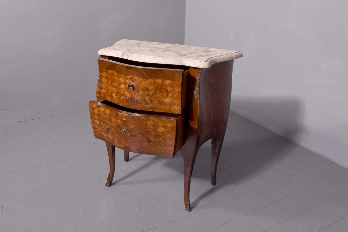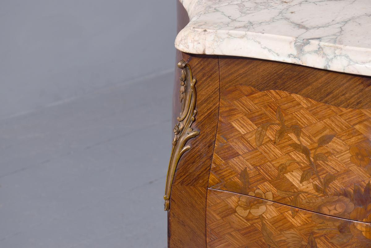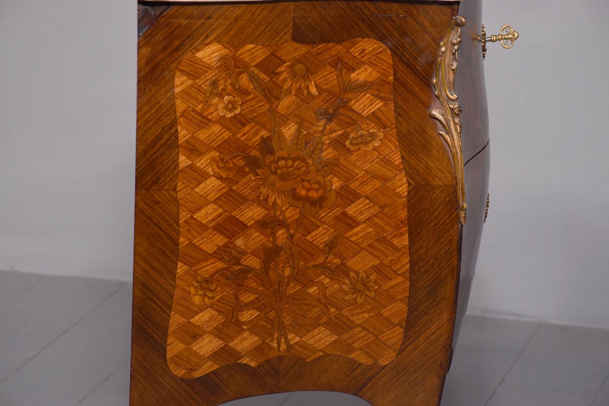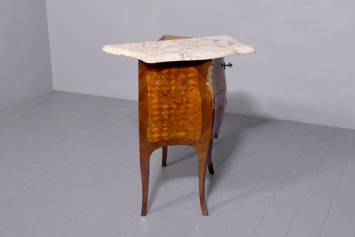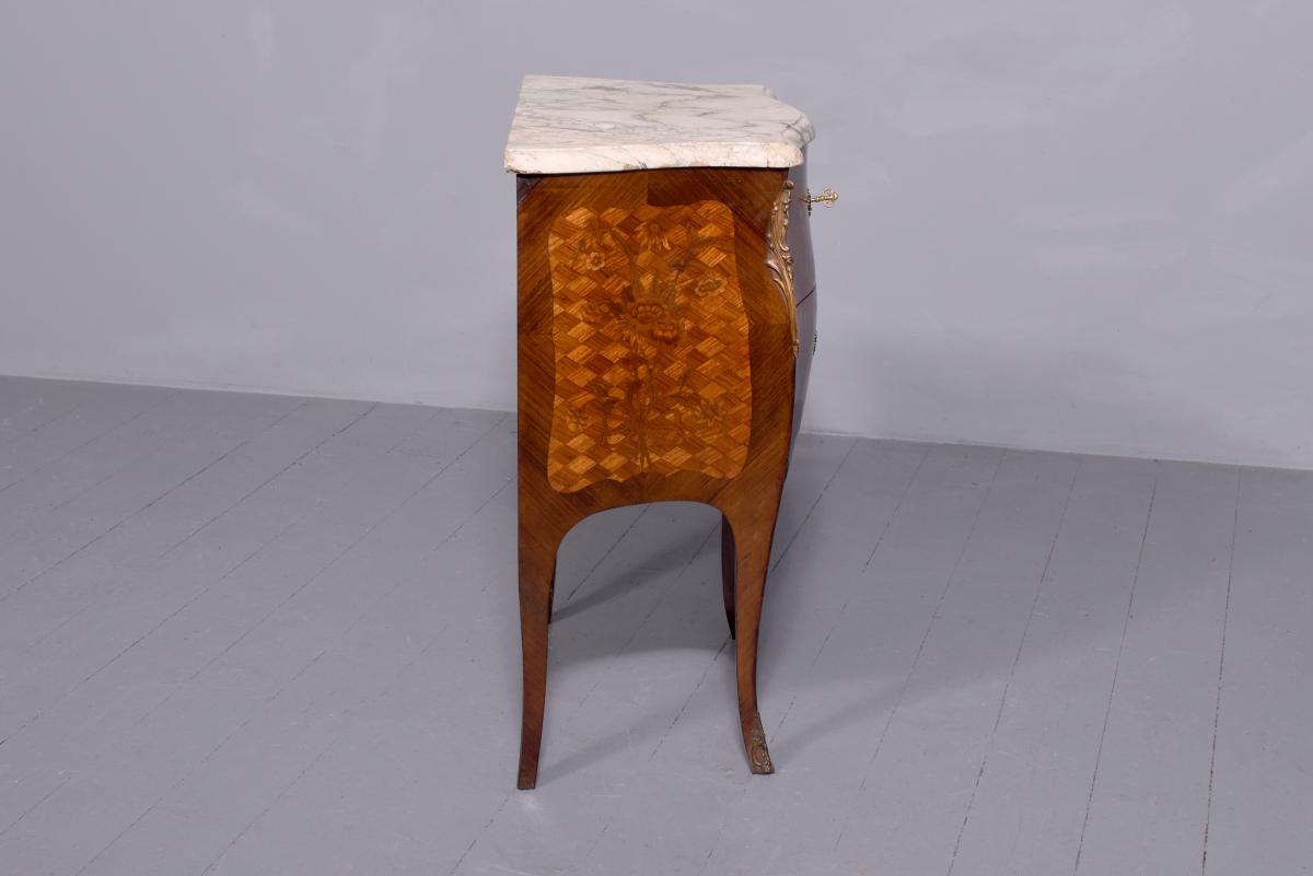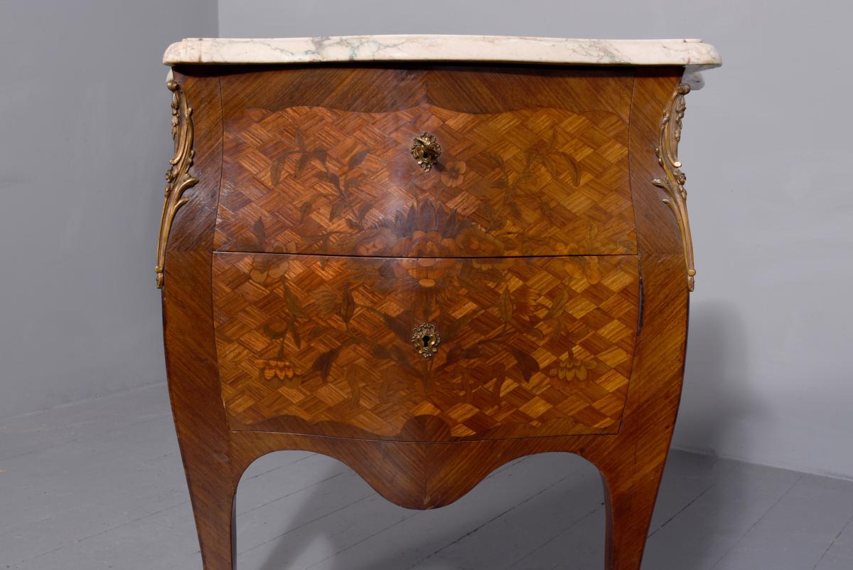 Circa 1920. French Louis XV style marquetry and parquetry inlaid Walnut and Rosewood marble top commode. The serpentine variegated marble top with attractive cream, pink and green colours, above two bombe-front drawers with solid oak drawer linings, inlaid floral decoration on a parquetry background, cast brass escutcheons and original key. The angled sides with ormolu mounts and the sides with further panels of floral inlay on a parquetry background. All supported on cabriole legs with brass sabots