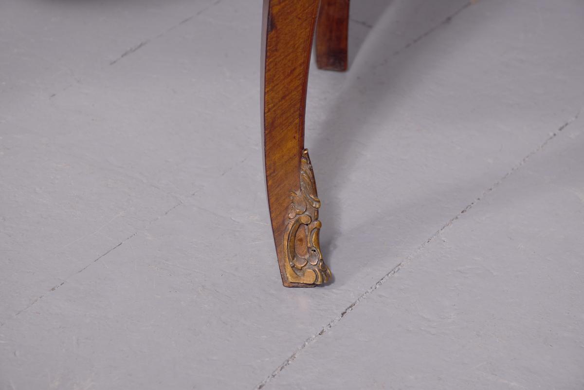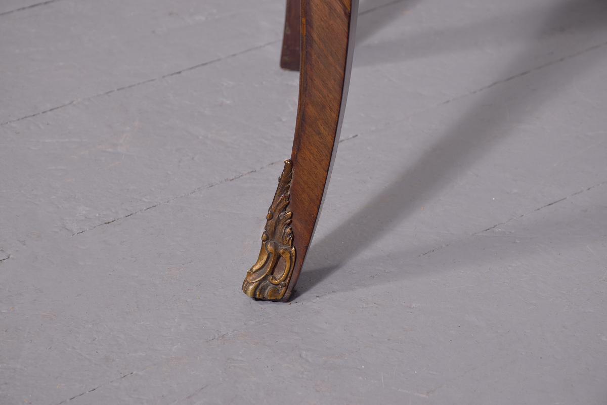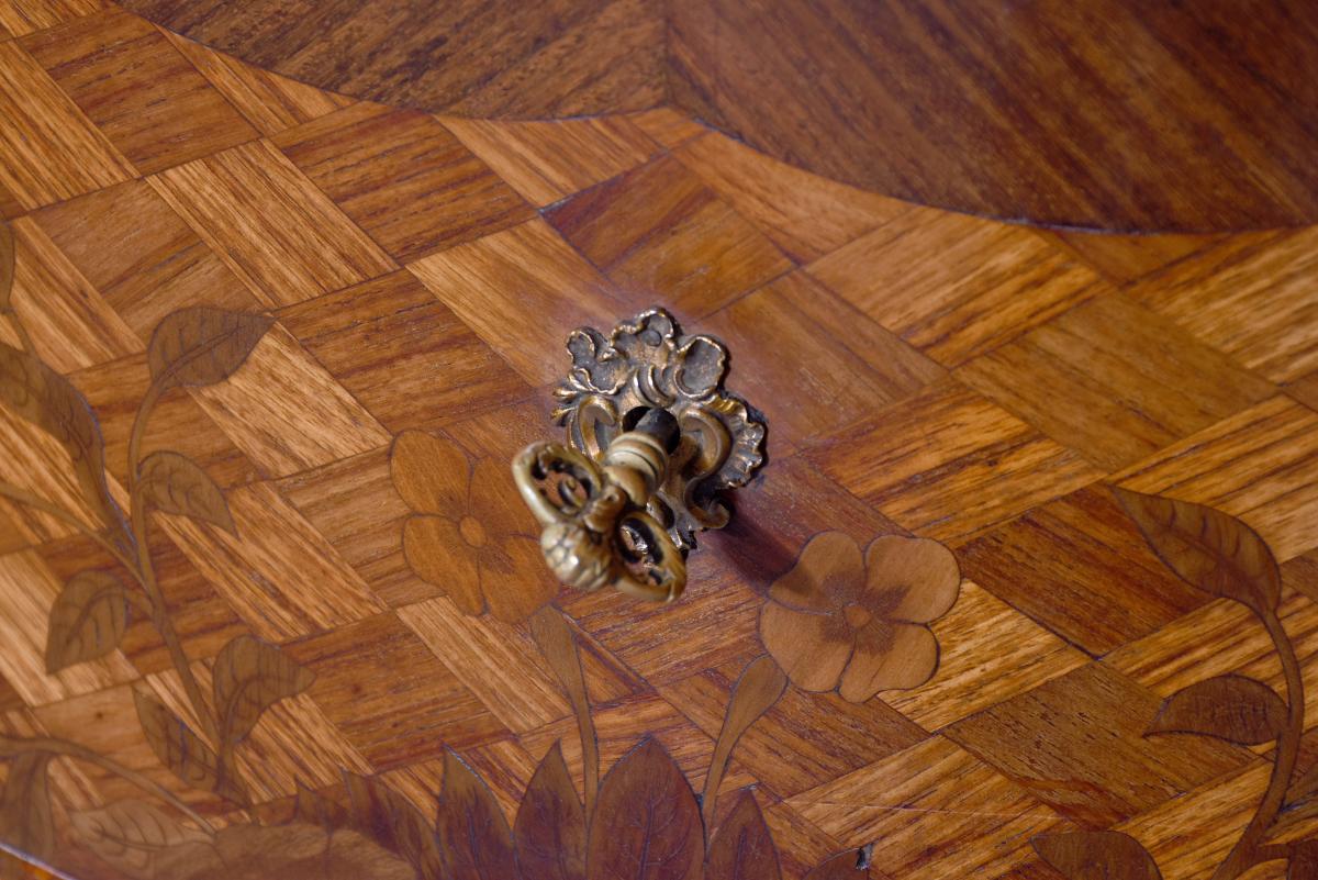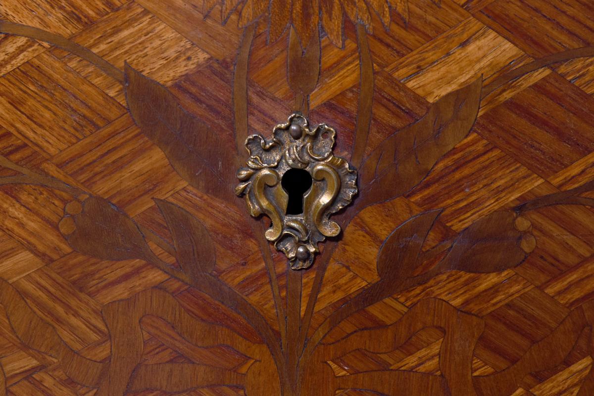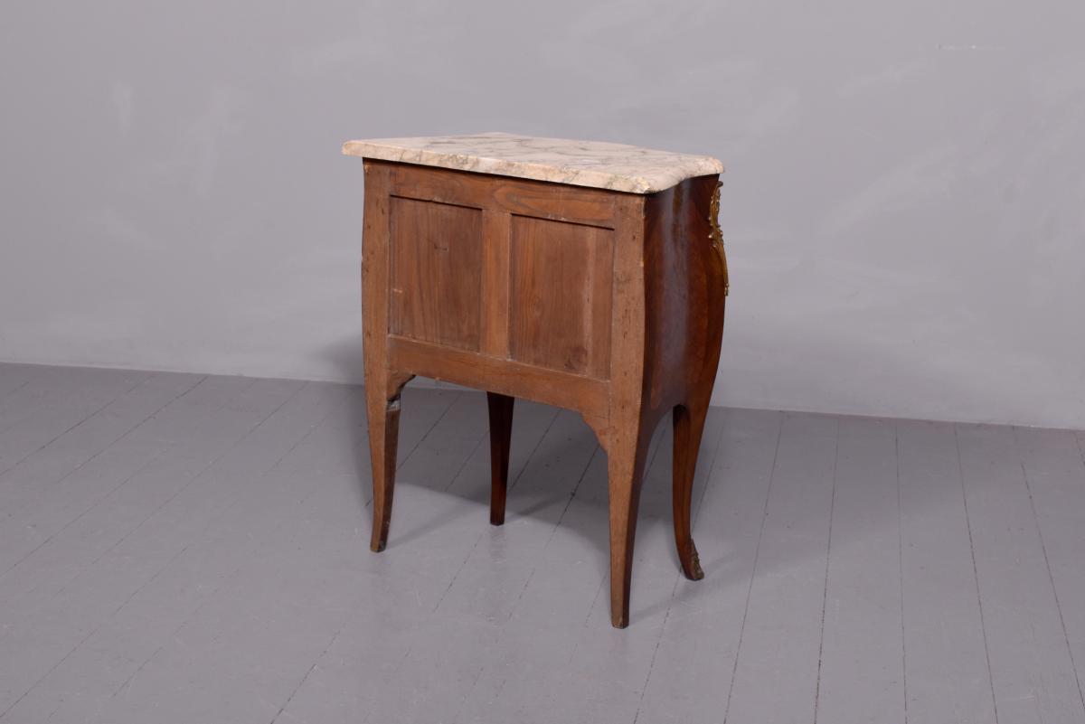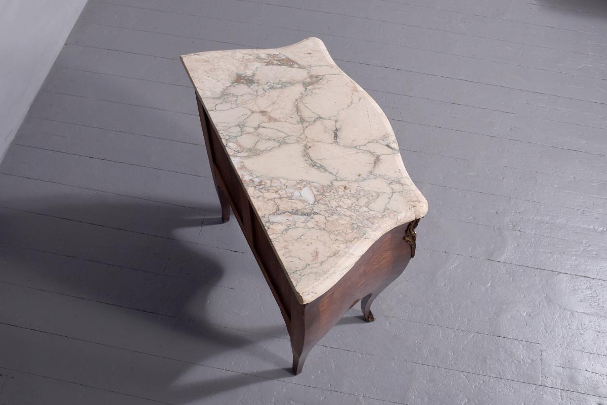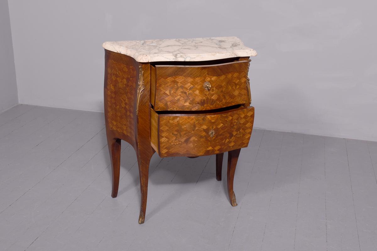 Circa 1920. French Louis XV style marquetry and parquetry inlaid Walnut and Rosewood marble top commode. The serpentine variegated marble top with attractive cream, pink and green colours, above two bombe-front drawers with solid oak drawer linings, inlaid floral decoration on a parquetry background, cast brass escutcheons and original key. The angled sides with ormolu mounts and the sides with further panels of floral inlay on a parquetry background. All supported on cabriole legs with brass sabots