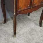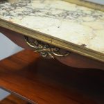 Circa 1890, French marble top etagere. The variegated marble top and ¾ wrap around, open pierced gallery is above ormolu mounts to the front and 2 shelves at the base. The pair of doors has parquetry panels and flower heads, separated by brass beading and opens to a removable single shelf. With a shaped frieze beneath and ormolu mounts running down the facings, all on cabriole legs with well cast sabots.
