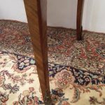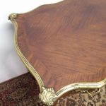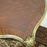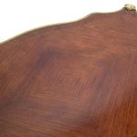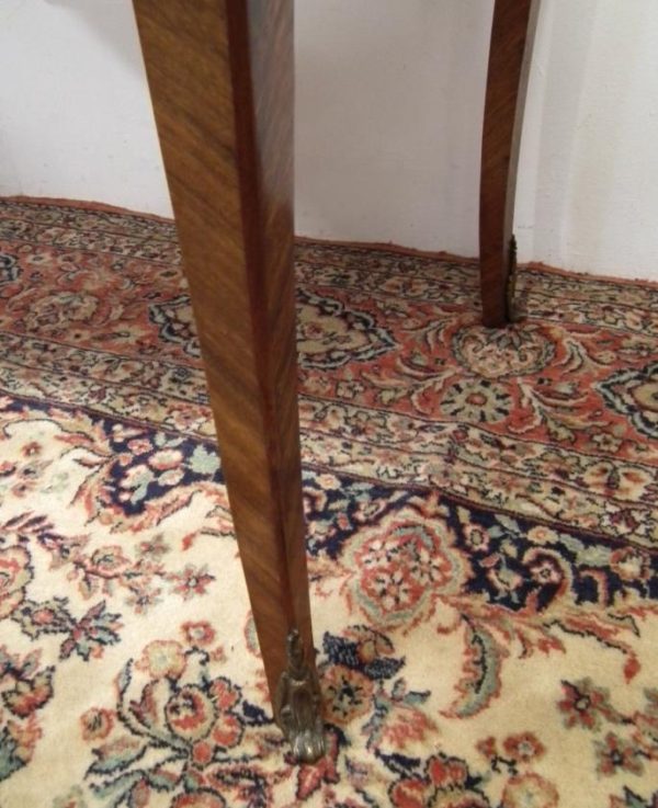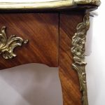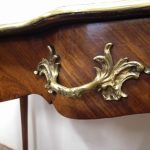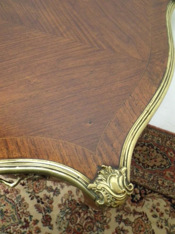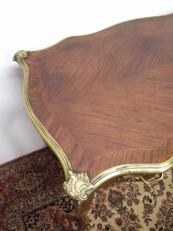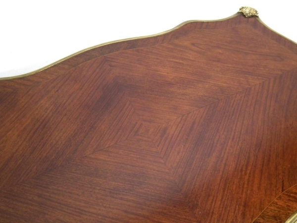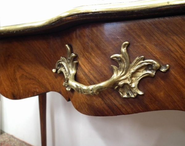 Circa 1900, French neat sized walnut bureau plat. The top is quarter veneered and has a single string inlay, and further crossbanding which is segmented to follow the shape of the double serpentine top. Outside of this the whole top is mounted and encased in a brass bezel. Each corner has a wonderful cast brass mount in the form of flowers. Below the top is a drawer with cast brass Rococo handles. The bottom of the drawer is shaped and finishes like an apron. The gables are bow fronted with half matching veneers. There are carved capitols on the tops of the elegant legs, which have chamfered fronts and are crossbanded, sweeping down into cast brass sabots. Neat size, excellent colour.