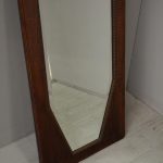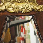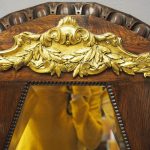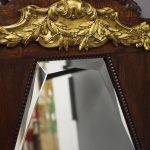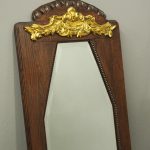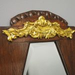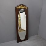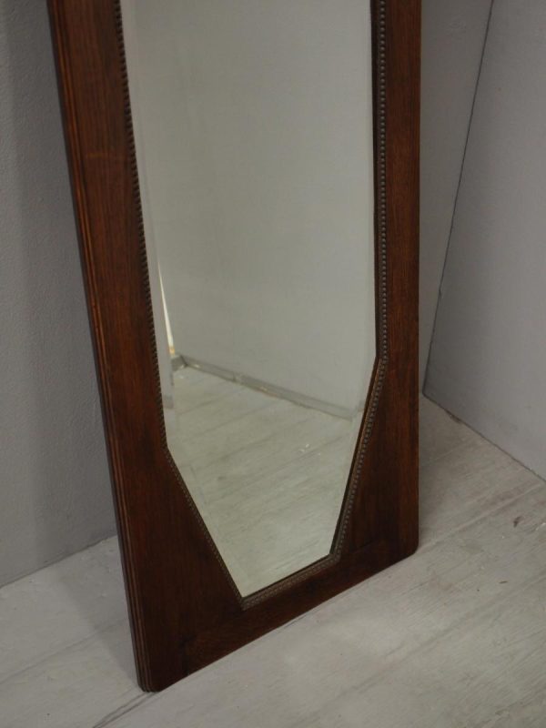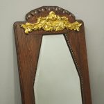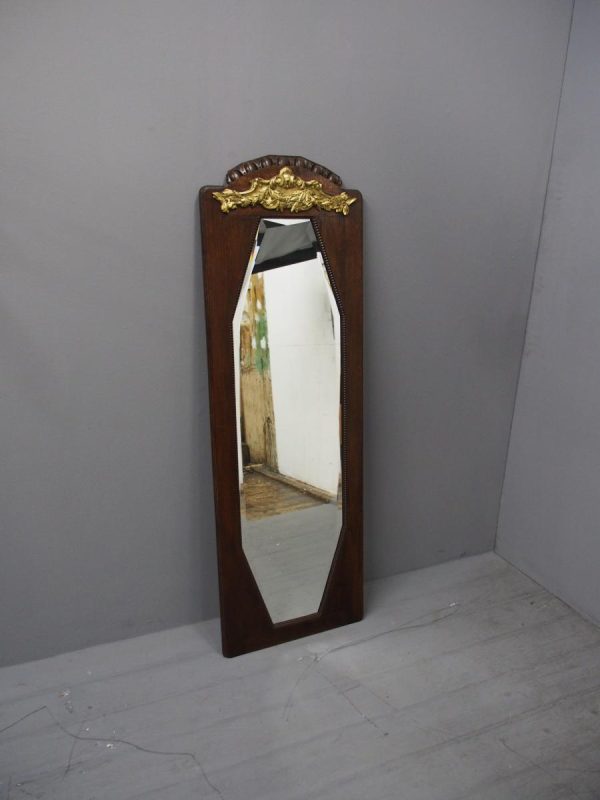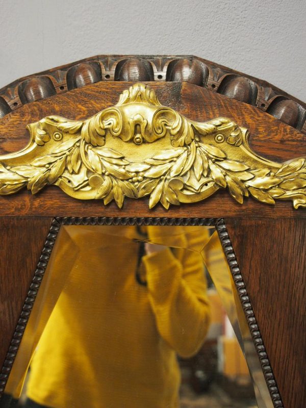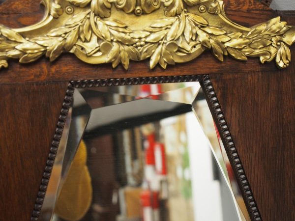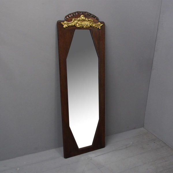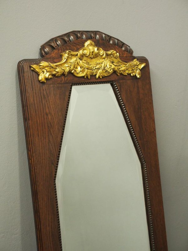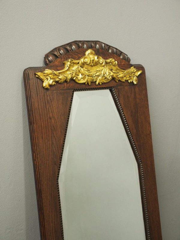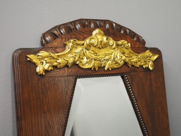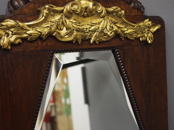 Circa 1920, unusual French oak pier mirror. With chamfered moulded top sections and beneath is a gilded and brass plaque in the form of a ide cartouche with foliate motifs. With bevelled edge and shaped mirror plate and beading that continues around the mirror frame.
