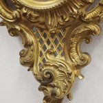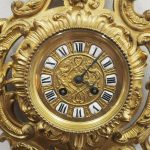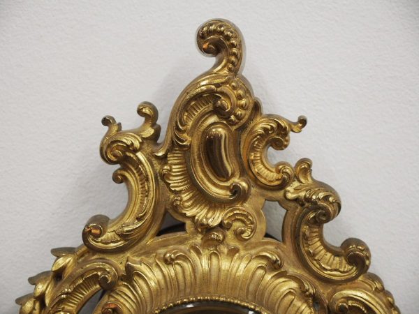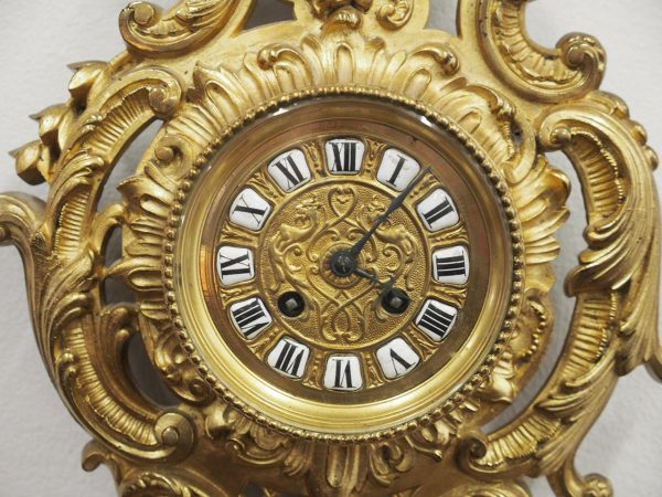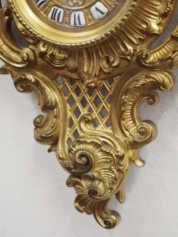 Circa 1870, French ormolu carte clock. With a circular dial with Roman numerals on an enamel plaque. It is surrounded by rococo scrolls and lattice open fretwork decorations.
