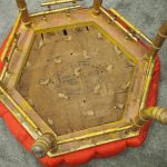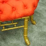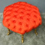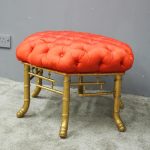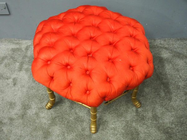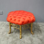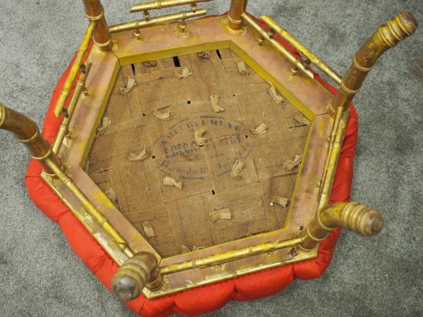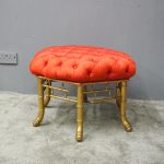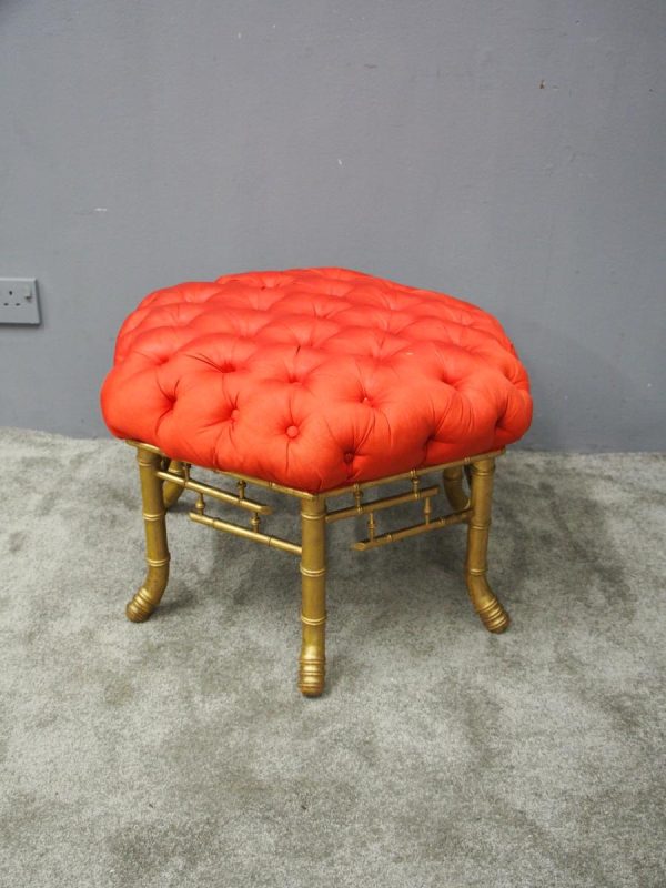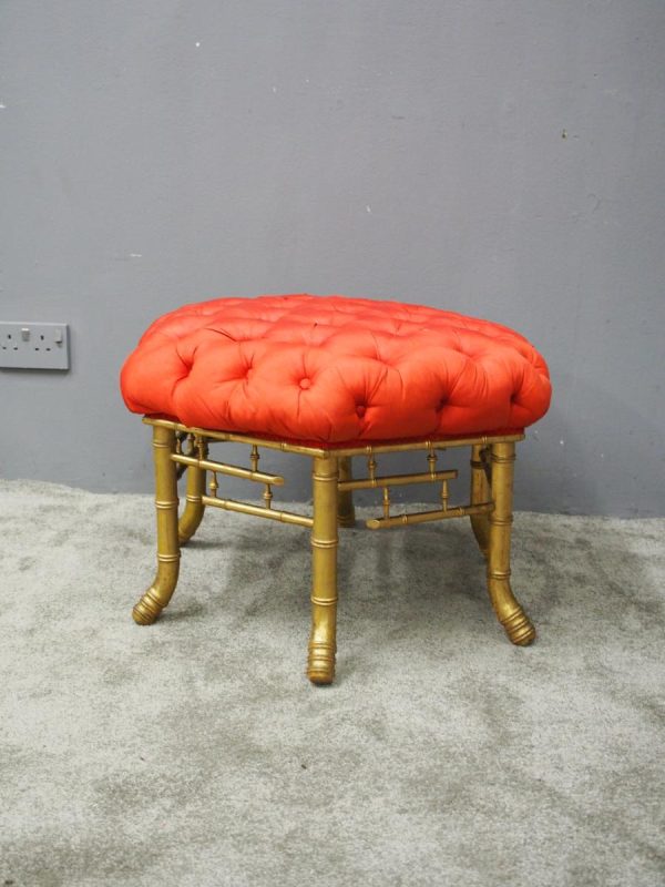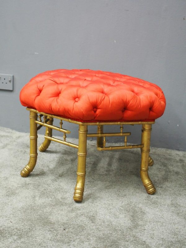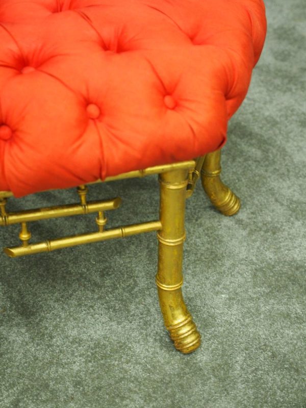 Circa 1870, French red silk, tufted, deep button stool. The elaborate upholstered top is on a gilded faux bamboo frame and is supported by a faux bamboo stretcher. Underneath is an original makers label.