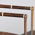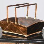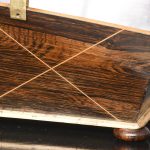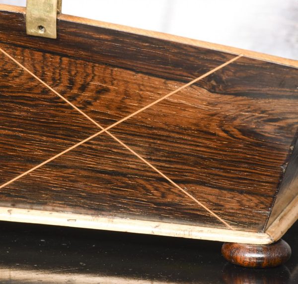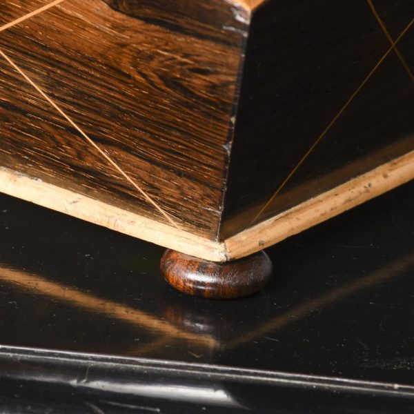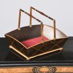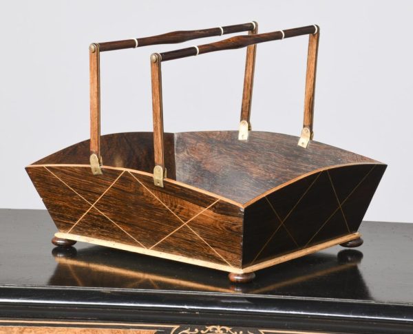 Circa 1870. A French rosewood sewing basket, shaped body with boxwood inlay, trellis style with string inlay to the sides. A pair of lifting handles in rosewood with ivory held in place by brass stays. The uprights of the sewing basket are flattened with boxwood inlay on the top, tapering sides with geometric inlay and the whole piece stands on four squat bun feet.