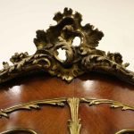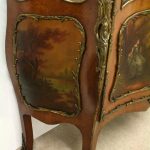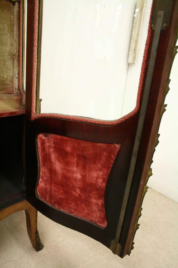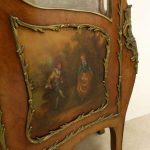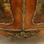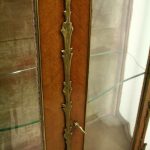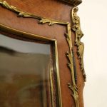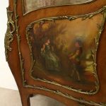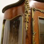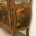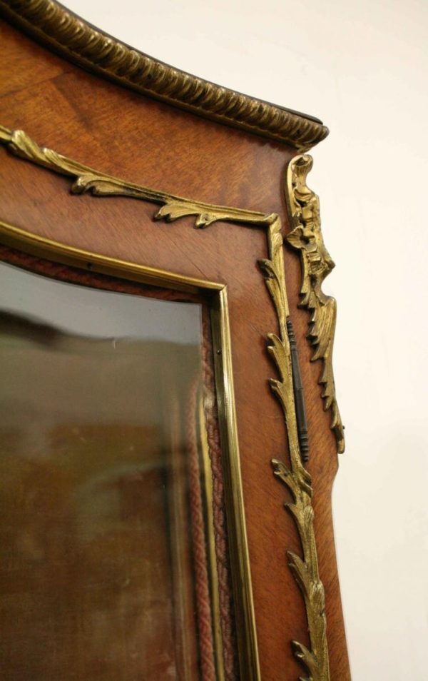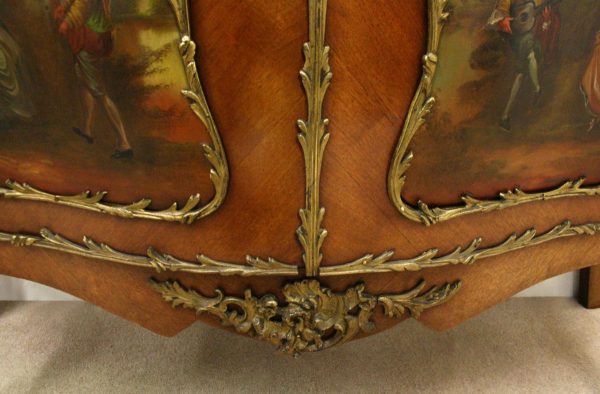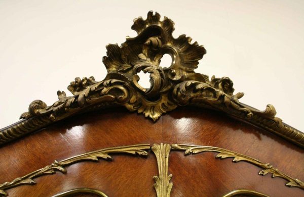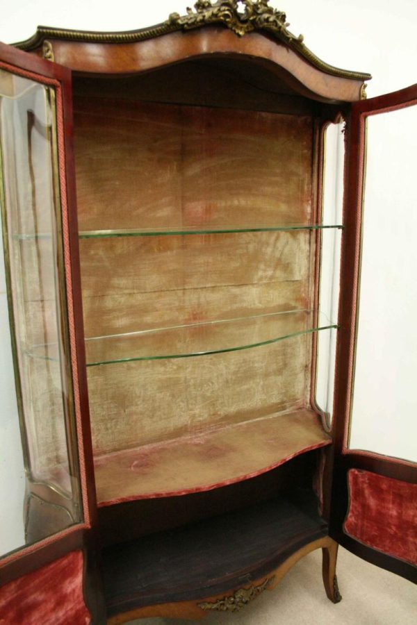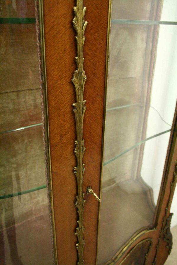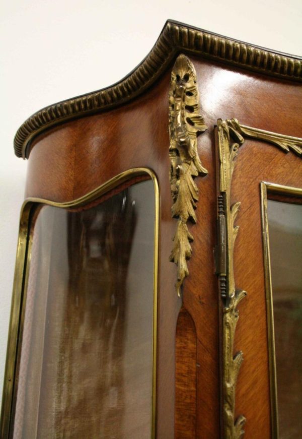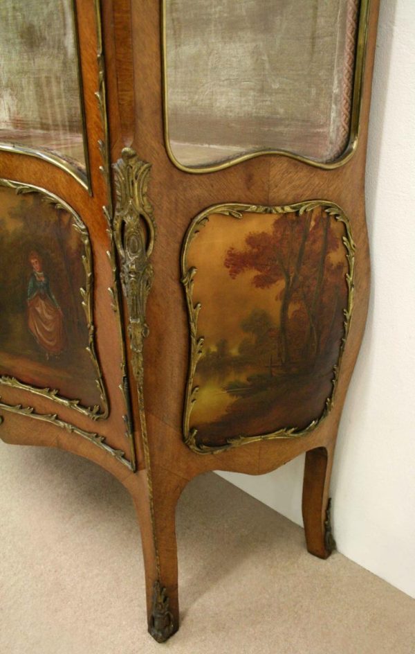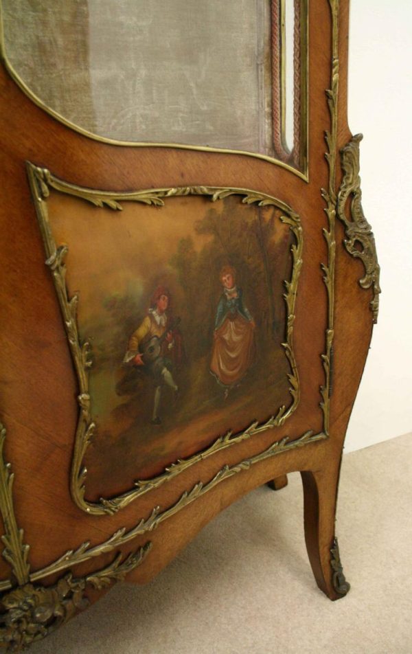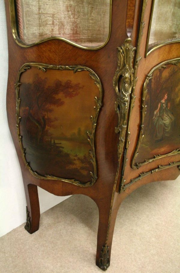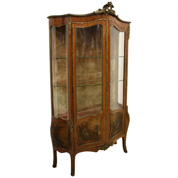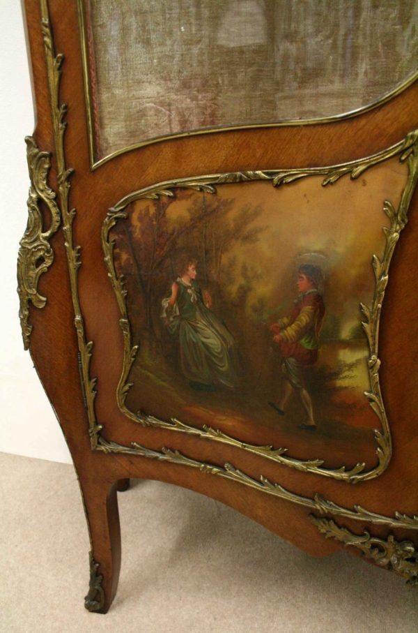 Circa 1870, French serpentine fronted cast brass and gilded Vernis Martin cabinet. With cast brass and gilded pediment that has Rococo casting and open fretwork, leading on to the shaped brass moulding above the cabinet doors. The two doors have glazed, serpentine glass and open to reveal glass shelves to the top and the back and bottom shelf are lined in velour. The serpentine shaped doors have a foliate, gilded bezel and beneath this are two painted panel, one bombe shaped. The paintings depict children at play: a girl on a swing, a girl dancing to music. The dipped apron leads to ormolu mounts to the knees, and the legs finish in cast sabots.