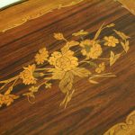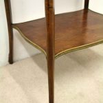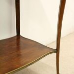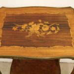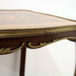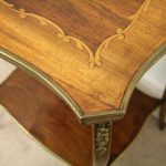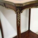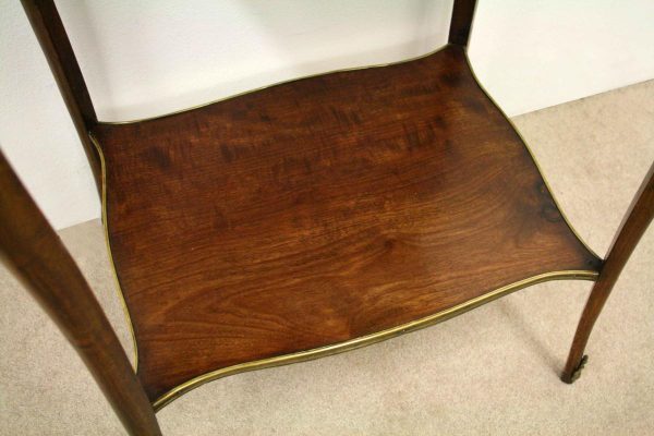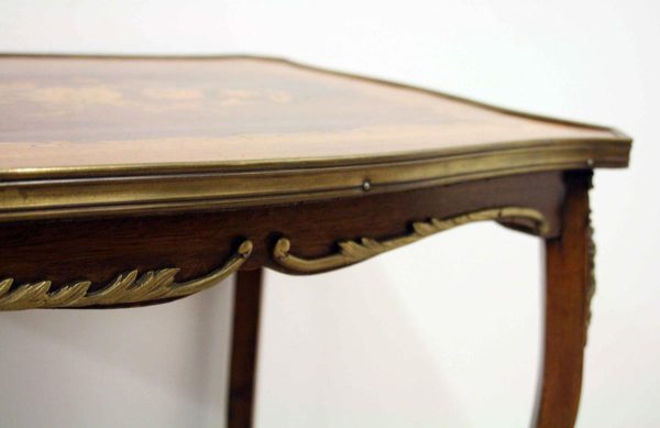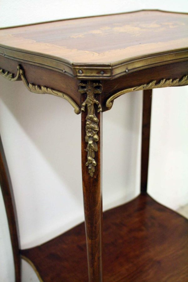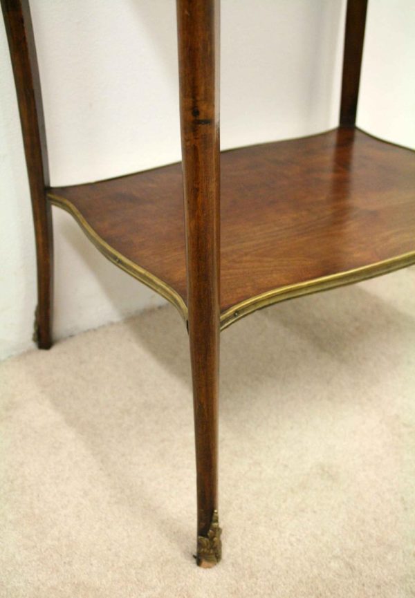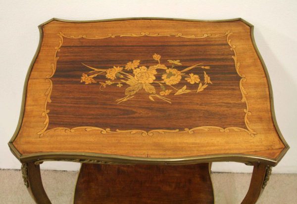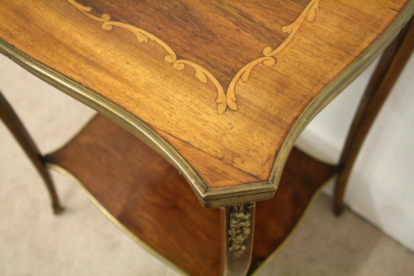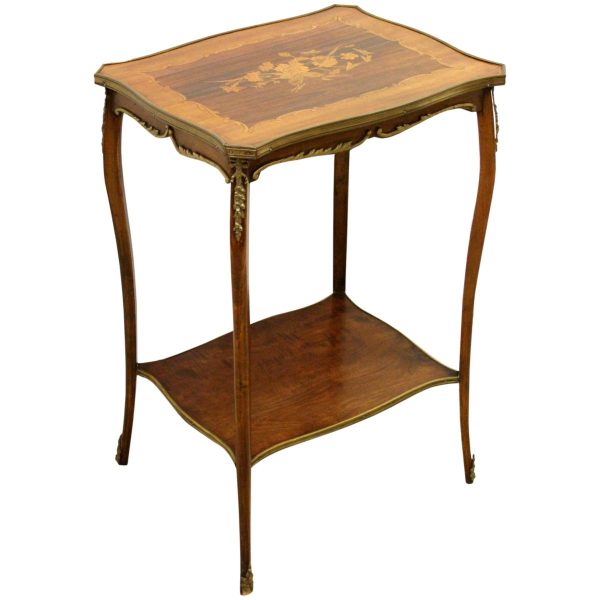 Circa 1900, stylish French shaped top occasional table. The table top is a mixture of walnut and rosewood with foliate marquetry in the centre and framed in a Rococo frame of satinwood, all contained in a cast brass moulded banding. Below this is a shaped apron with brass beading with foliate casting. Towards the bottom of the legs there is a tray which follows the same shape as the top without the marquetry but with a similar brass edge. At the top of the legs there is foliate castings which taper down the top of the leg and the legs are simple and elegant, finishing with small cast brass sabots. The table is a neat size, clean and sturdy.