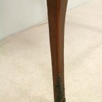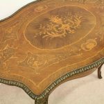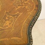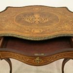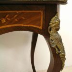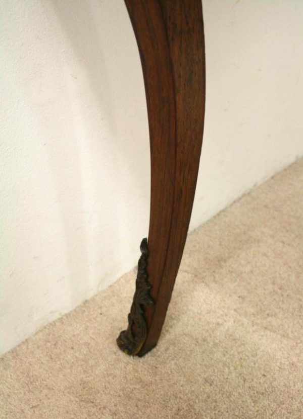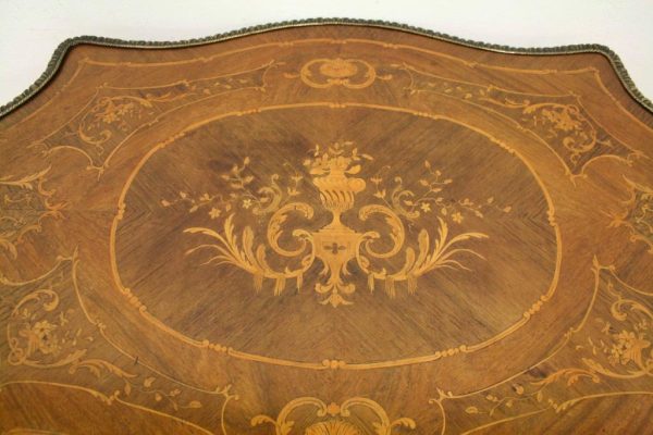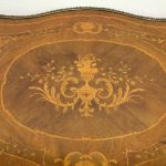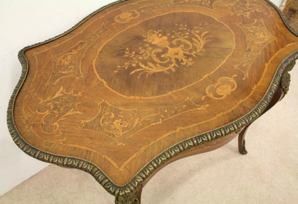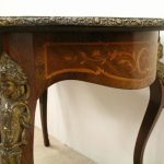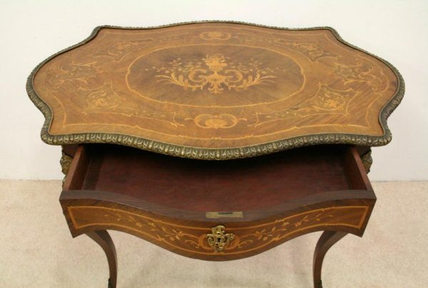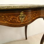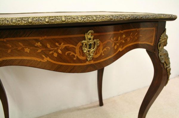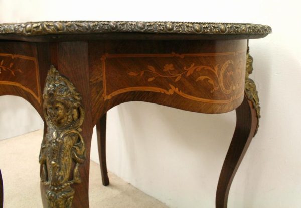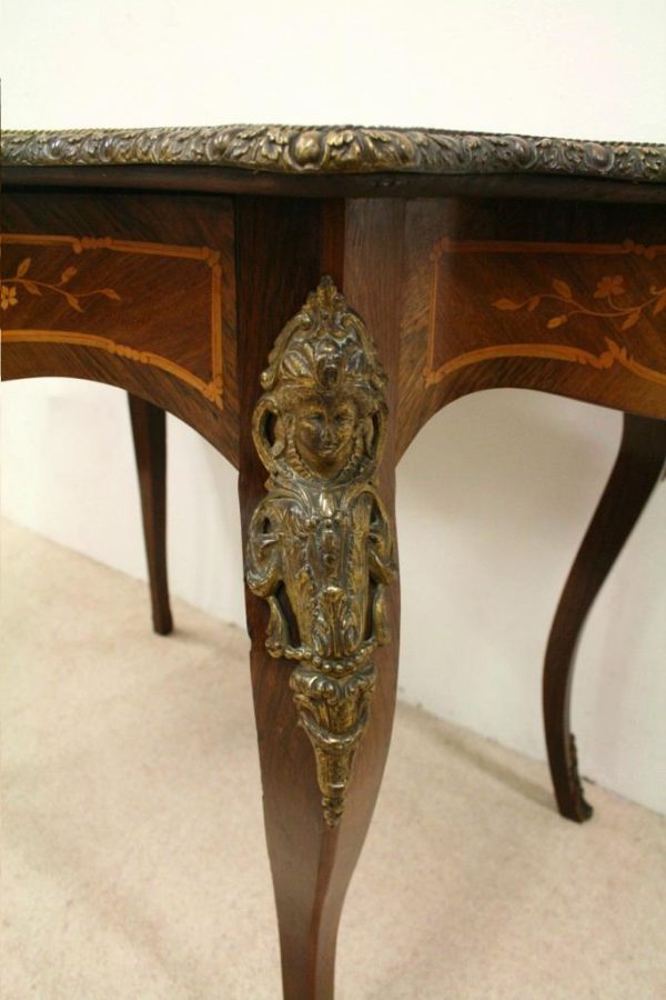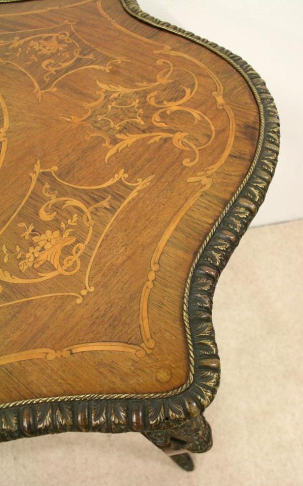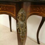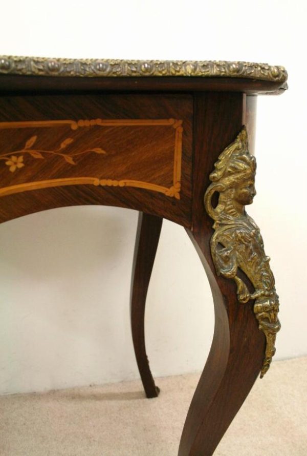 Circa 1880, fine marquetry inlaid walnut window table in the French taste with ormolu mounts of caryatid figures and a single serpentine drawer.