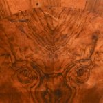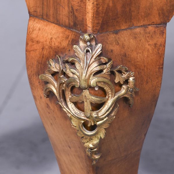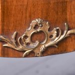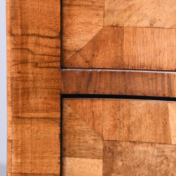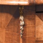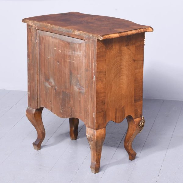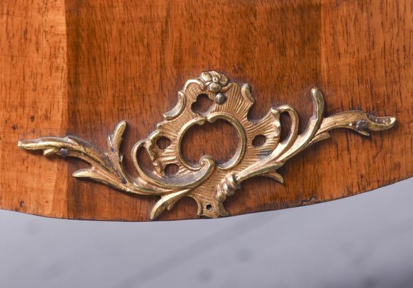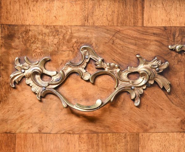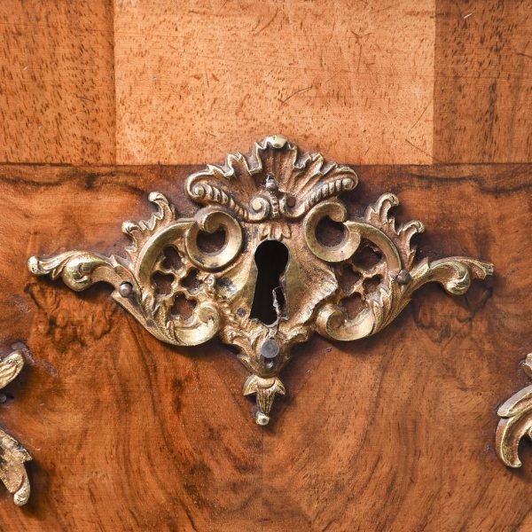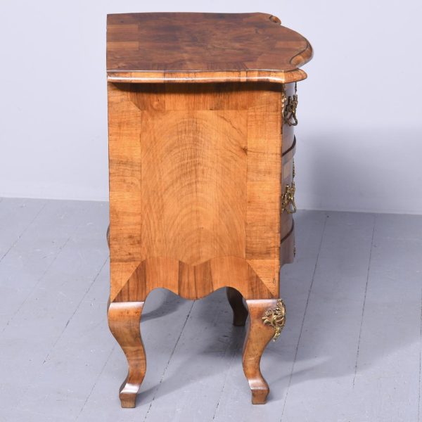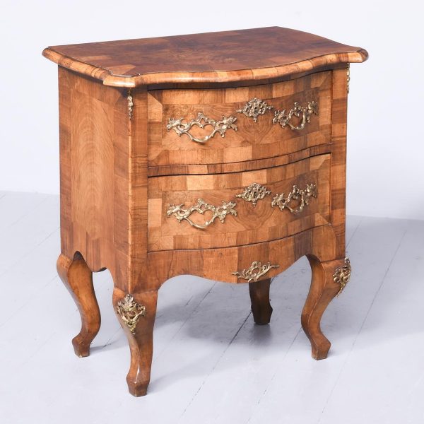 Circa 1870. A French walnut serpentine shape commode. The top in book matched walnut veneers and broad cross-banding, with a lovely moulded fore edge and a configuration of two full length bow fronted drawers, each of the drawers with a stylish pierced brass and gilded escutcheon and a fine pair of rococo handles. The drawers have similar veneering as the top, the chest has a rounded fore edge with small brass mounts on the top, polished gables with broad cross-banding, a shaped frieze and legs with brass mounts, all resting on four simple cabriole legs.