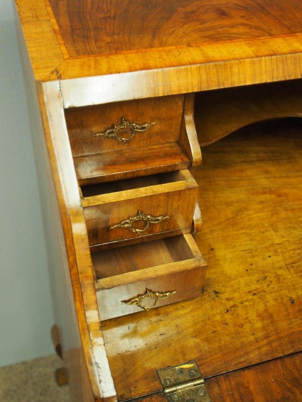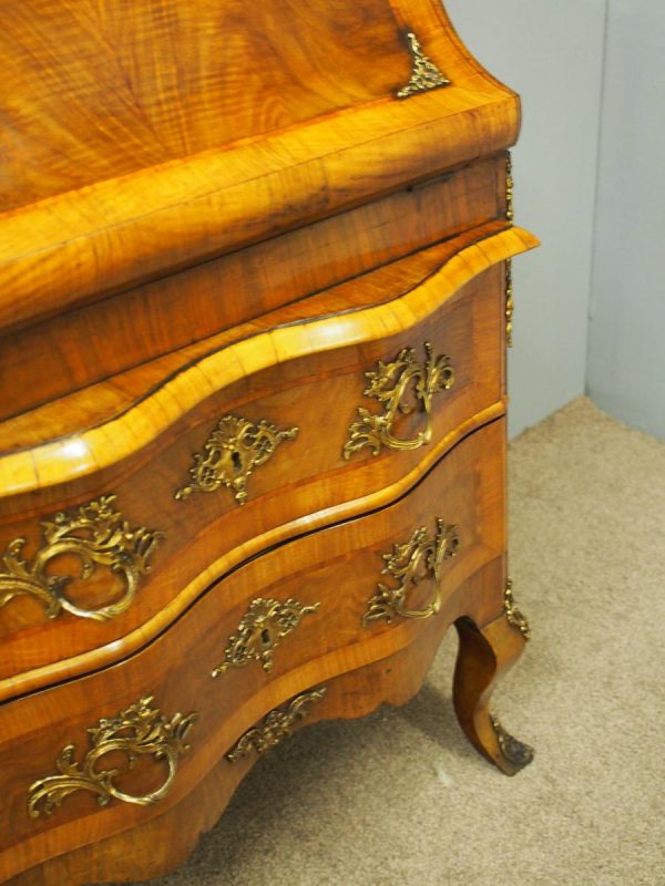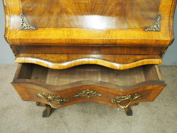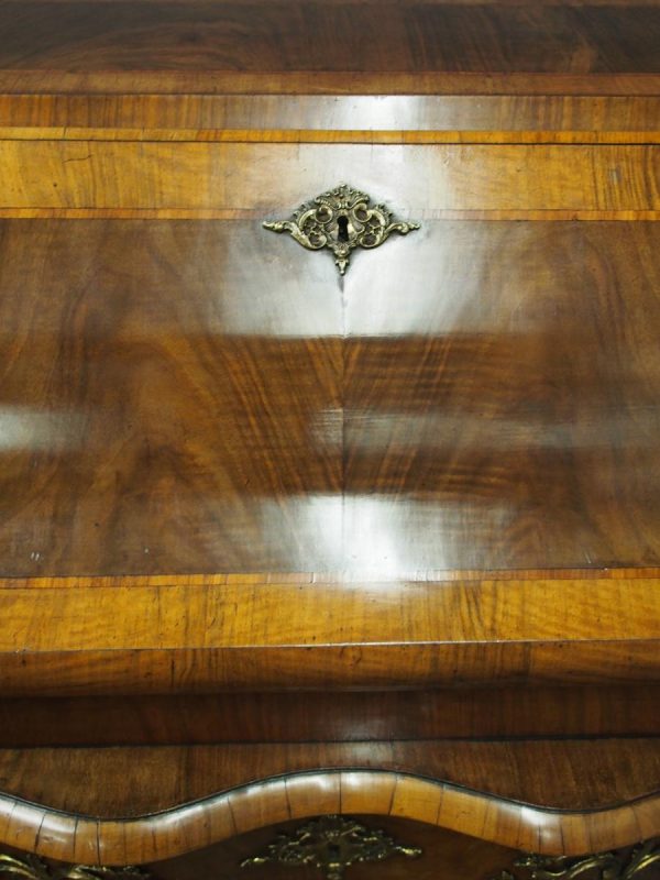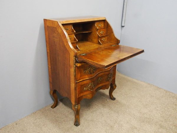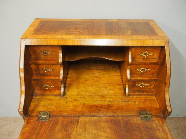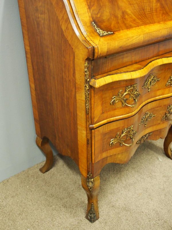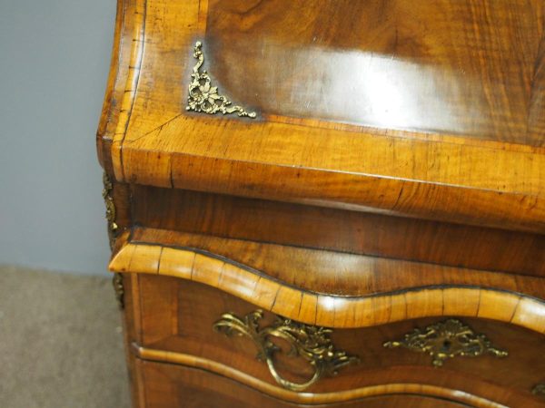 Circa 1870, French walnut and kingwood ormolu mounted bureau. With top in walnut with kingwood banding, it has a bombe shaped flap with cast brass escutcheon. Inside it is fitted with various drawers with gilded Rococo handles, and beneath are serpentine shaped drawers. The gables are cross banded, and the cabriole legs have cast and ormolu sabots beneath.