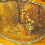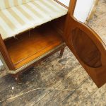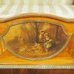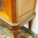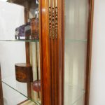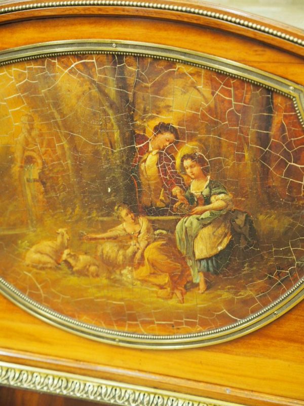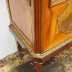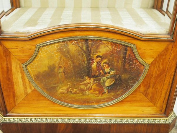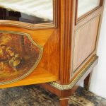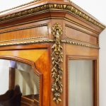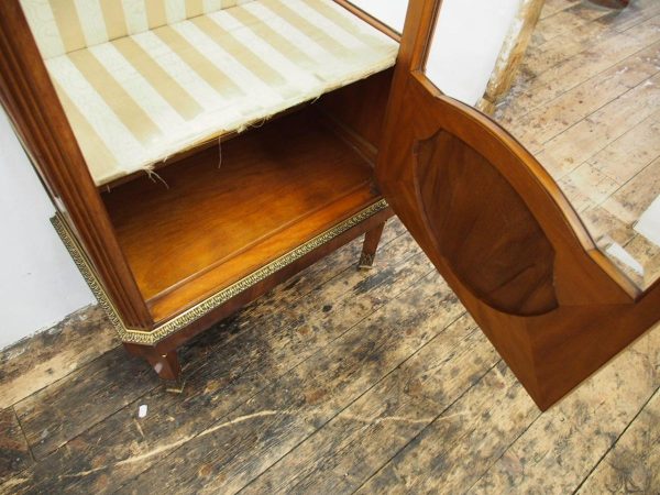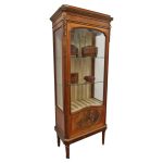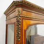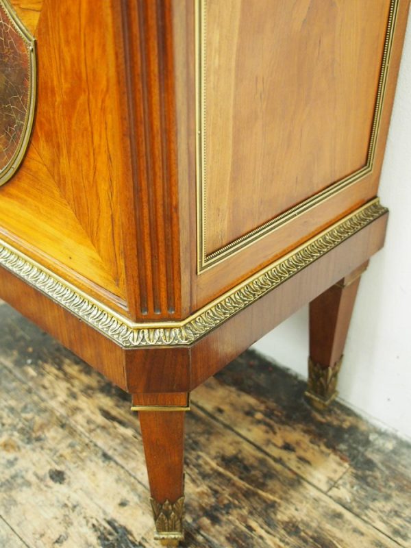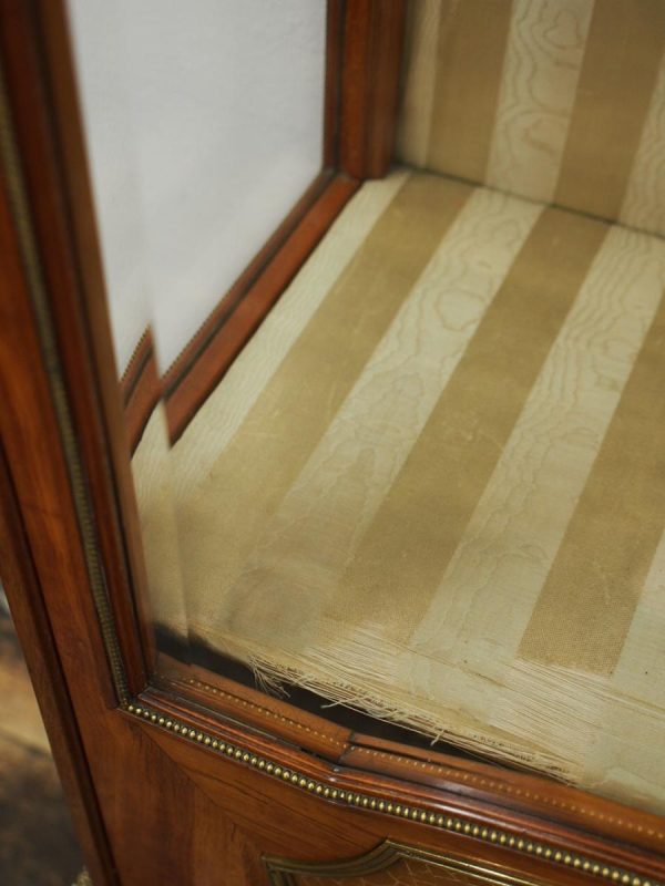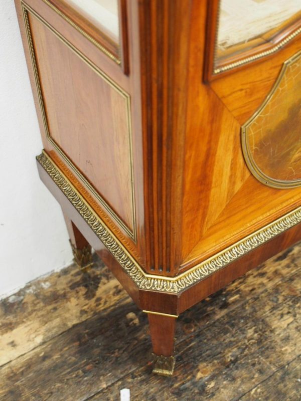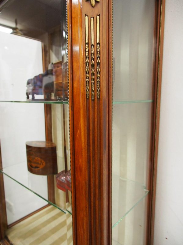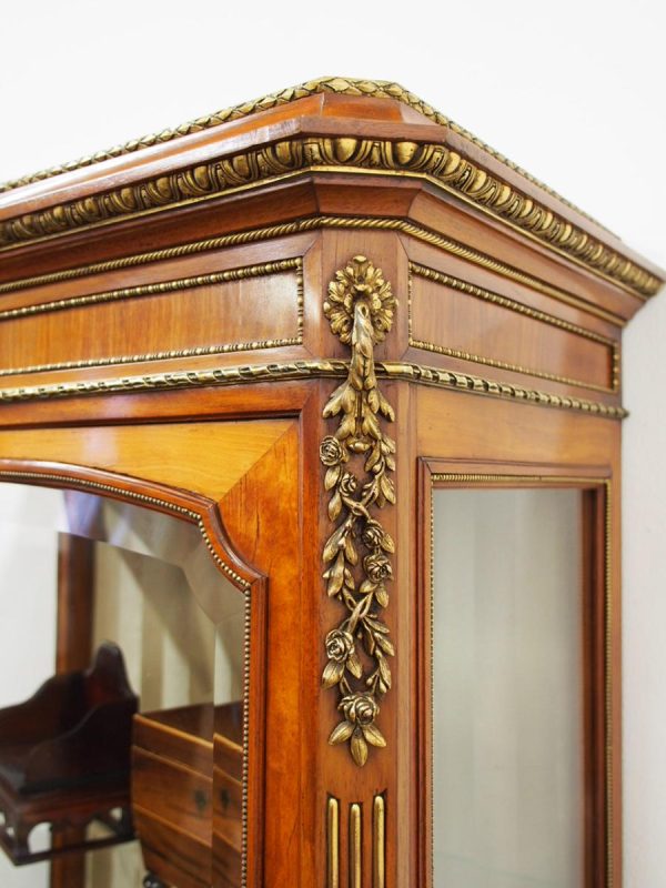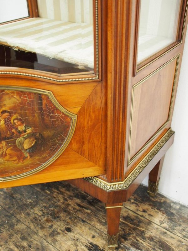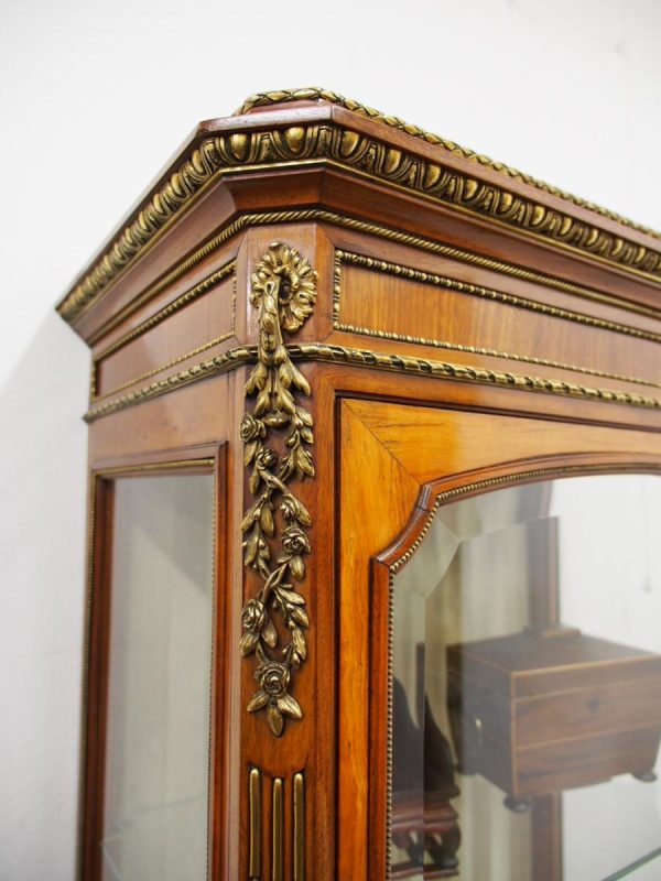 Circa 1870, French walnut display cabinet. The top features a simple frieze, shaped cornice and neoclassical style ormolu mounts. The canted sides are surmounted by ormolu garlands and fluted decorations with ormolu infills. It has a single door with shaped, bevelled-edge glass, above a vernis martin panel with a pastoral scene. The base of the cabinet has a simple skirt with ormolu mounts, and it all stands on tapered, square supports with foliate style ormolu feet.