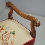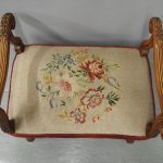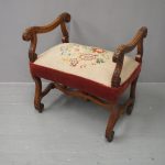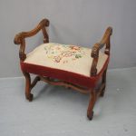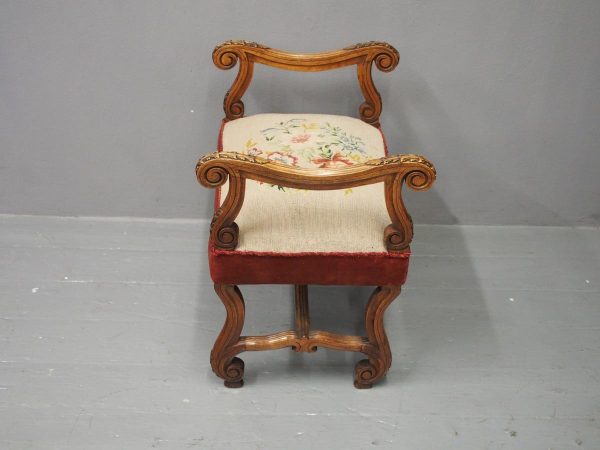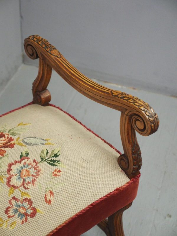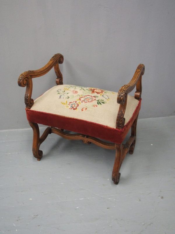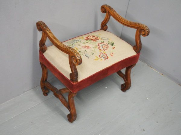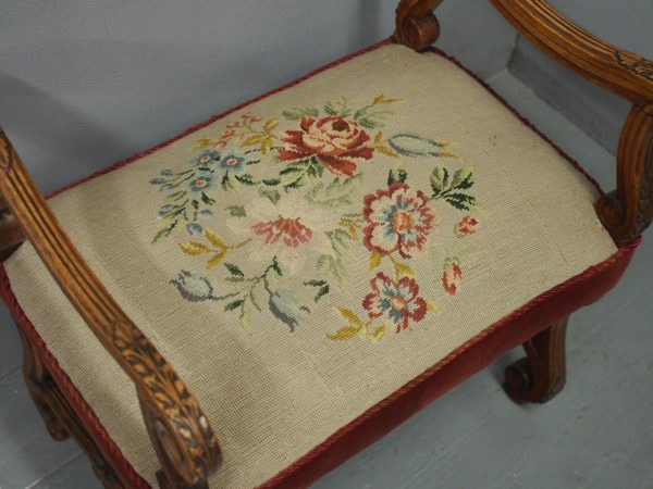 Circa 1880, an unusual French walnut window seat. With shaped, moulded and carved arms with scrolling ends and acanthus leaves, held in place by shaped uprights with similar carving. The large stuff-over seat (recently reupholstered) with needle point piped edge and velvet, over a shaped base on scrolling cabriole legs with slight raised toe with acanthus leaves, united by a shaped stretcher.