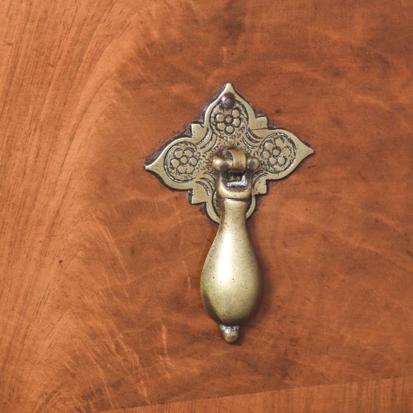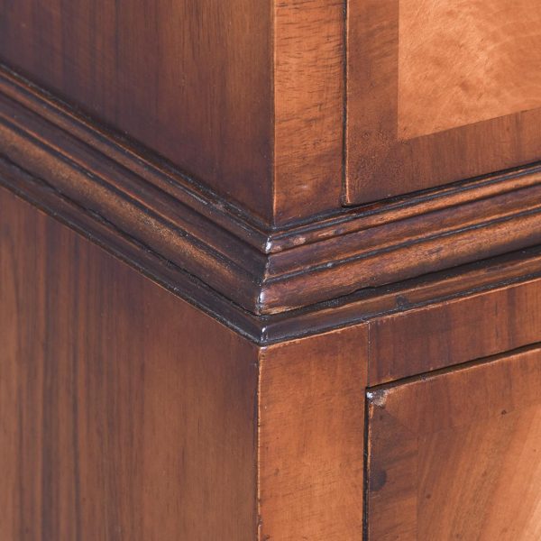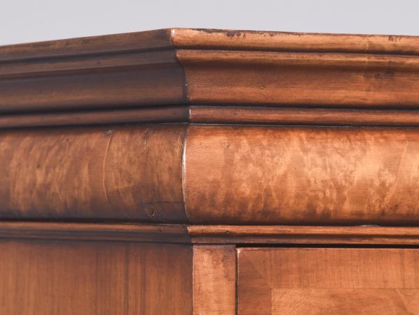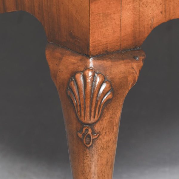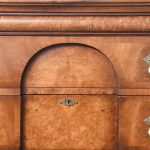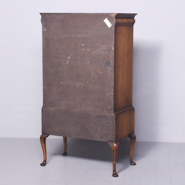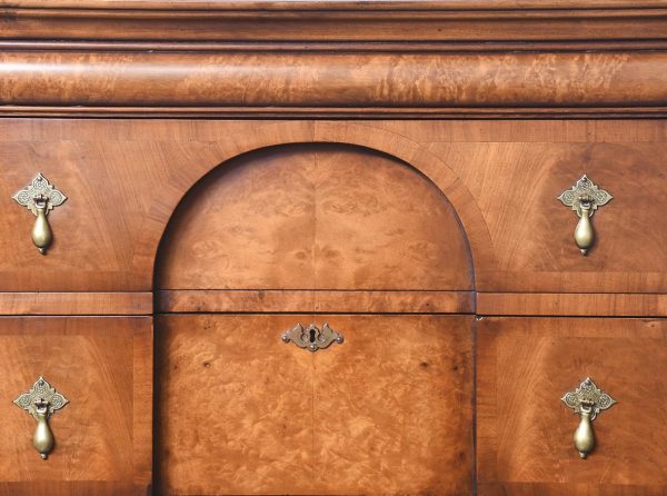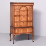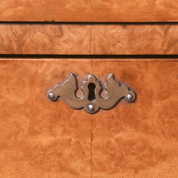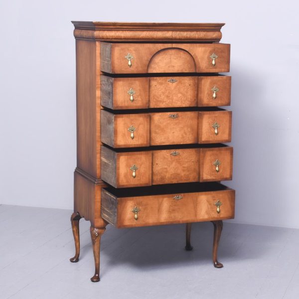 Circa 1910. George II style burr walnut chest on stand. The rectangular polished top over a burr walnut moulded frieze. The 4 shaped-front drawers on the upper part with solid oak linings and burr walnut centres forming an arch with early Georgian-style brass drop handles and cut escutcheons. The base with a matching cross banded drawer. All supported on short cabriole legs with shell carved knees and pad feet.