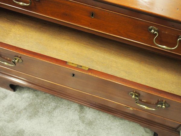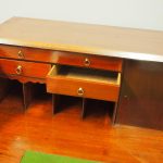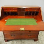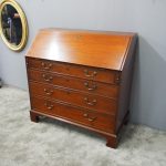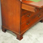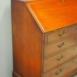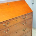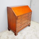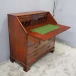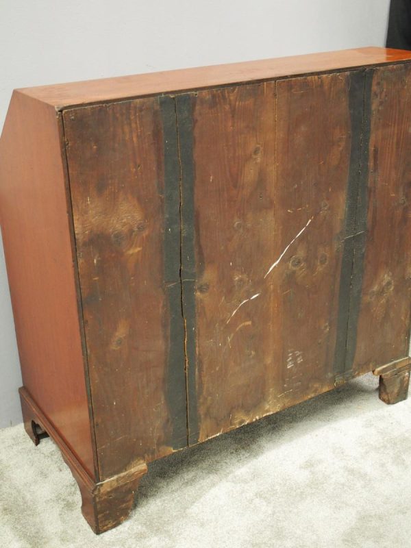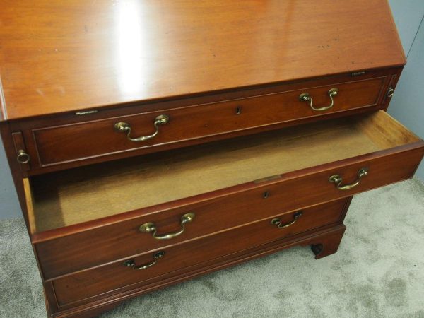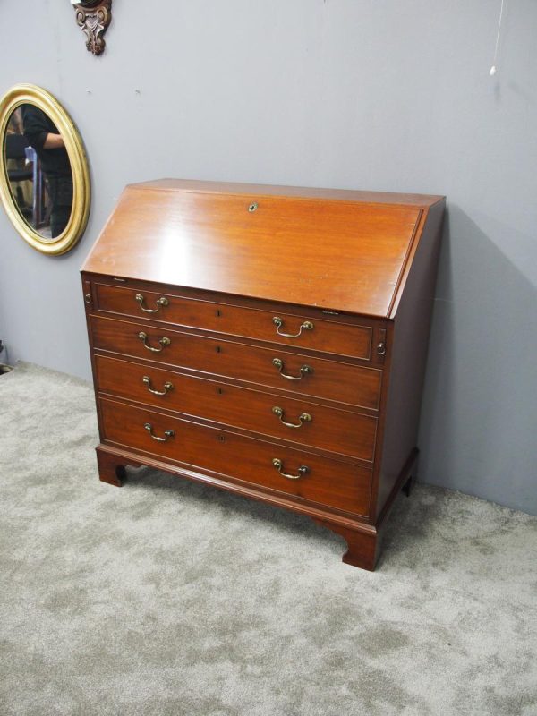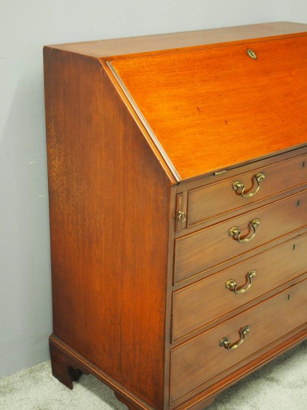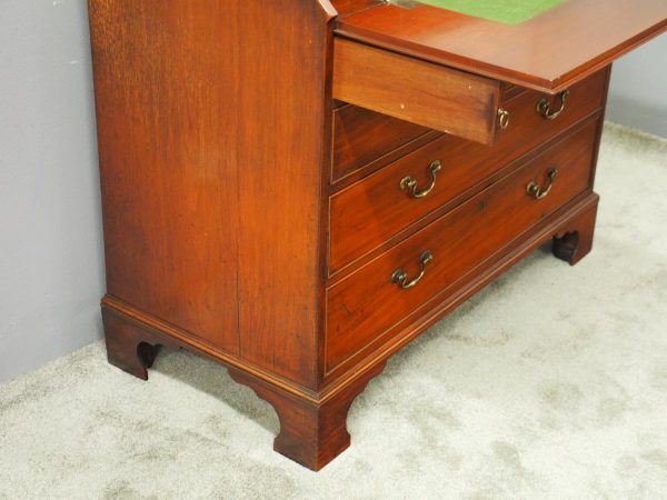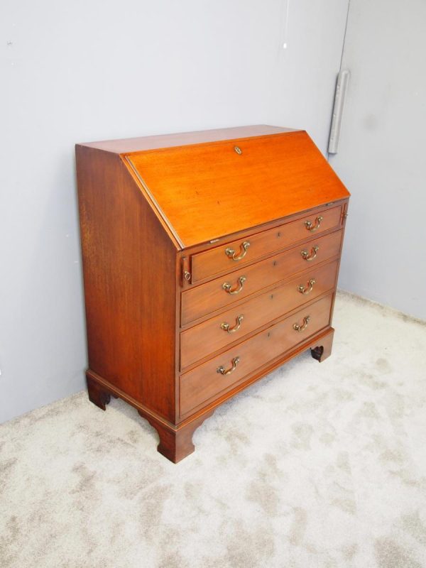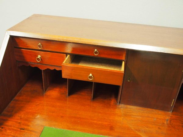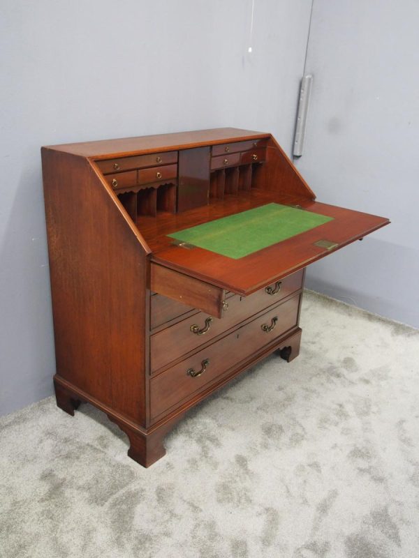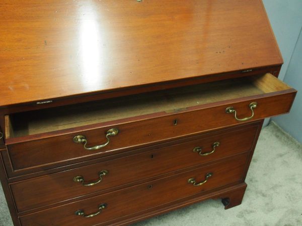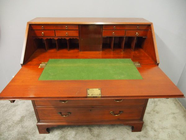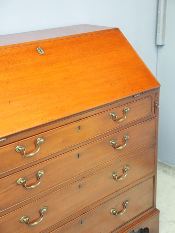 Circa 1775, George III mahogany bureau. The interior has fitted pigeonholes, banks of drawers and cupboard over 4 graduated drawers. These have the original brass swan neck handles and escutcheons, and it is all standing on original bracket feet.