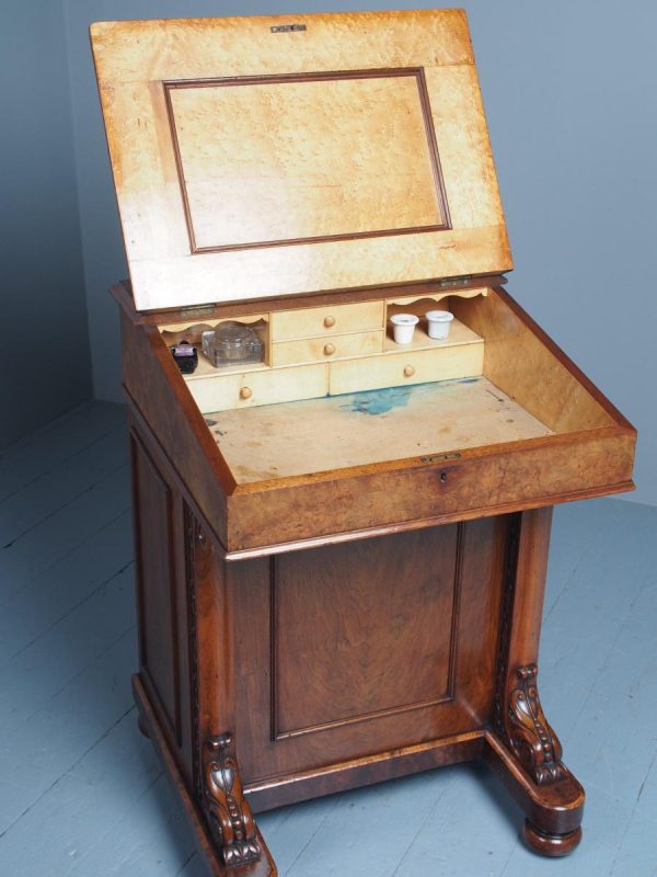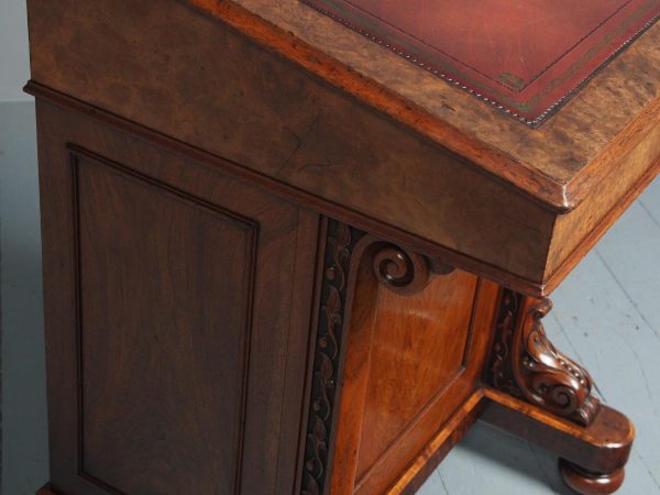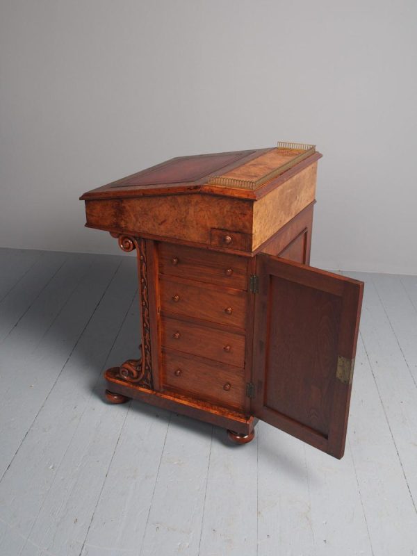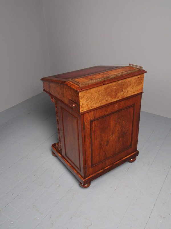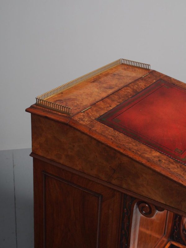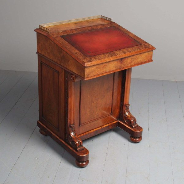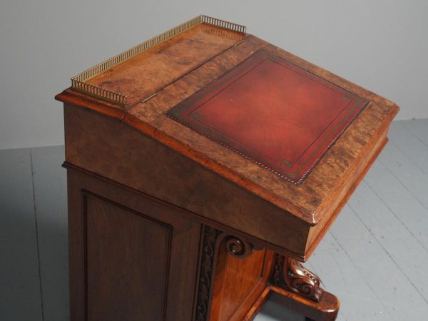 Circa 1840, exhibition quality, early Victorian burr walnut davenport desk. The back with an open brass gallery and in a finely figured walnut, over a flap with burgundy embossed hide writing surface. This opens to a birds eye maple interior with locking and secret drawers, and the side has a beaded panel door, opening to 4 graduated drawers with finely turned knob handles. The front with foliate carved buttresses, all supported on a shaped platform base over neat bun feet with hidden brass castors.