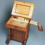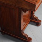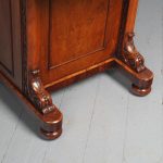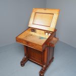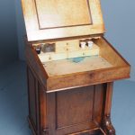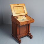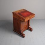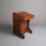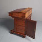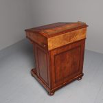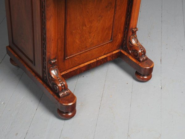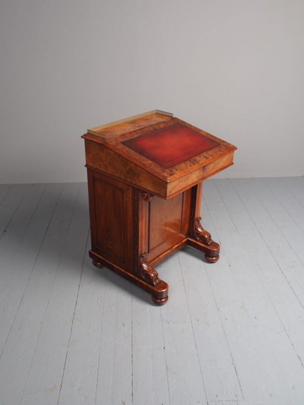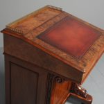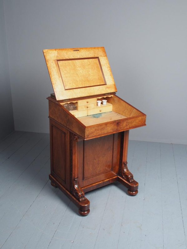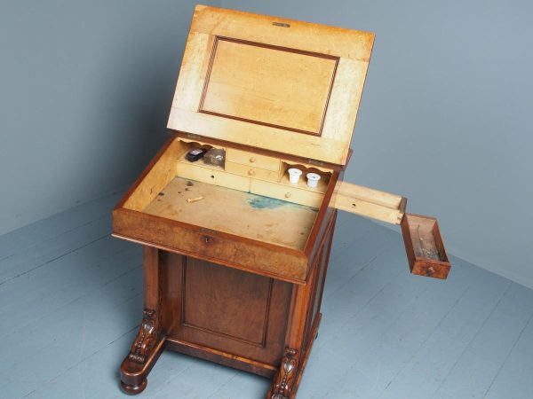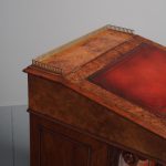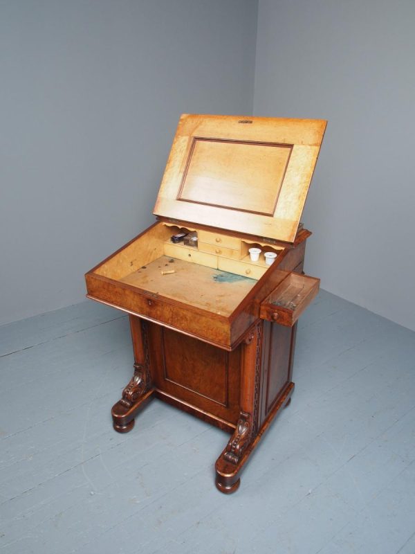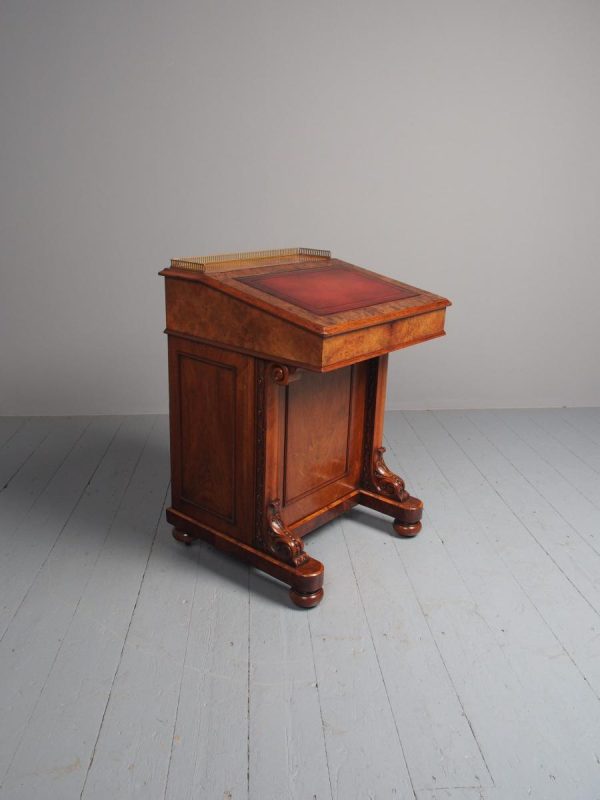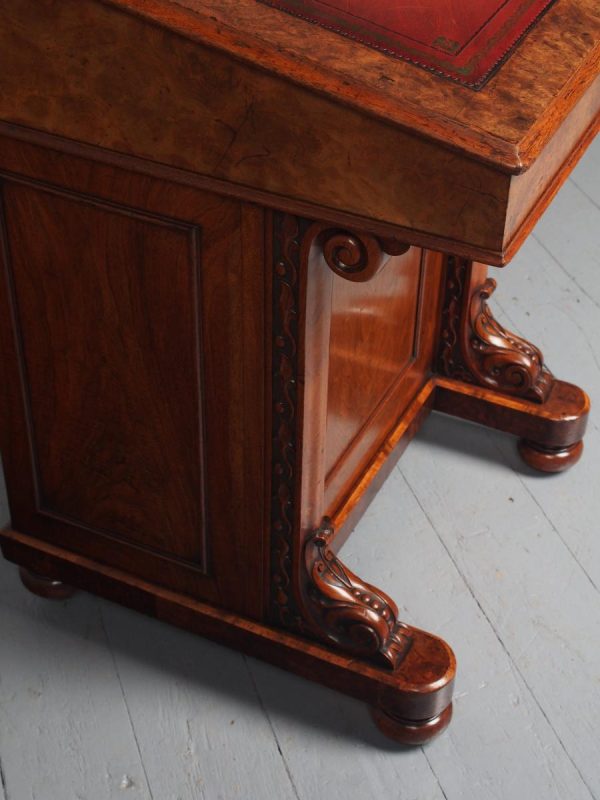 Circa 1840, exhibition quality, early Victorian burr walnut davenport desk. The back with an open brass gallery and in a finely figured walnut, over a flap with burgundy embossed hide writing surface. This opens to a birds eye maple interior with locking and secret drawers, and the side has a beaded panel door, opening to 4 graduated drawers with finely turned knob handles. The front with foliate carved buttresses, all supported on a shaped platform base over neat bun feet with hidden brass castors.