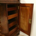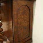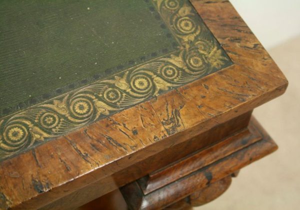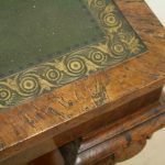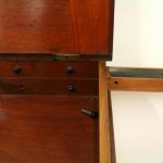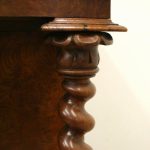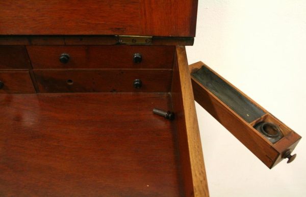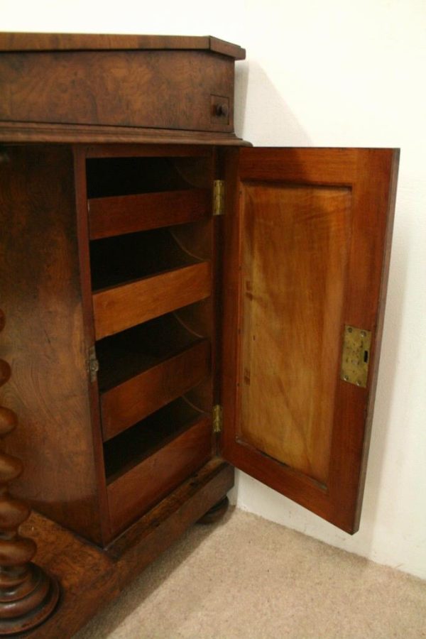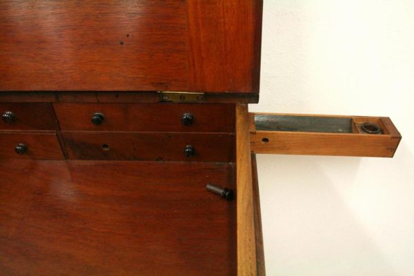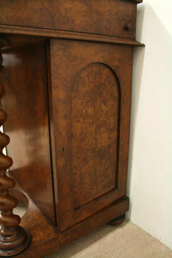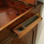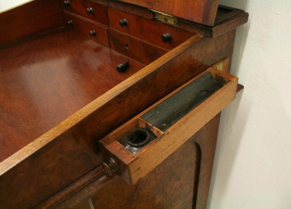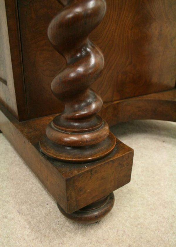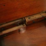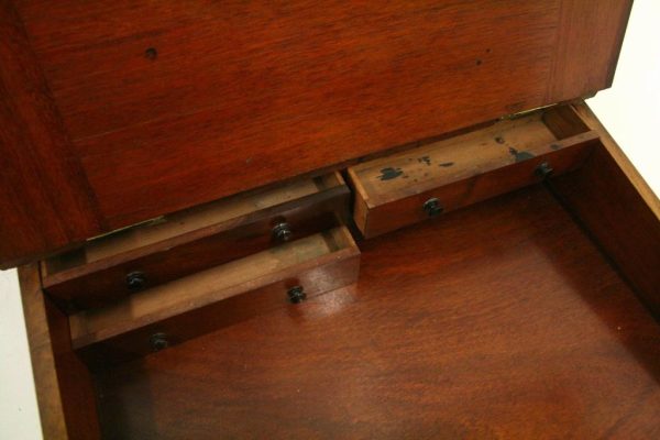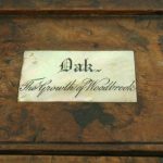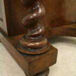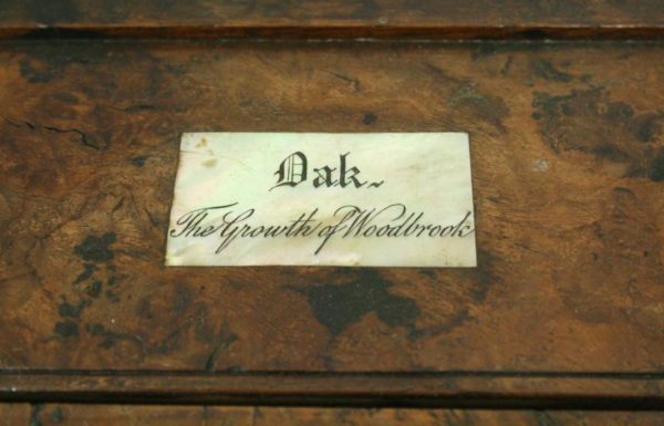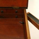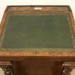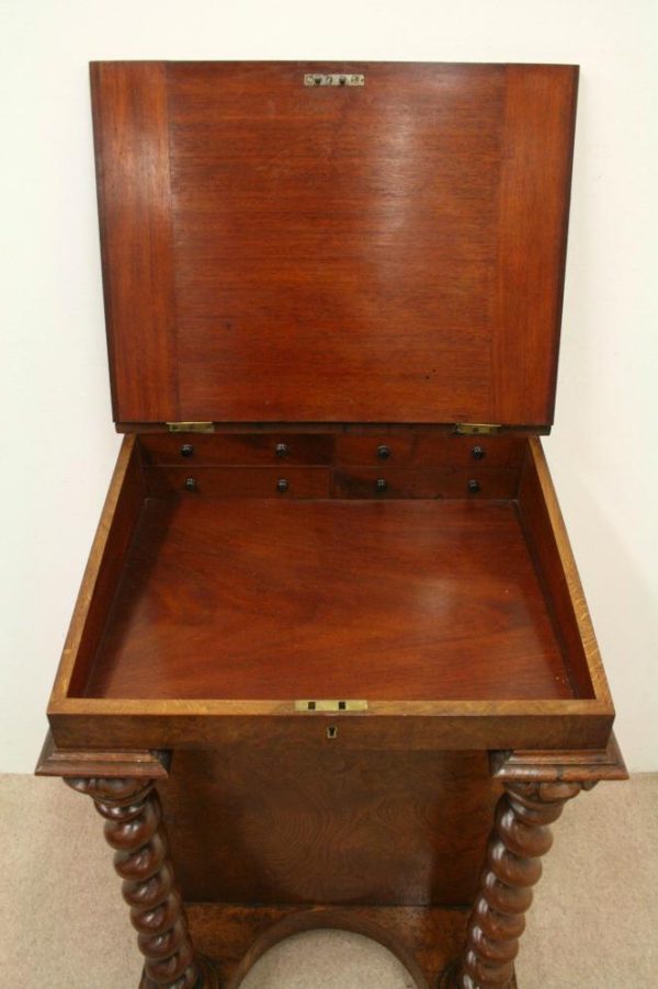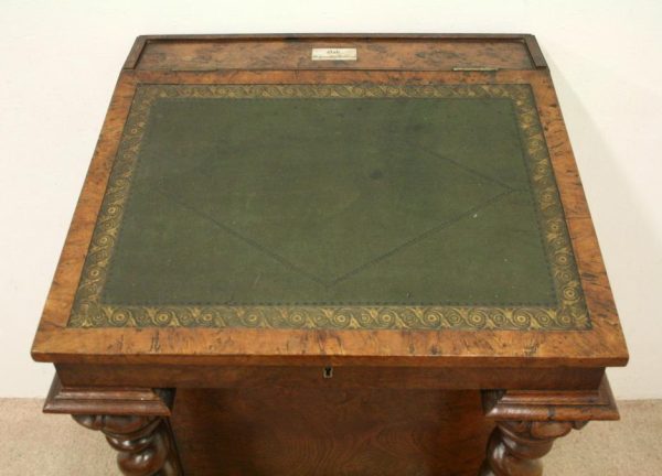 Circa 1870, unusual Victorian pollard oak davenport. The top has a mother of pearl inlay on the flat section – stating ‘Oak, The Growth of Woodbrook‘. The slope has an unusual green leather writing surface which is tooled, gilded and has a nice pattern on it. This is hinged and opens to reveal a mahogany interior with three various drawers and one dummy drawer. Each of the drawers has ebonised knob handles. On the dummy drawer, one of the handles pulls out to release a pen slide on the side. The front section has two large turned barley sugar columns with stylish capitals at the top and rounded bases. On each side are arched panels, the right hand side one is a door and opens to reveal a section of four slides all made in mahogany. The back of the davenport has matching pollard oak veneers and beneath this is a rectangular apron which runs all around. The whole piece finishes on four squat feet with porcelain and brass castors beneath. Unusual piece of Victorian furniture, very stylish and good quality.
