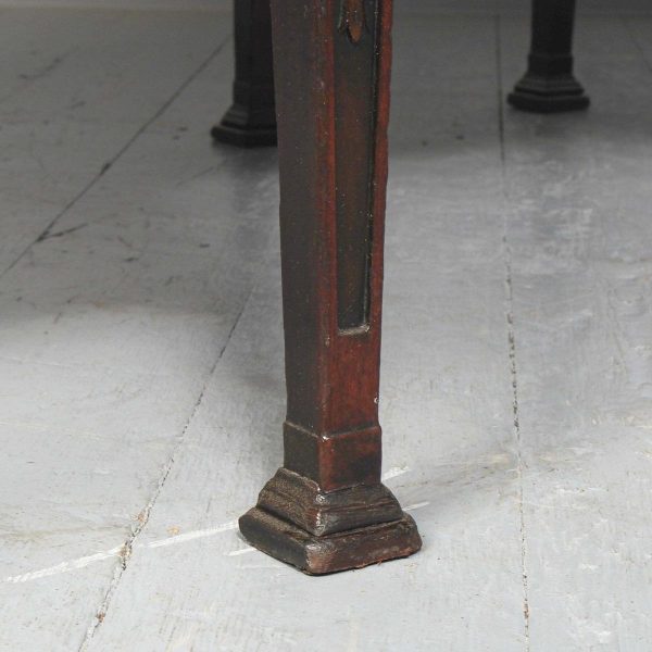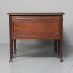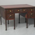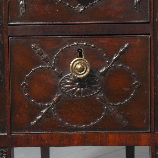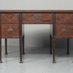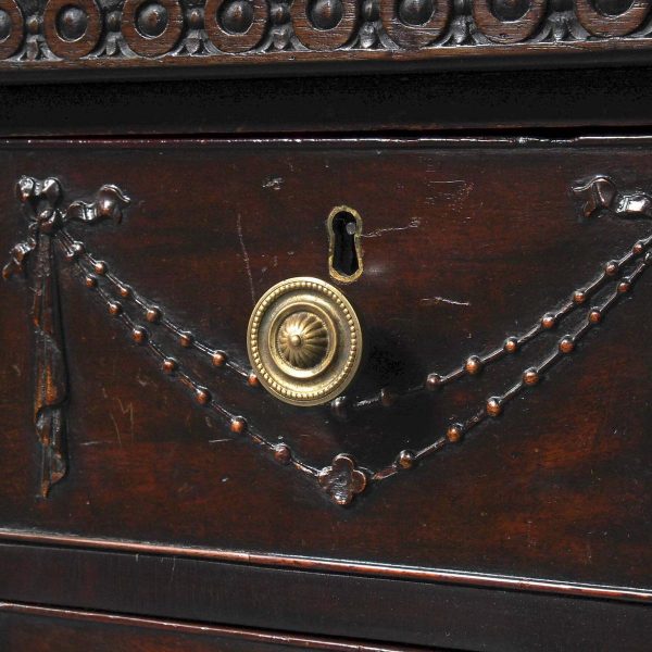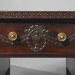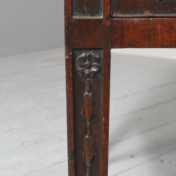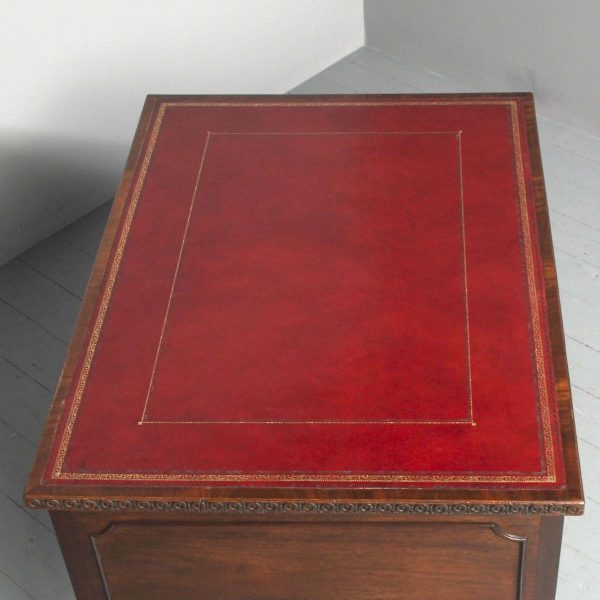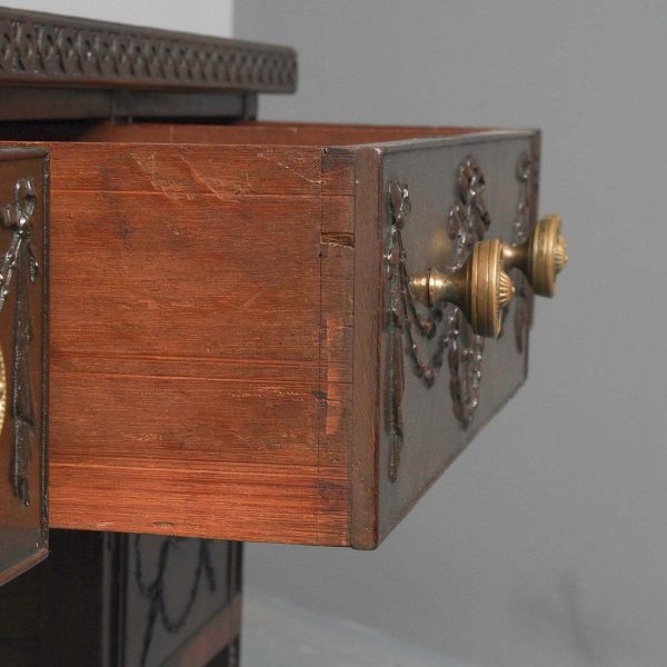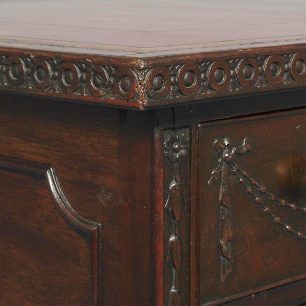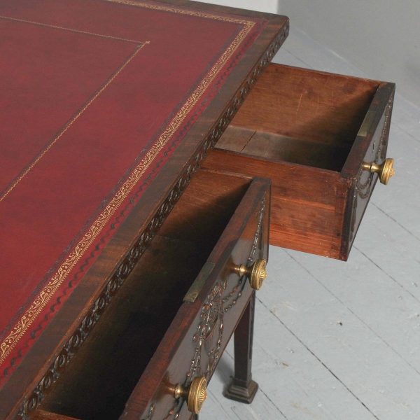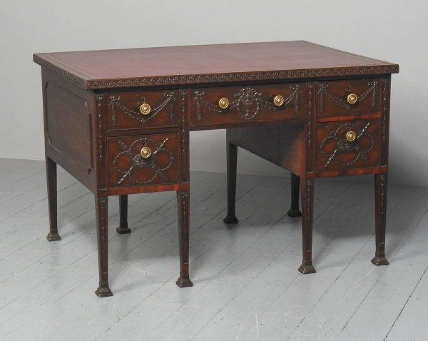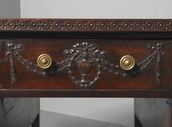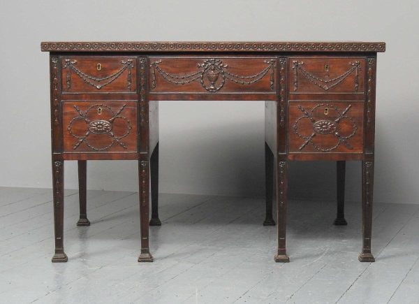 Circa 1790, rare Georgian period Adams style desk/writing table. The rectangular top with crossbanded edges and a quality gilt-tooled burgundy hide writing surface, above Neoclassical carved fore-edges. The 3 frieze drawers with fine urn, garland and pendant relief carvings, and the lower drawers also with oval paterae. The sides of the desk with panels and the back with matching faux drawers. Standing on tapering, square supports with inset bellflower pendants over squat stepped feet.