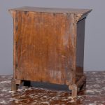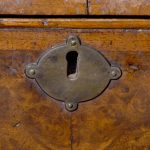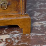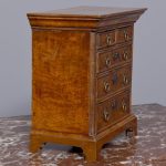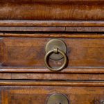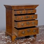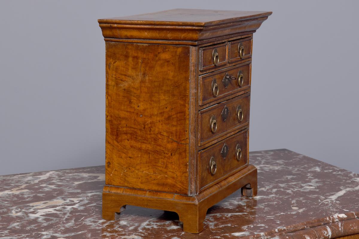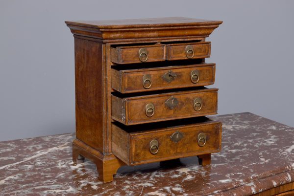 Circa 1790. A George I style walnut chest of diminutive proportions, the top in fine burr walnut framed with herringbone and broad banding, the front with stylish curved moulding, with a configuration of two short over three full length graduating drawers, each with a circular back plate and circular ring pull handle, the larger drawers with elegant escutcheon’s with working locks, all drawers lined in oak, beneath the bottom drawer there is a shaped moulding, all resting on four bracket feet.