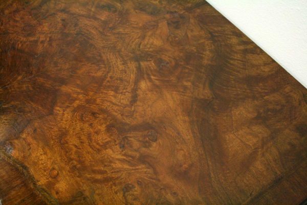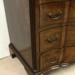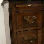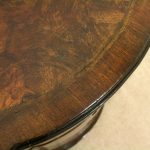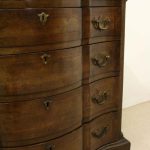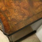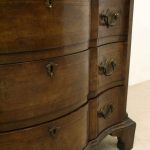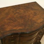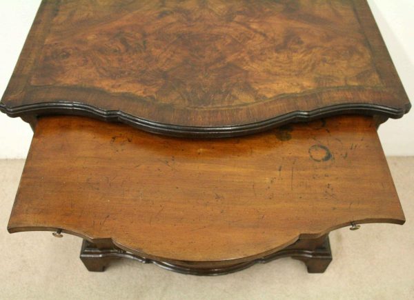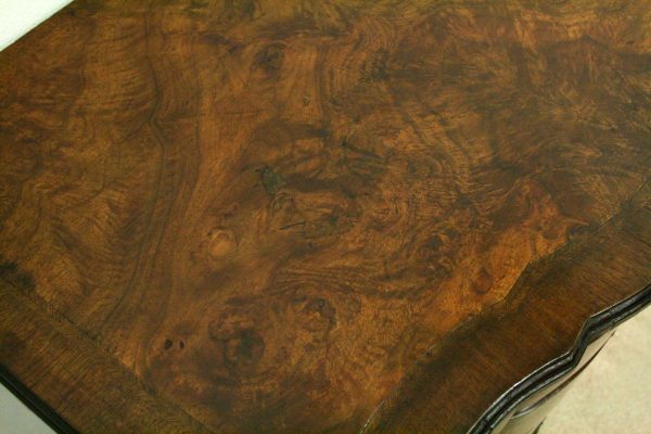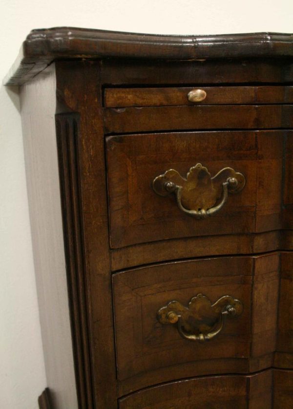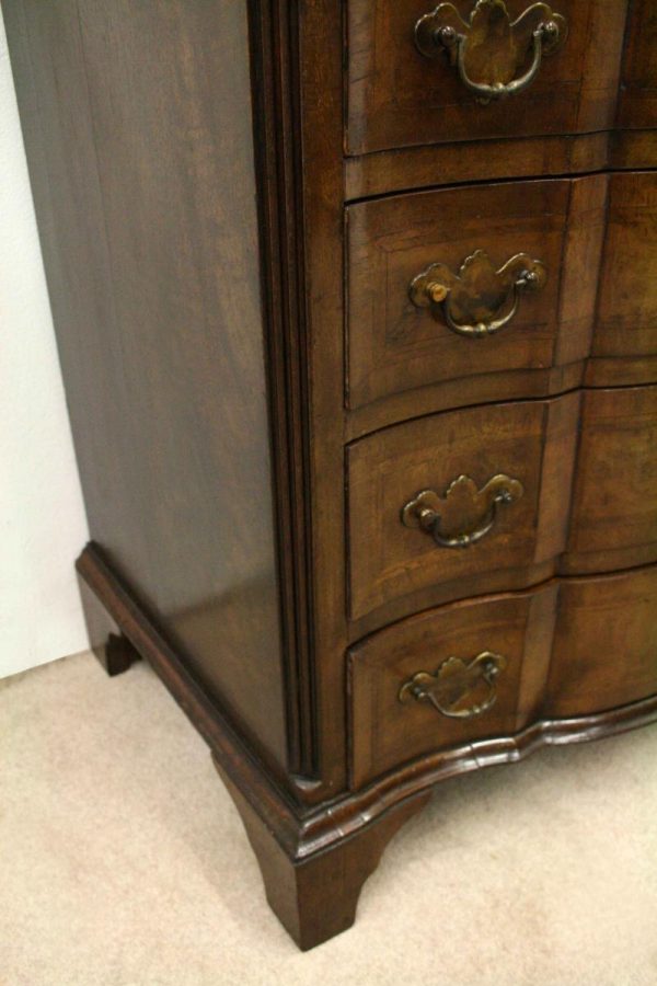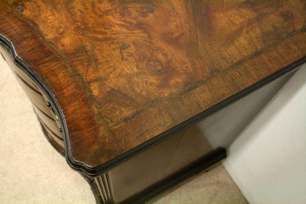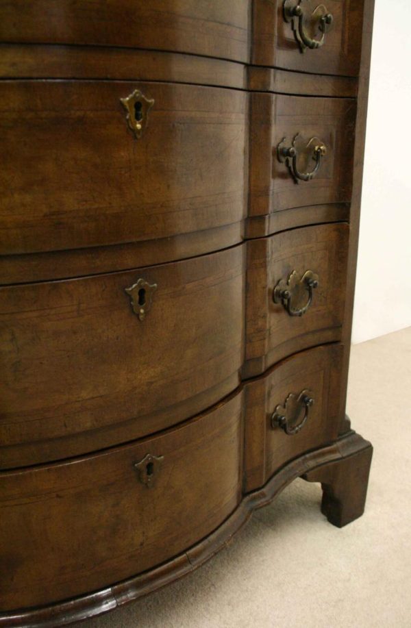 Circa 1880, George I style crossbanded and herringbone inlaid figured walnut chest of drawers, the serpentine top with moulded edge above a brushing slide and 4 long graduating drawers with fluted canted corners either side. The chest has solid oak liners and all stands on bracket feet.