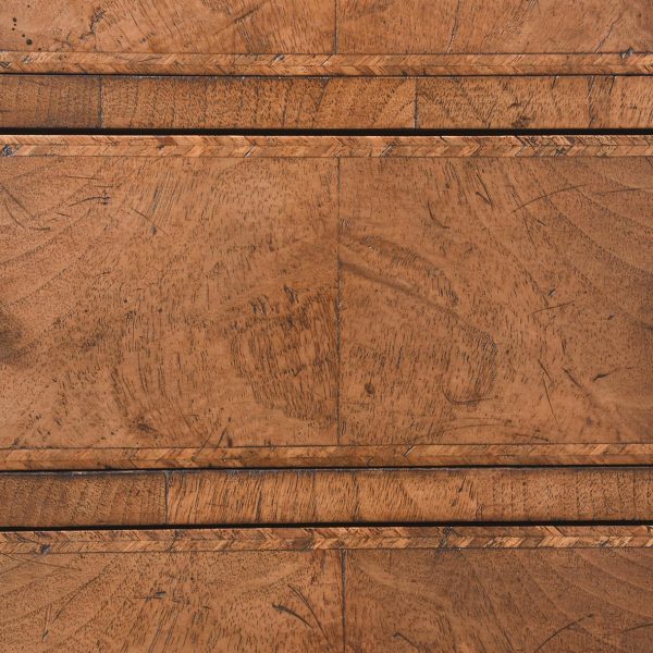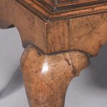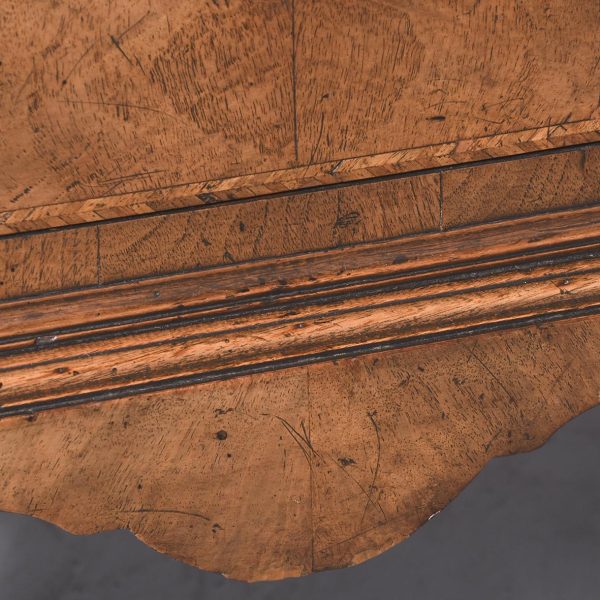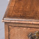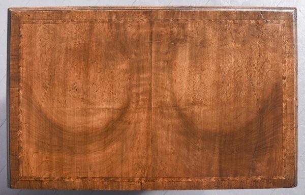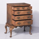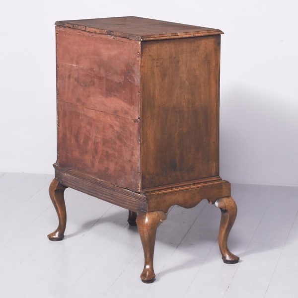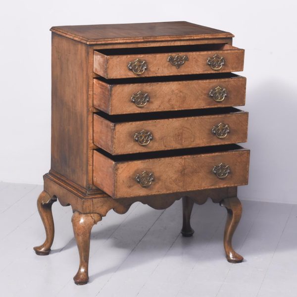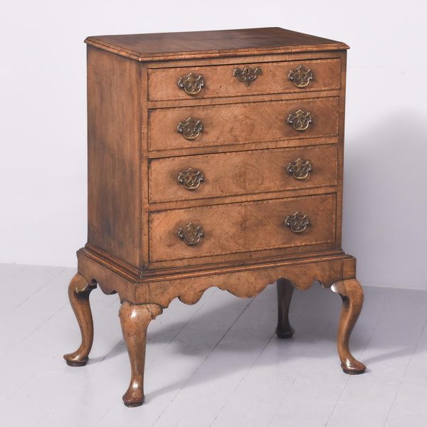 Circa 1880, neat-sized George I style walnut chest on stand. The rectangular top has mirror-matched, figured walnut veneers, herringbone inlay, cross banding and a moulded edge over 4 oak-lined, graduated drawers. These also have mirror matched veneers, herringbone inlay and cut brass period style handles and escutcheons. All standing on a neat stand with moulded top, a shaped apron and cabriole supports with pointed pad feet.