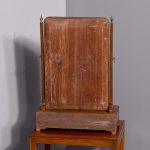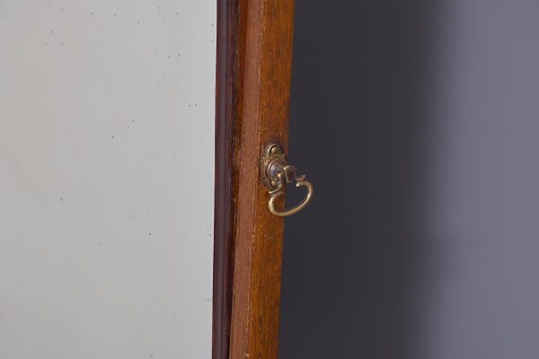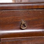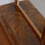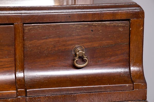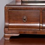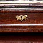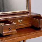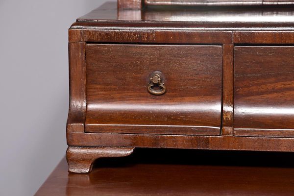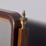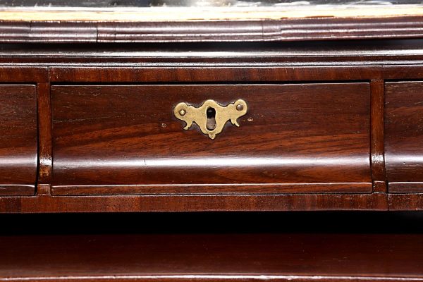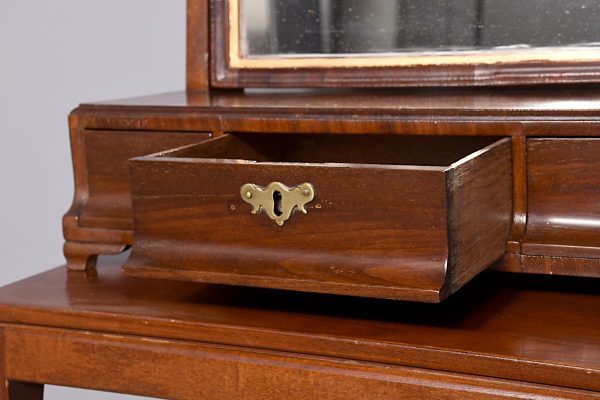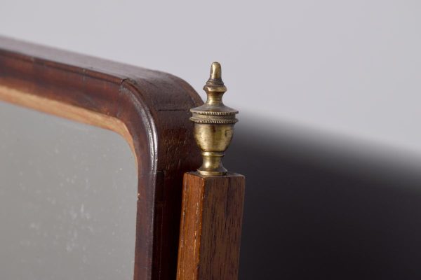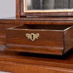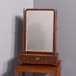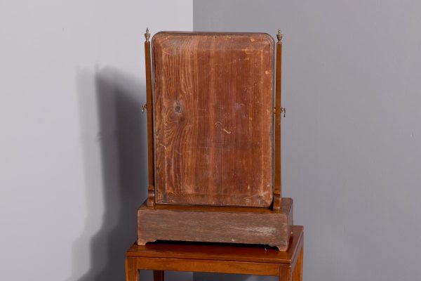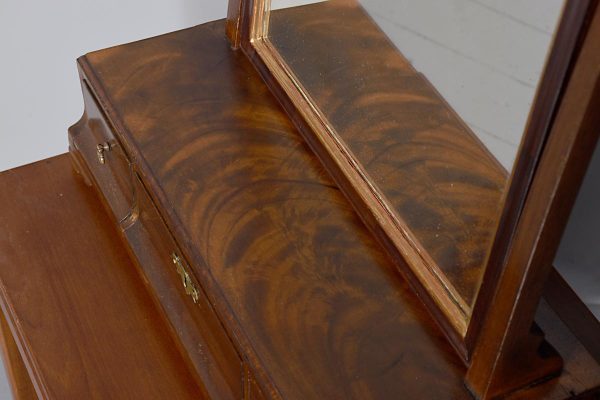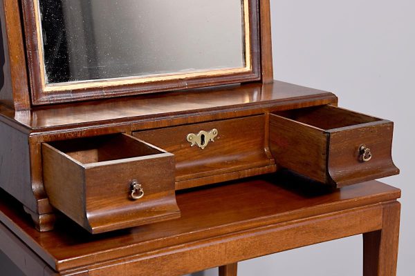 Circa 1760. George II mahogany dressing mirror with its original mirror plate in good condition (some “foxing” present) surrounded by a chamfered mahogany frame with a gilt slip and supported uprights with brass finials and brass axe head retaining screws. The base in flame mahogany with three shaped drawers with brass handles. All on neat shaped ogee bracket feet