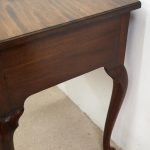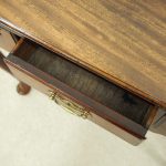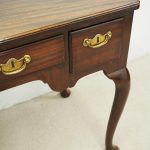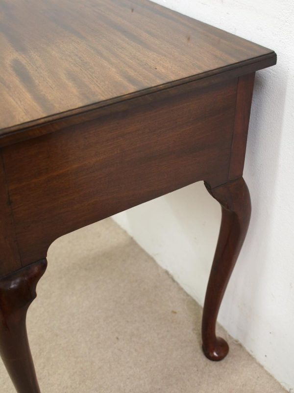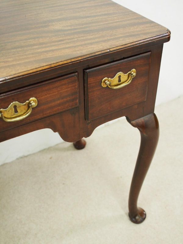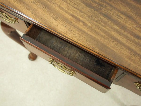 Circa 1740, mahogany George II lowboy. With double rounded edges to the front, and a configuration of 1 short drawer over 2 deep drawers each with original cast brass handles with cut out escutcheons. It has a shaped apron, the sides are polished and it all stands on 4 cabriole legs with shaped quarter blocks, finishing on a simple pad foot.