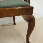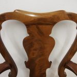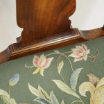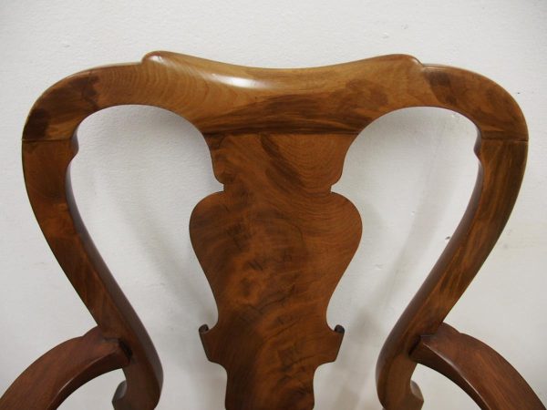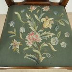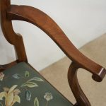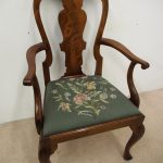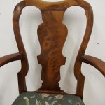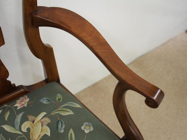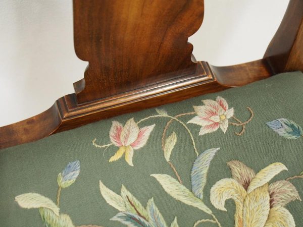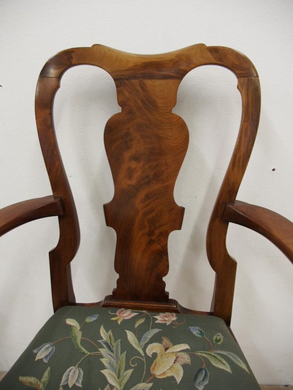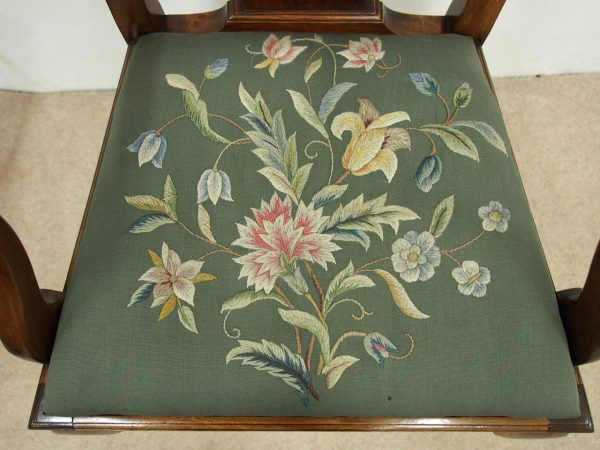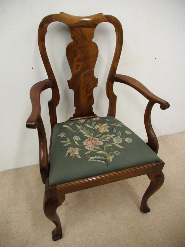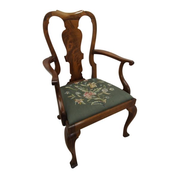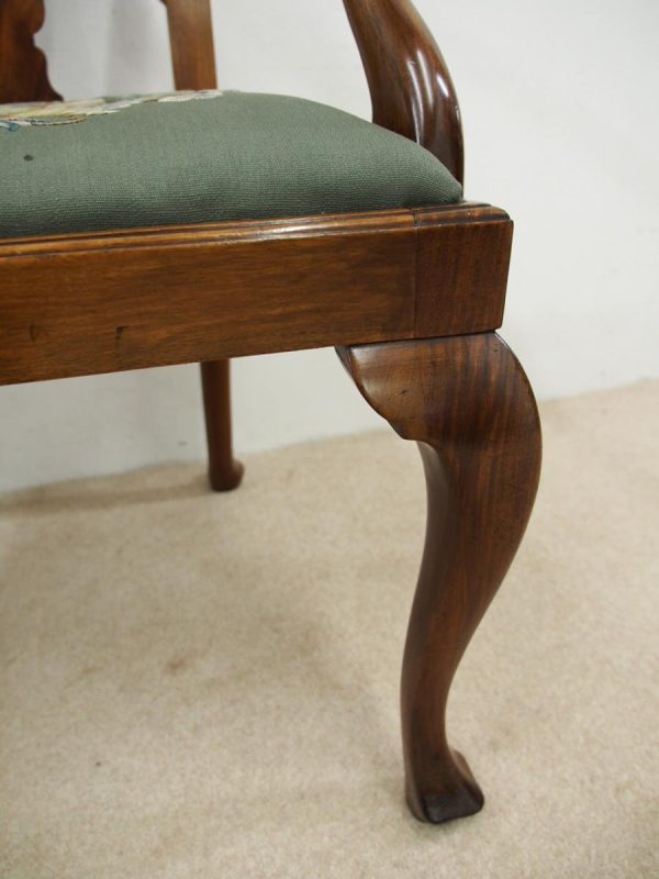 Circa 1920, George II style armchair. In heavy, quality figured Spanish mahogany, with central vase-shaped splat and curved top rail with shaped arms and scrolled finish. It has a floral hand-embroidered tapestry seat and cabriole supports to the front and outswept back feet.