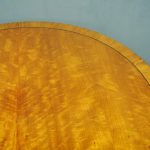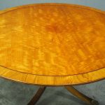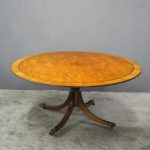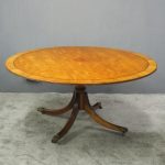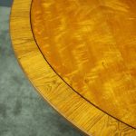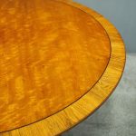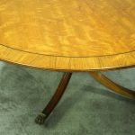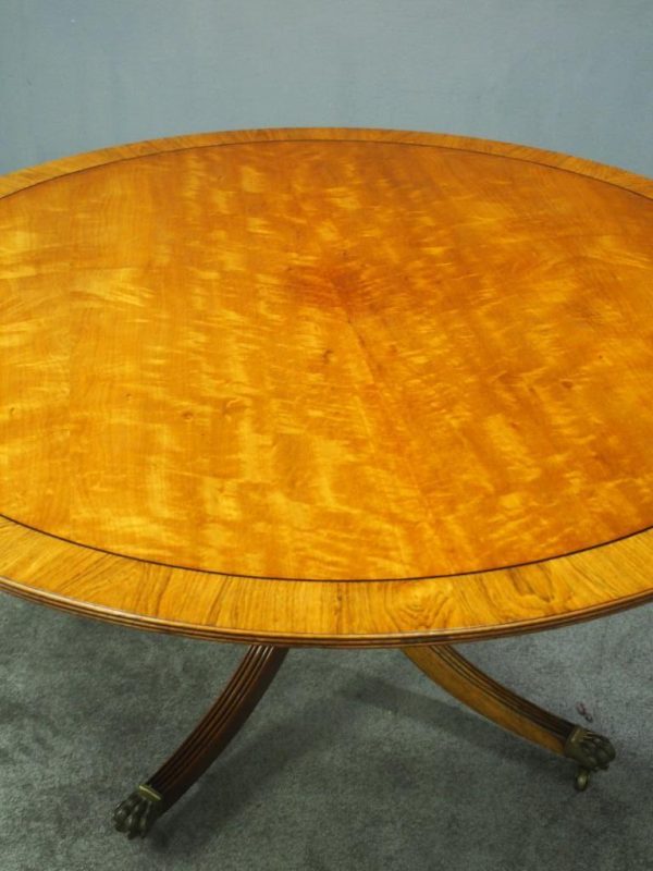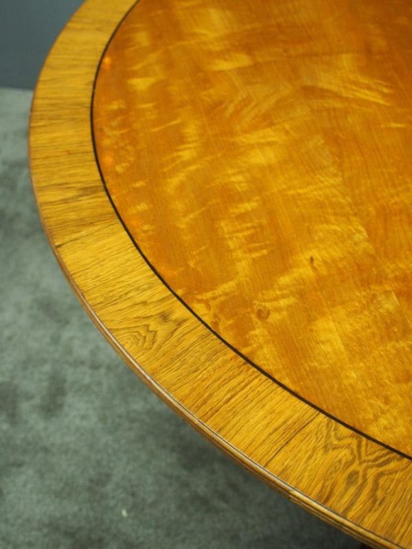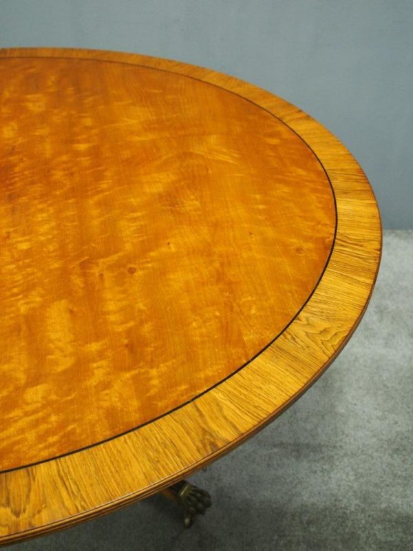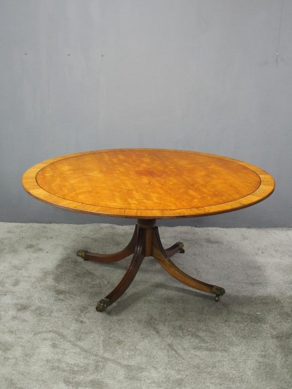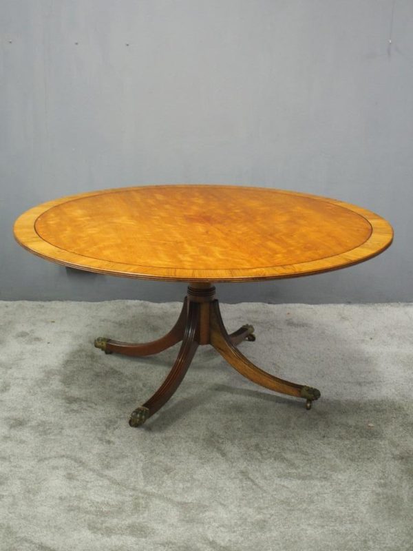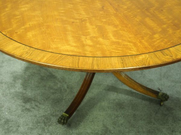 Circa late 1900s, large George II style circular mahogany dining table. The top in mirror matched Spanish flame mahogany veneers with ebony inlay, rosewood cross banding and reeded edges, supported on a gun-barrel stem with ring turnings. Over four outswept fluted supports with lions claw brass castors.