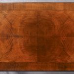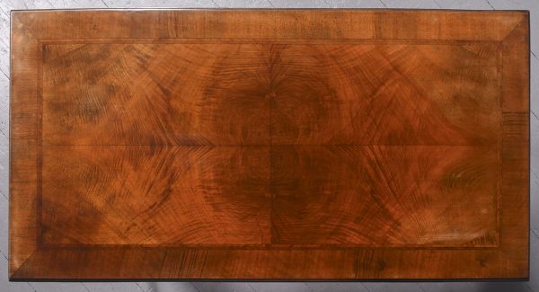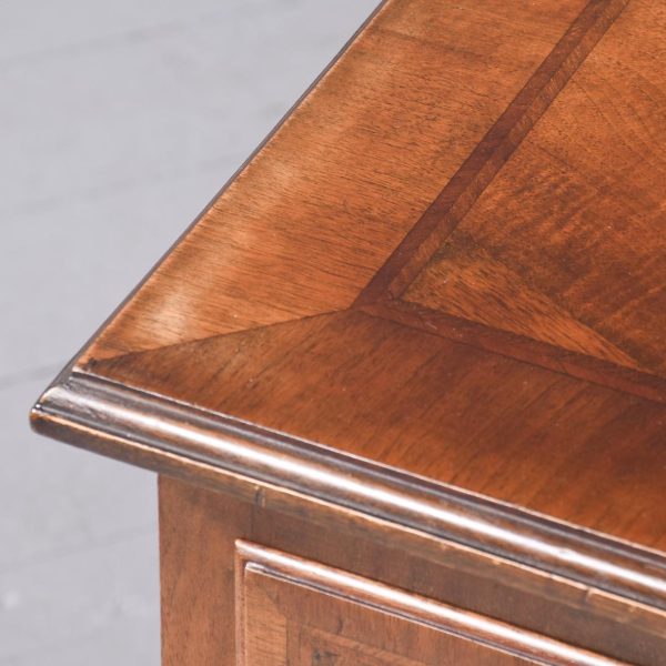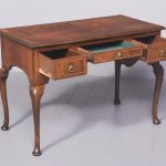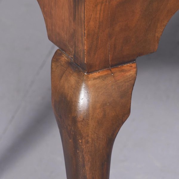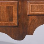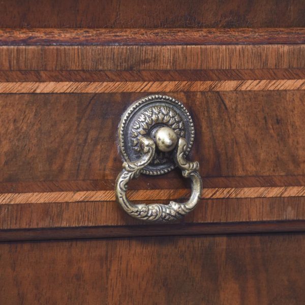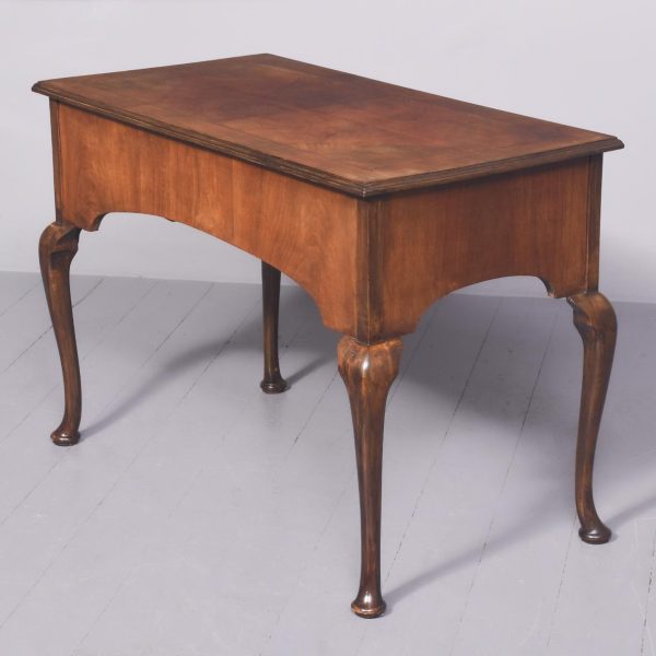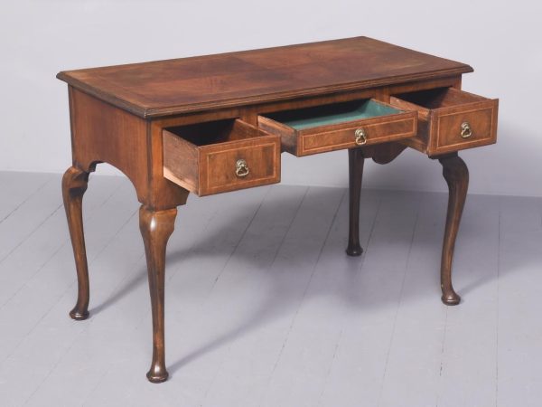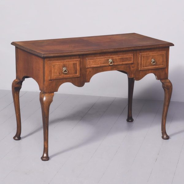 Circa 1900. George II style, figured-walnut freestanding dressing table/side table/desk. The crossbanded top with herringbone inlay and quartered, figured walnut with moulded foredges above central narrow and 2 deeper side frieze drawers all with crossbanding, matching inlay and very finely cast brass drop handles. With a shaped kneehole and supported on cabriole legs with pad feet.