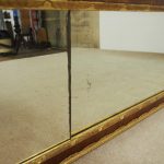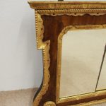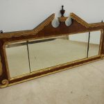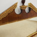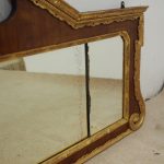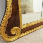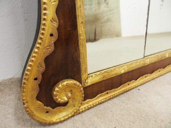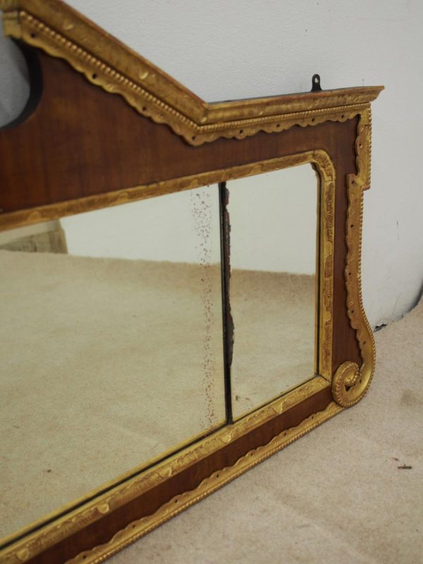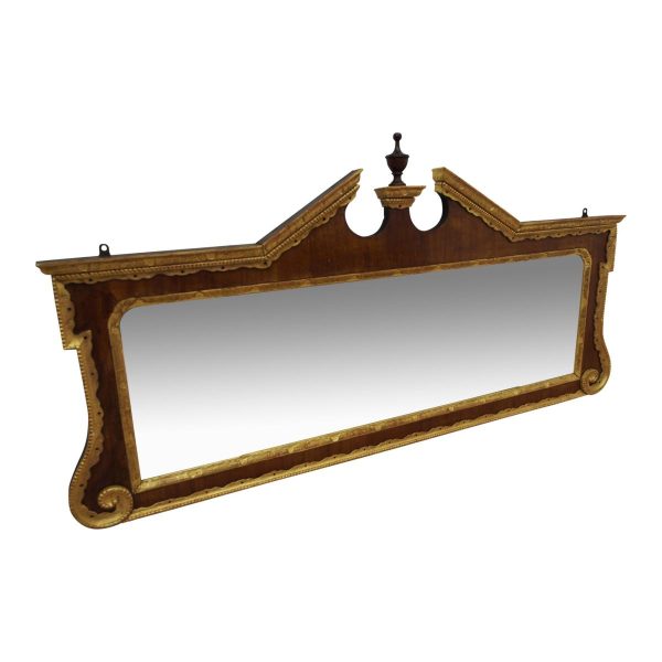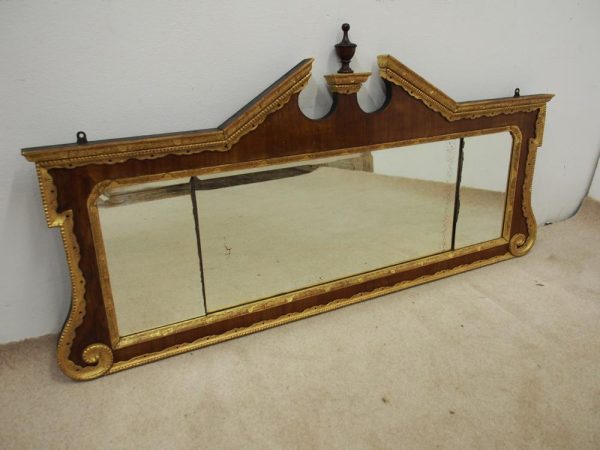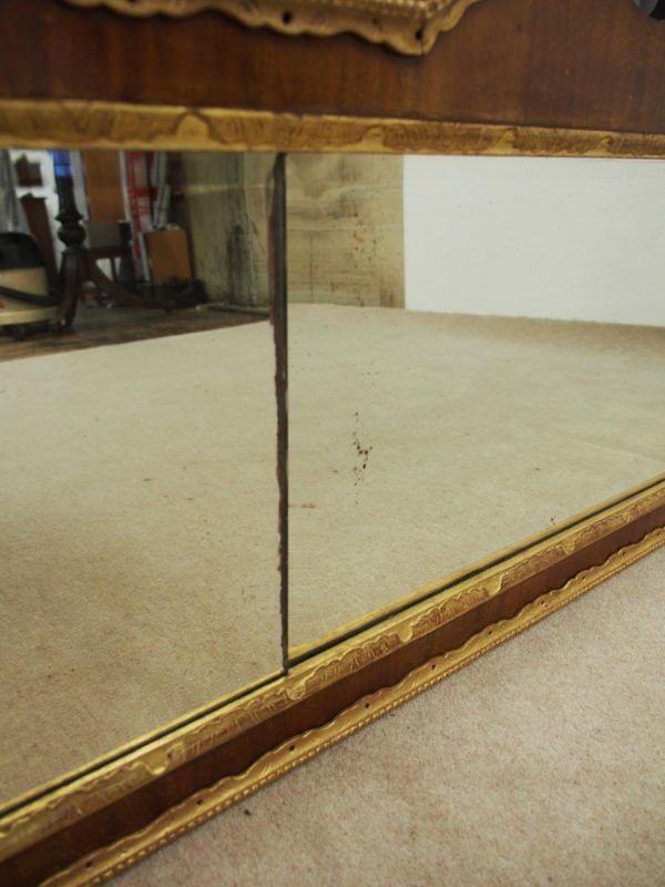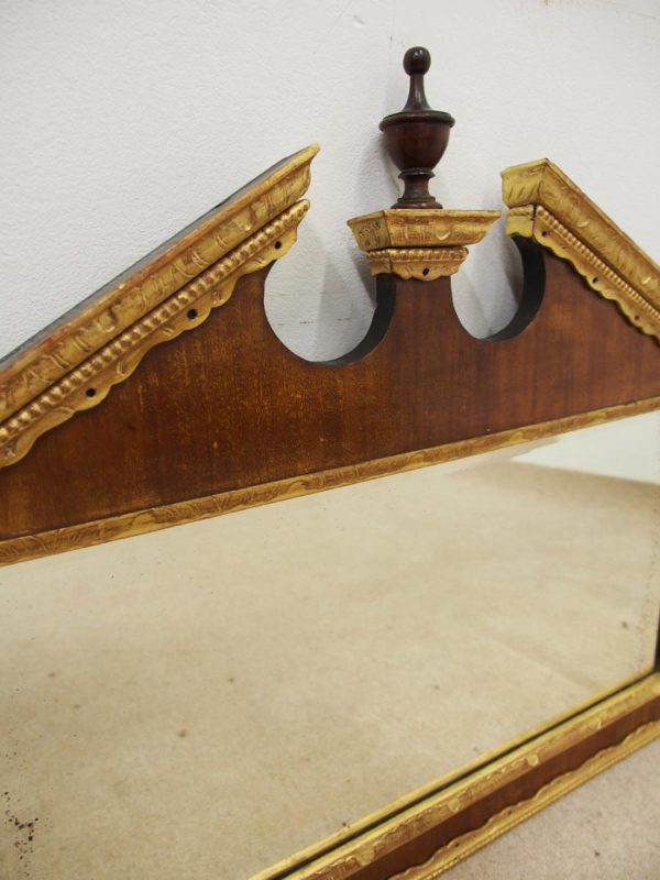 Circa 1880, George II style parcel gilt and mahogany mirror. With architectural pediment surmounted by a raised, gilded centrepiece and a mahogany urn, and parcel gilding to the frame. The mirror consists of 3 panes of glass, with bevelled edge and foxing in areas. There are 2 scrolling sections in carved gesso to the base, finishing with a beading that continues around the entire piece.