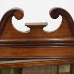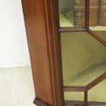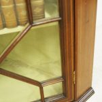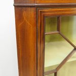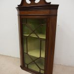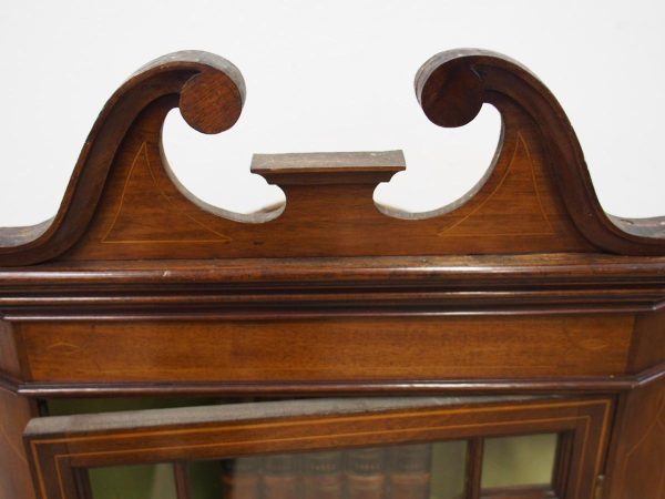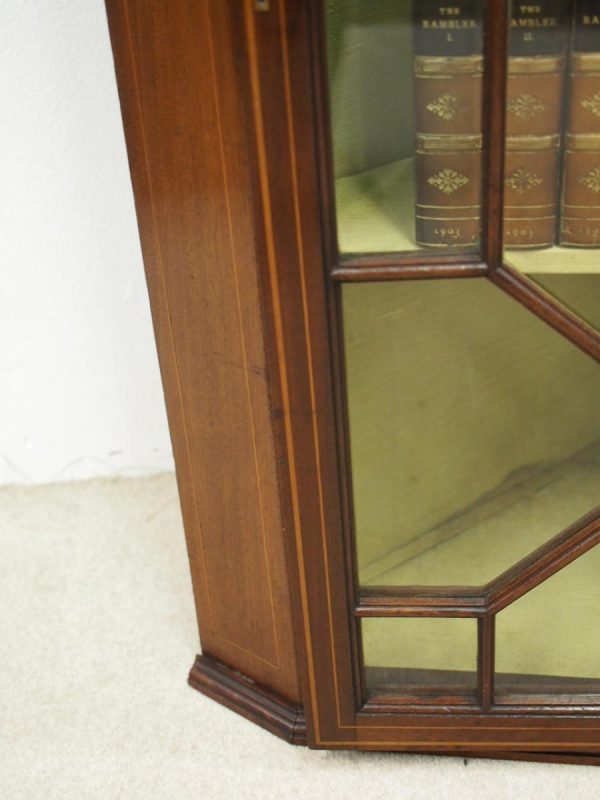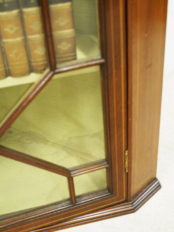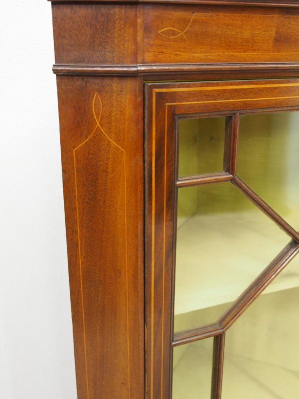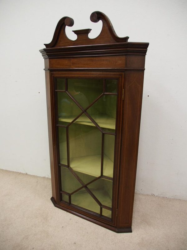 Circa 1860, George II style inlaid mahogany corner cabinet. The inlaid, astragal-glazed door opens to reveal two adjustable shelves. Above is an inlaid frieze and broken swan neck pediment, with boxwood Inlaid gables at sides, all above a simple moulded base.