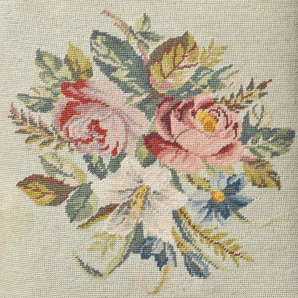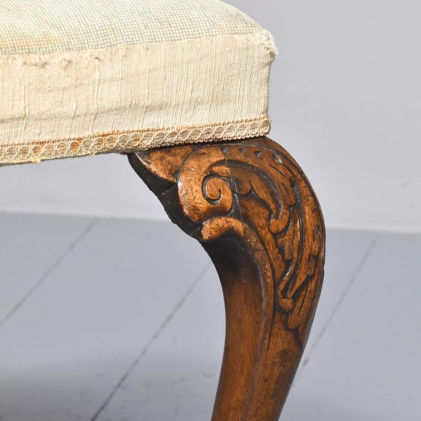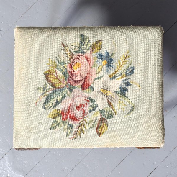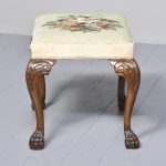 Circa 1890, George II style rectangular stool with a colourful needlepoint top, upholstered on the top and the sides. Standing on 4 wonderful legs with acanthus carved knees and quarter blocks, finishing in a stylish hairy paw foot clasping a ball. Good colour and patination.