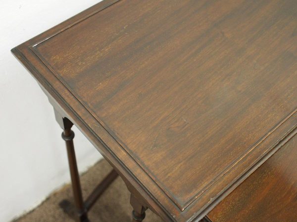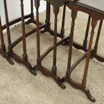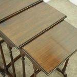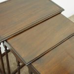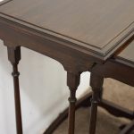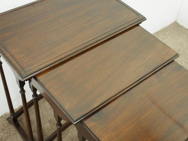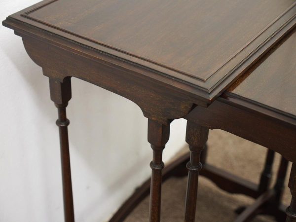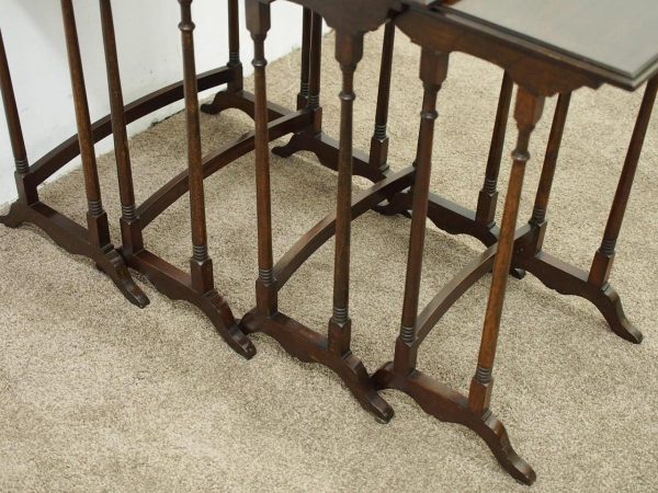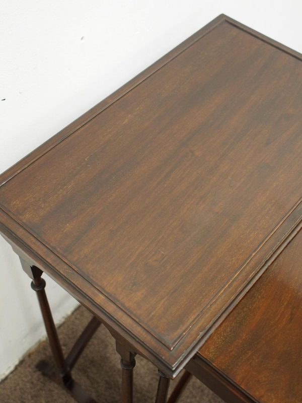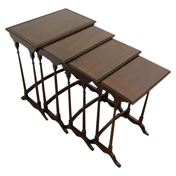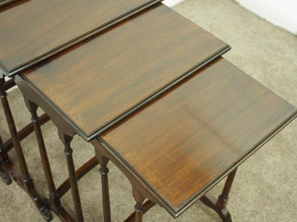 Circa 1900, quartet of George II style mahogany occasional tables. With a raised beading set slightly off the edge of the top table and moulded four edge. The tables have spider legs, elegant, ring turned and tapering with a curved stretcher towards the base of each leg connecting the back two legs. The tables fit neatly inside each other, standing on a trestle end with a simple foot.