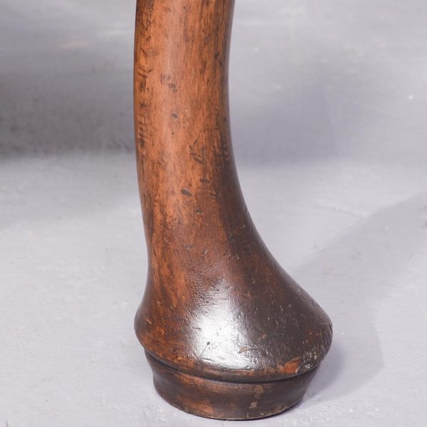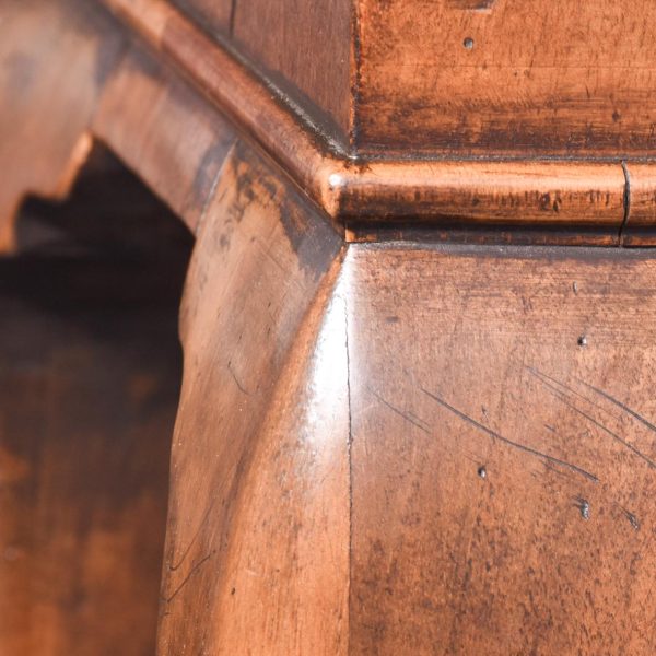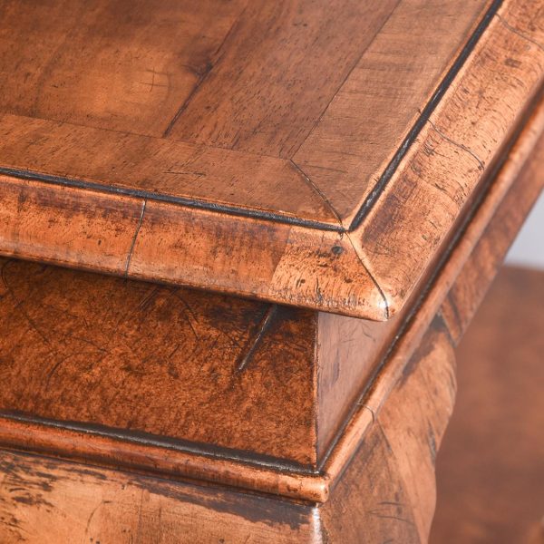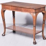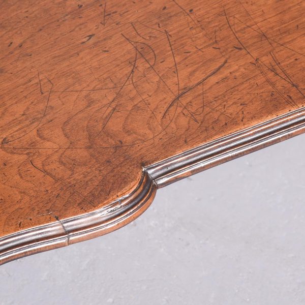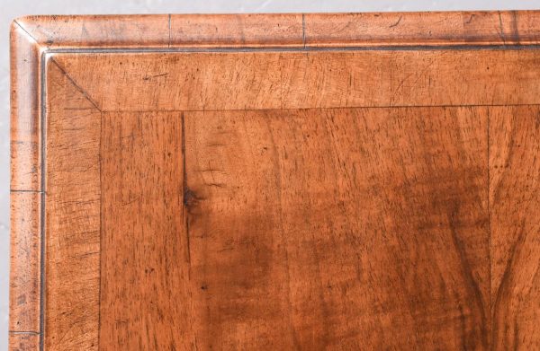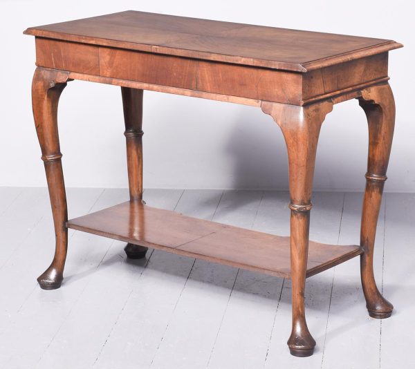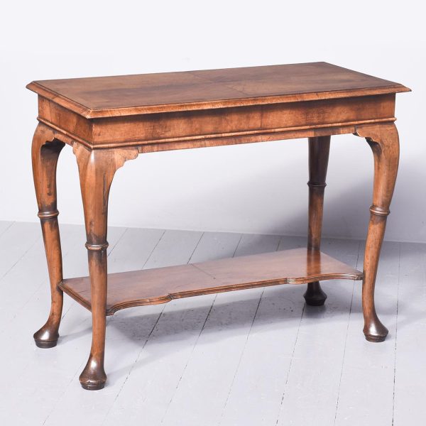 Circa 1890. George II style walnut console or serving table with attractive mellow colour. The rectangular top with quartered figured walnut with crossbanding and moulded edges over a simple beaded frieze and skirt. Supported on cabriole legs with quarter brackets, ring turnings and pad feet with an under stretcher with shaped front and mirror matched walnut.