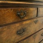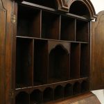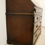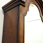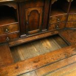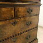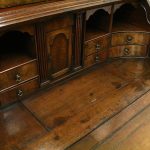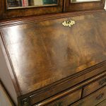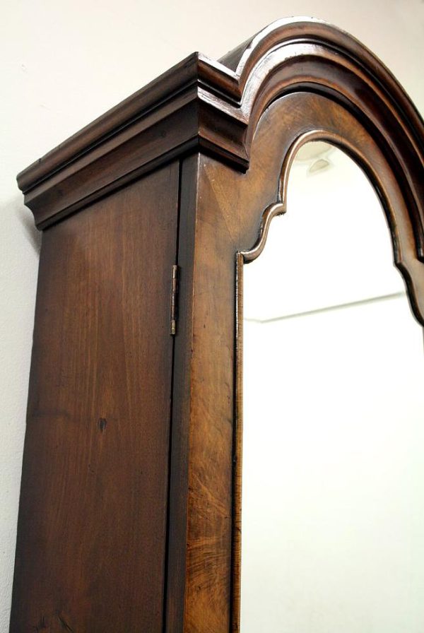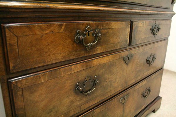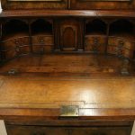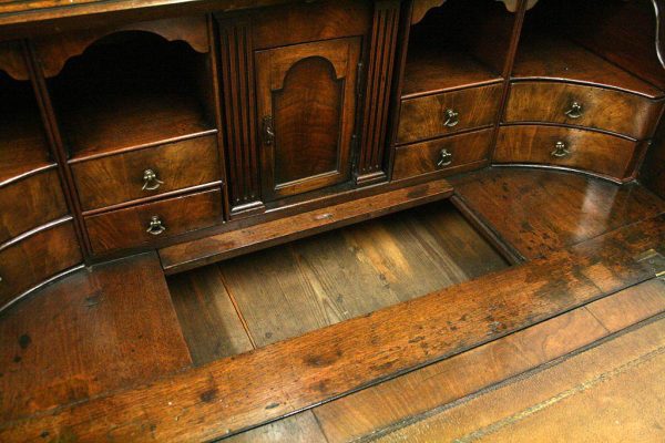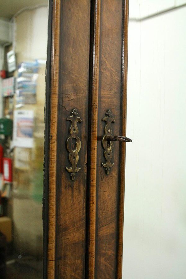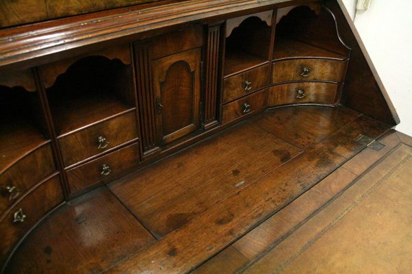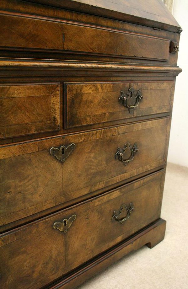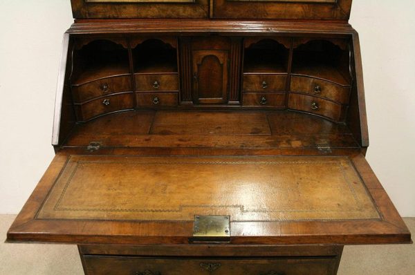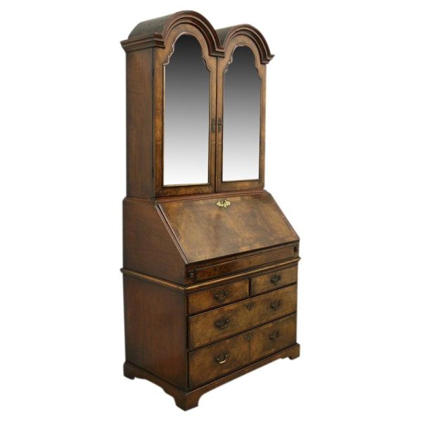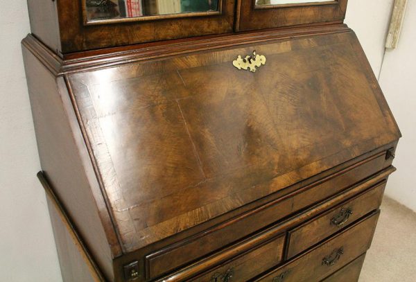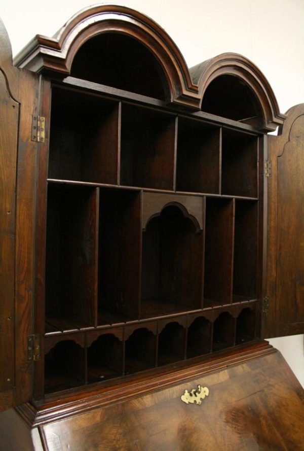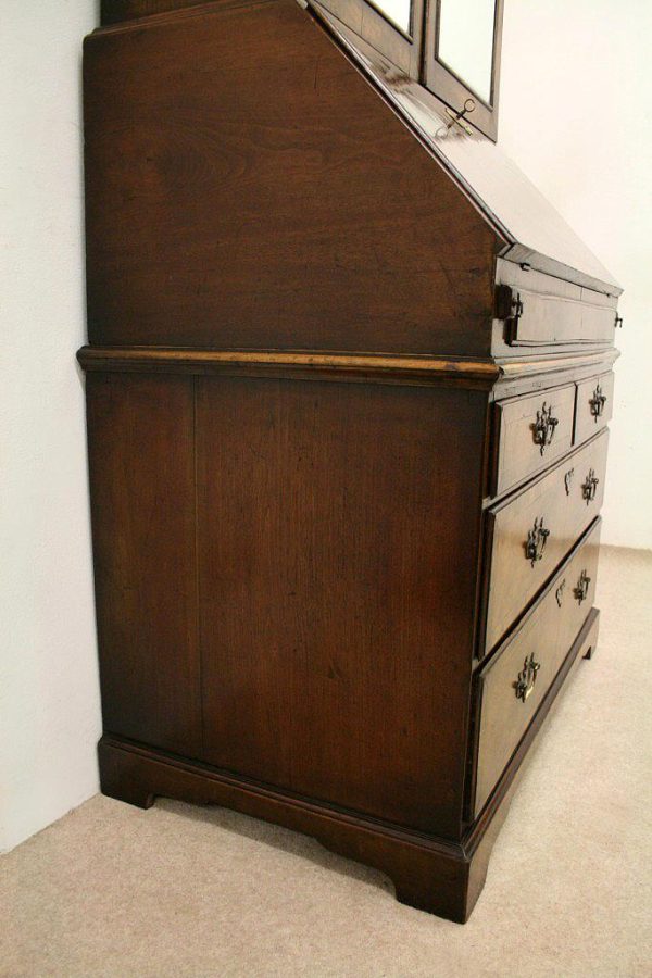 Circa 1730, George II walnut bureau bookcase with later Victorian alterations. The double dome top has a classic shaped cornice, above two doors with hand bevelled edge mirrors surrounded by a half round beading. The doors have a central beading which matches this bezel, and two brass escutcheons with one functioning as a lock. The doors open to reveal a well fitted interior with various pigeon holes. The carcass of the bookcase top is in oak. The main bureau itself has a large crossbanded flap and matching veneers in the centre, and a large cast brass escutcheon. Inside is a slide with a well in the centre, pigeon holes, various shaped drawers with cast brass axe head drops, a centre door with a raised arch panel similar to the outside doors, and a leather writing surface. Outside is a long dummy crossbanded drawer which contains the well on the inside. Below this are two short over two long graduating drawers with crossbanding and matching walnut veneers, and cast brass handles with stylish back plates. All standing on four walnut bracket feet. The piece is in three parts, sturdy, and functional with excellent colour and condition. The handles and feet have been changed at a later time.