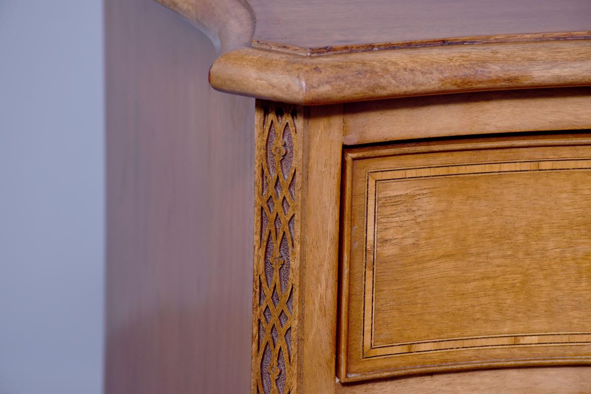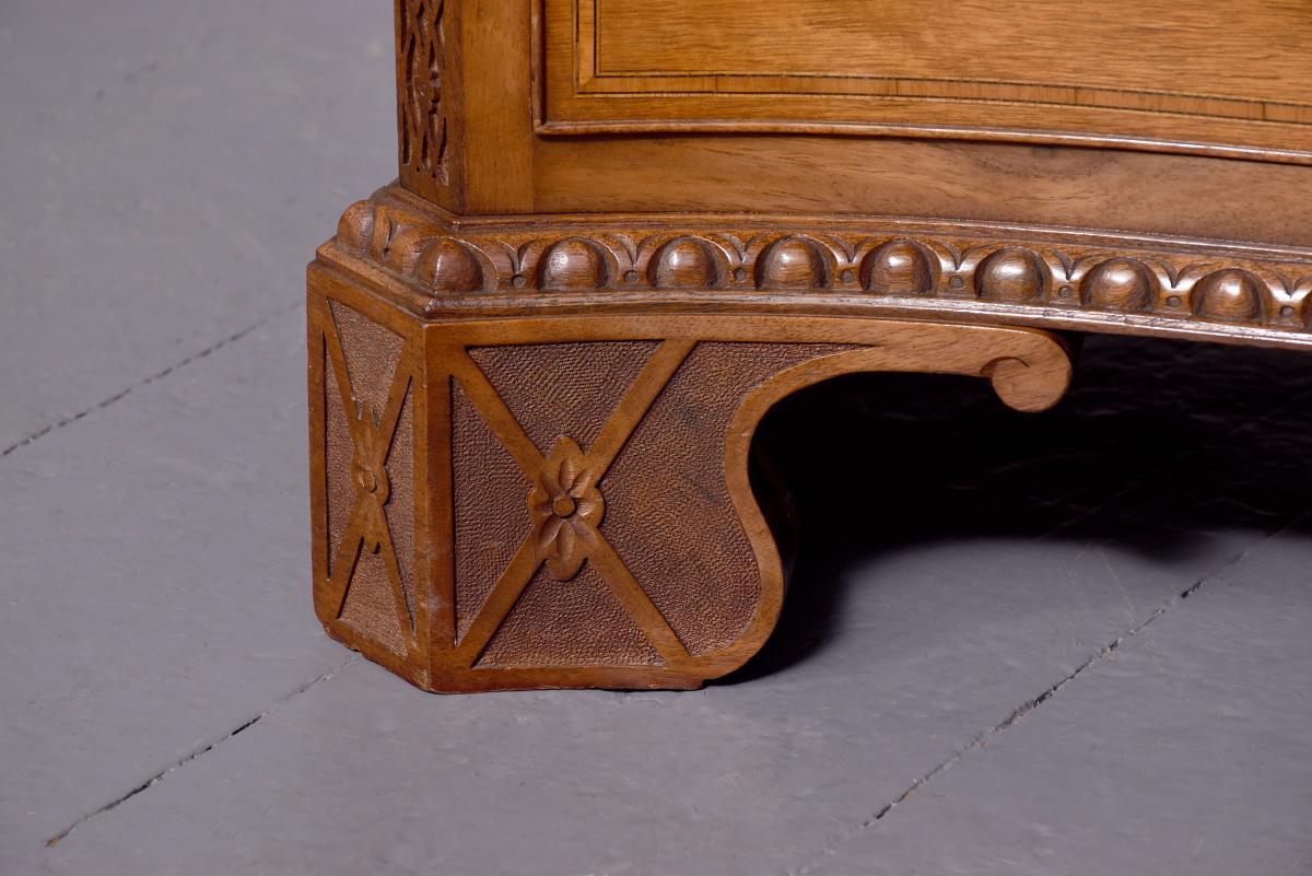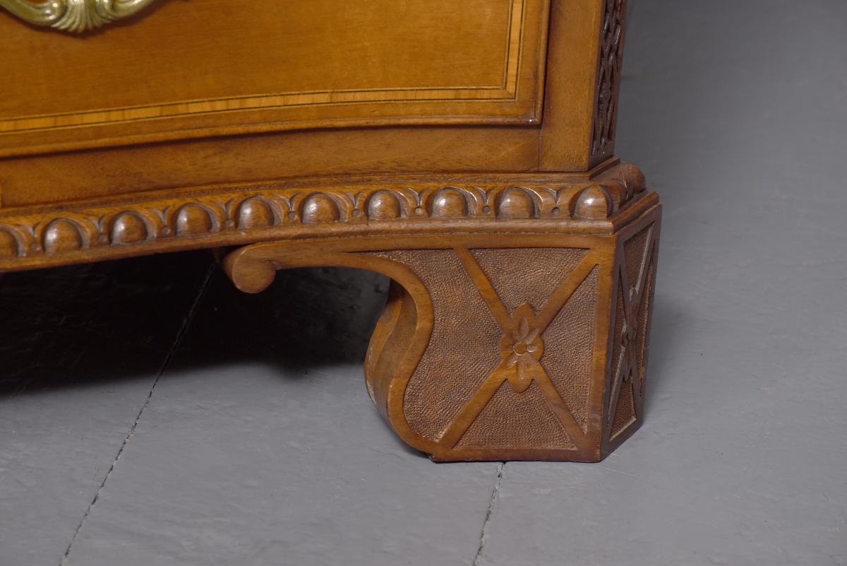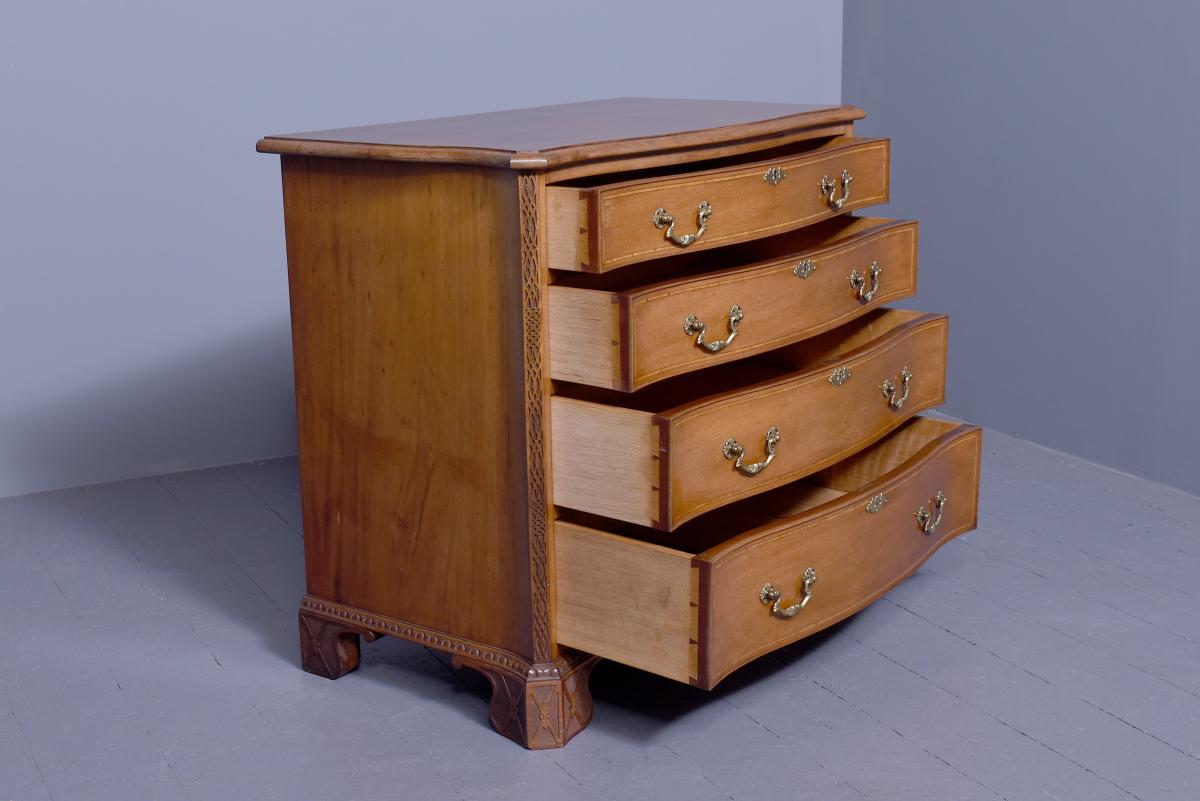 Circa 1900. George II1 style, inlaid mahogany serpentine fronted, neat-sized chest of drawers. The serpentine fronted top in figured mahogany with lovely colour and patina and a moulded fore-edge above four graduated drawers with cast brass swan neck handles, cut brass escutcheons and boxwood, tulip wood and ebony inlay, the drawers with solid cedar linings. The chest with canted sides with blind fretwork decoration and a foliate carved neat base and very unusual blind fret carved shaped bracket feet. In perfect condition.