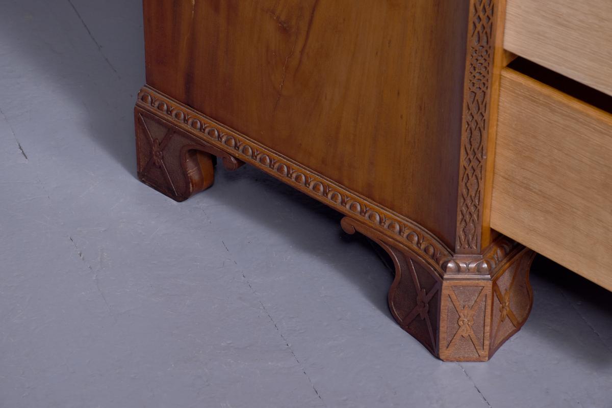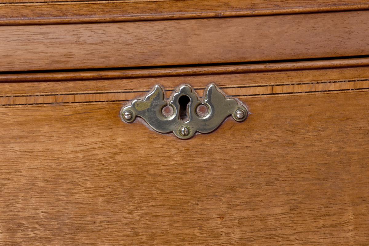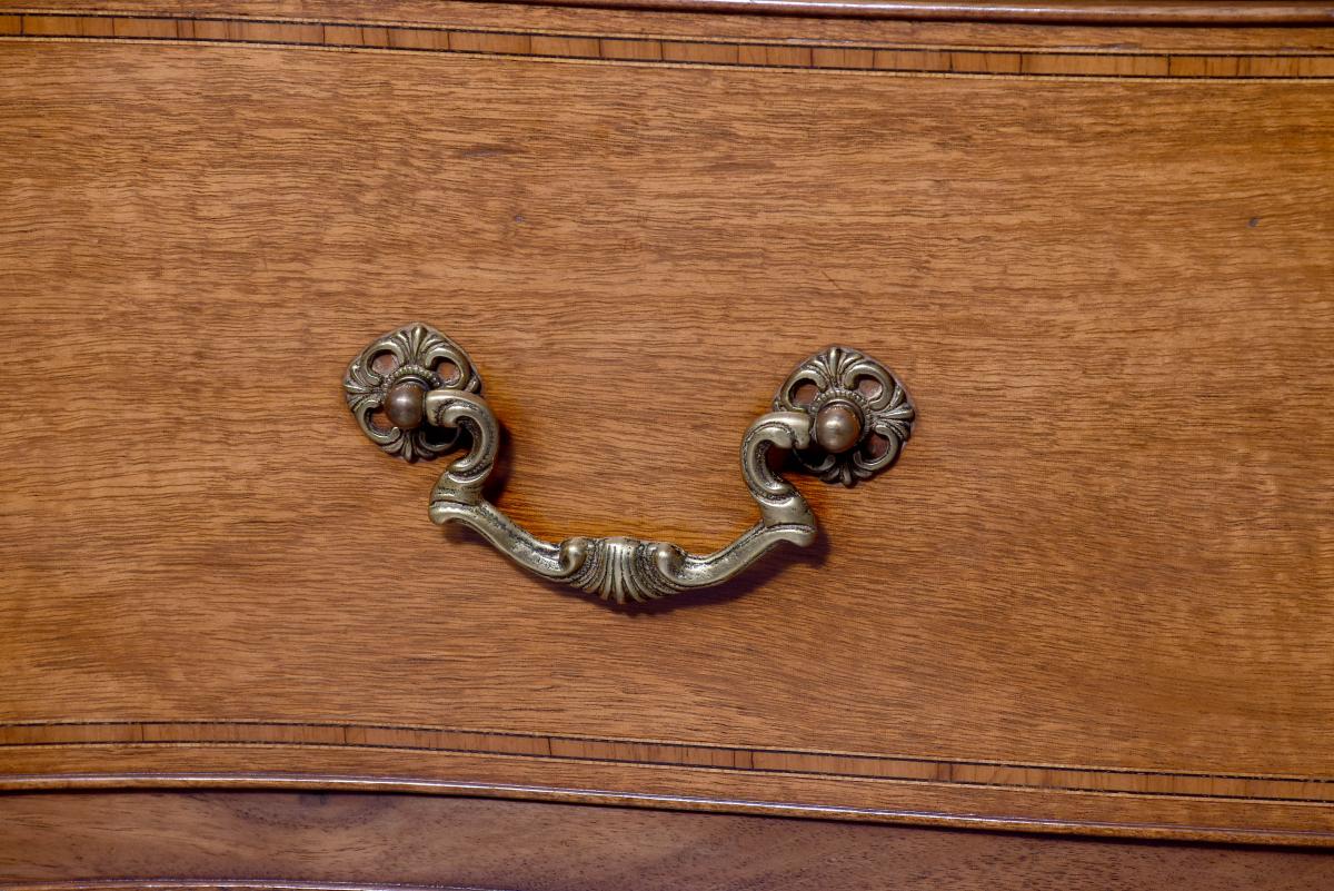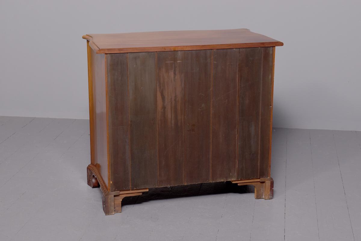 Circa 1900. George II1 style, inlaid mahogany serpentine fronted, neat-sized chest of drawers. The serpentine fronted top in figured mahogany with lovely colour and patina and a moulded fore-edge above four graduated drawers with cast brass swan neck handles, cut brass escutcheons and boxwood, tulip wood and ebony inlay, the drawers with solid cedar linings. The chest with canted sides with blind fretwork decoration and a foliate carved neat base and very unusual blind fret carved shaped bracket feet. In perfect condition.