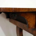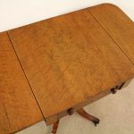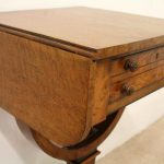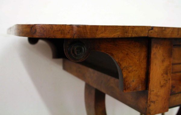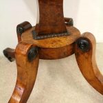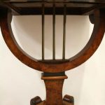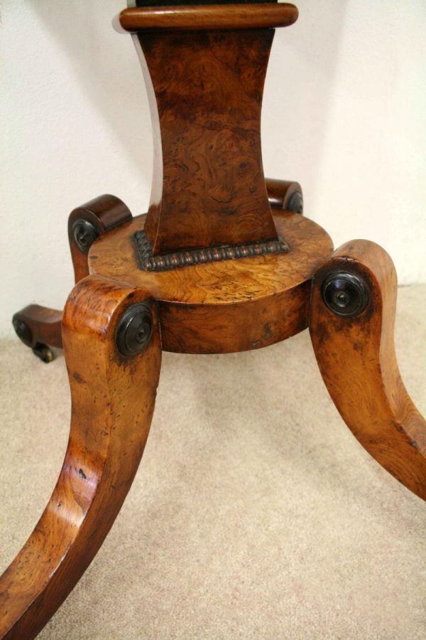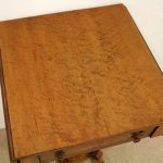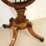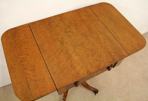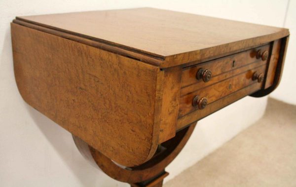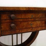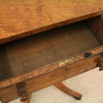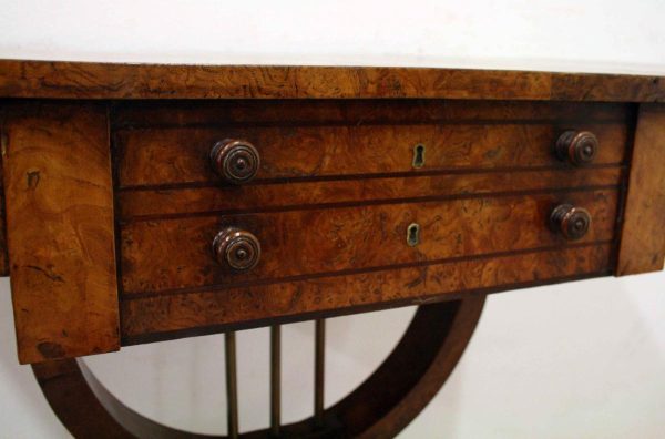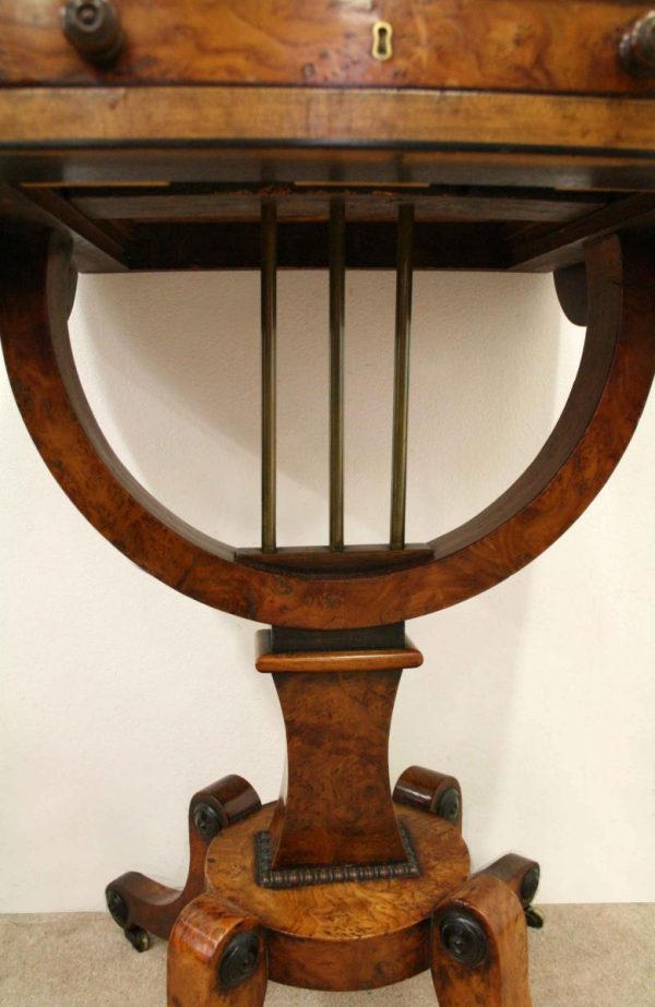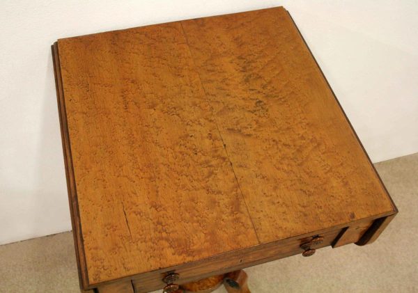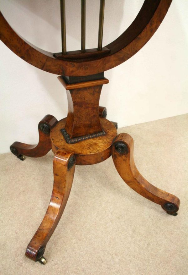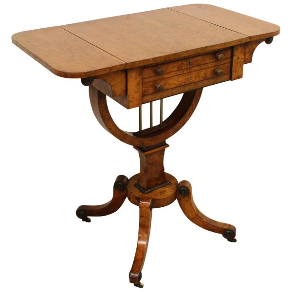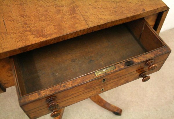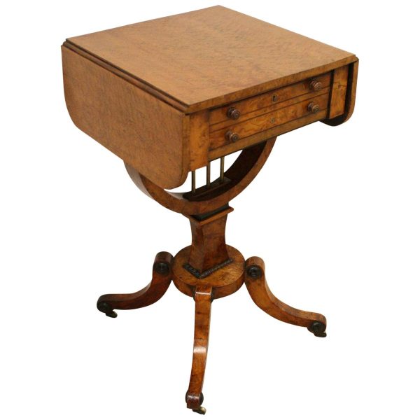 Circa 1810, George III birds eye maple work table, with a single faux double drawer to front and dummy drawers to back, on a lyre support with a circular platform base on 4 cabriole legs with applied roundels.