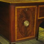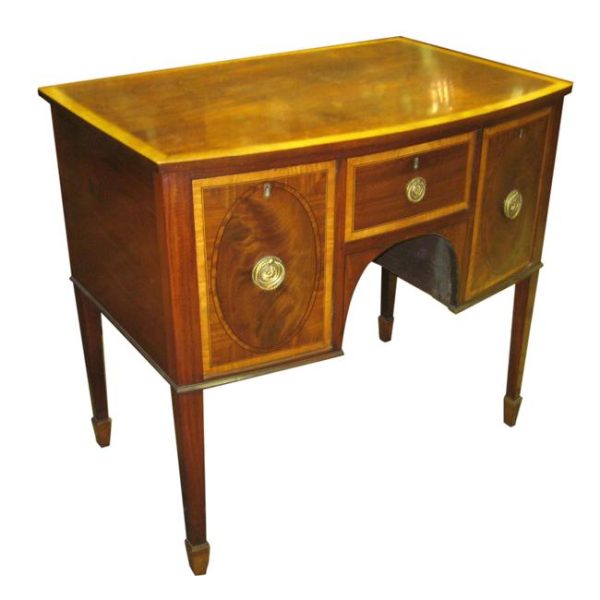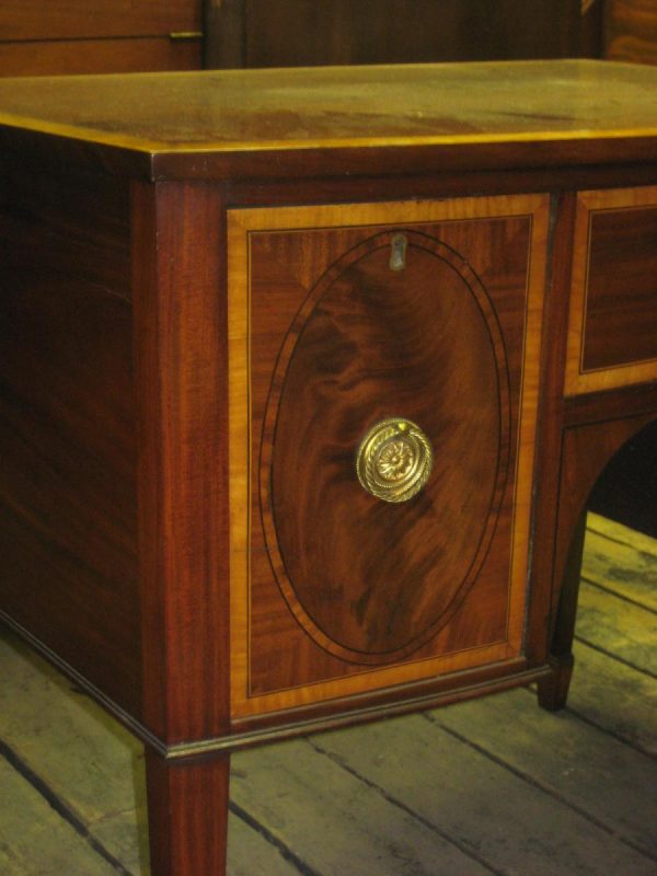 Circa 1790, George III bow fronted mahogany and satinwood banded sideboard with 3 drawers.