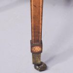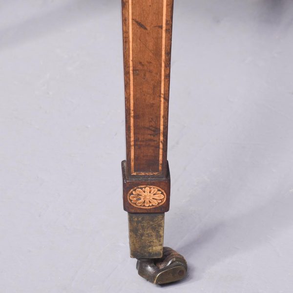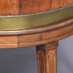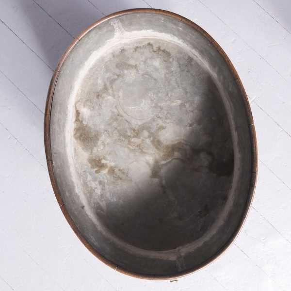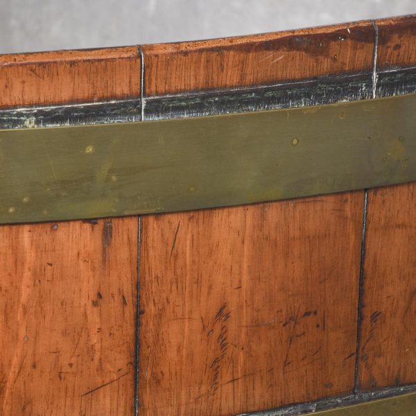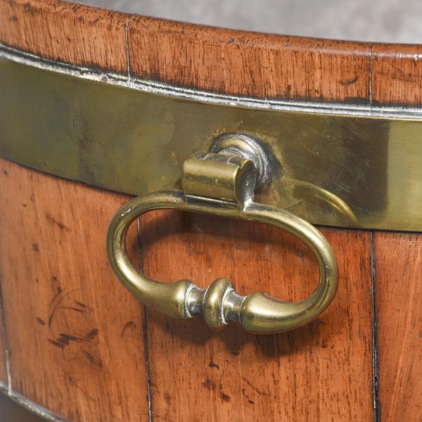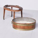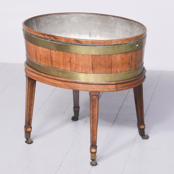 Circa 1790. George III, brass-bound, oval open wine cooler on stand with original zinc liner. The wine cooler with moulded edges, two brass bands and brass carrying handles supported on a moulded base above its original stand with a square inlaid tapering leg, with rare marquetry inlaid panels above its original brass caps and casters.