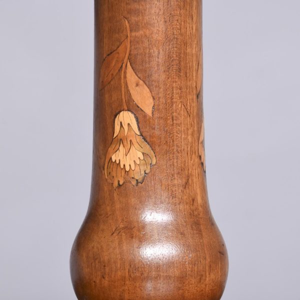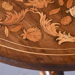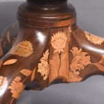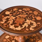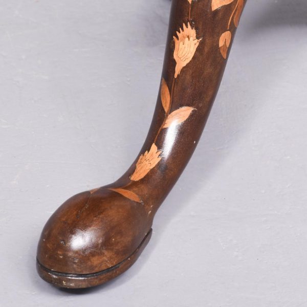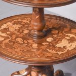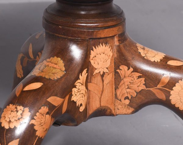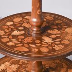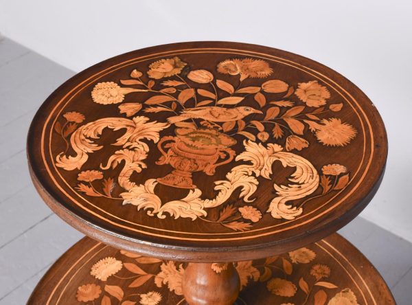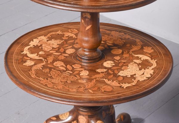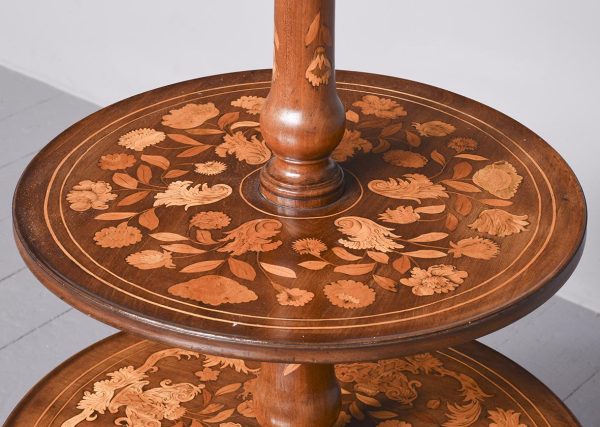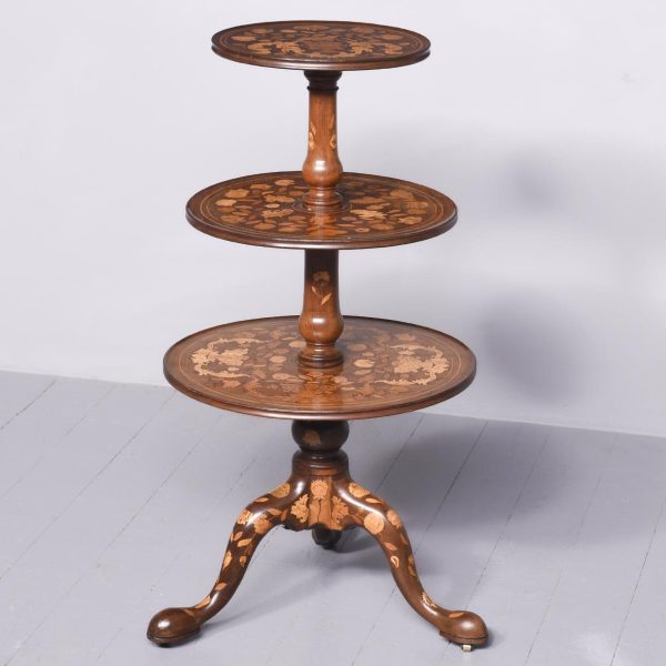 Circa 1760, George III British 3 tier mahogany dumb waiter of classical shape. Likely of Dutch origins, with the later addition of profusely inlaid Dutch marquetry. Each revolving tier is inlaid with slightly different patterns, with double string inlay to the sides and the inlaid designs continuing to the columns between each tier. Standing on a classic George III tripod base sweeping down to pad feet.