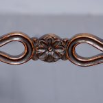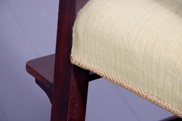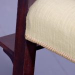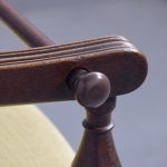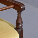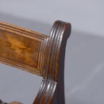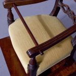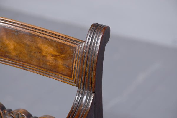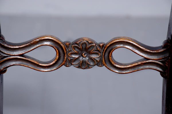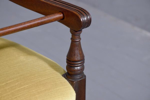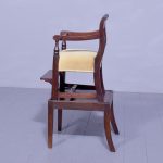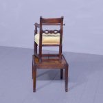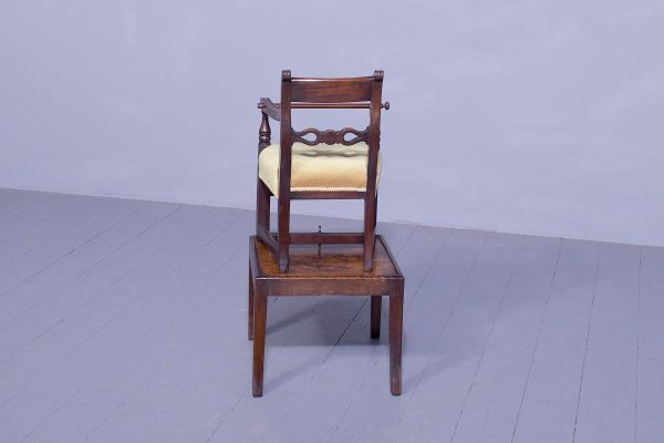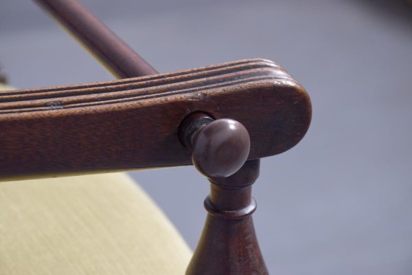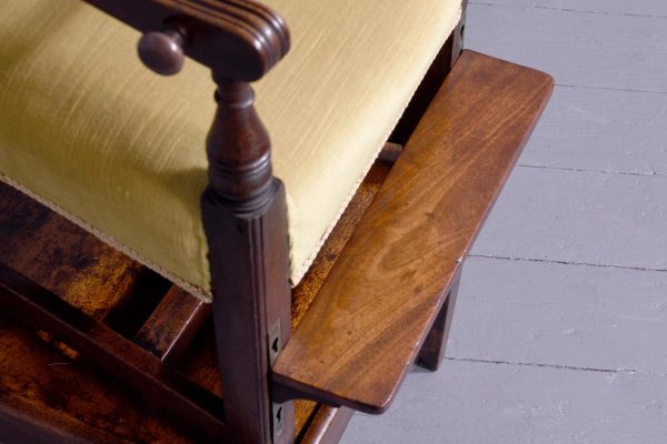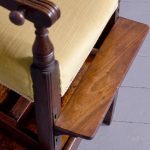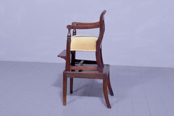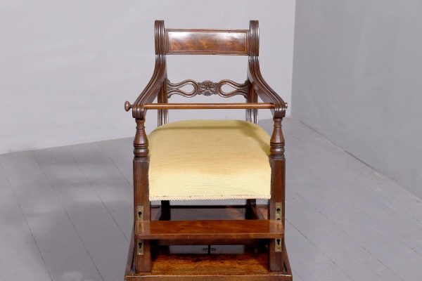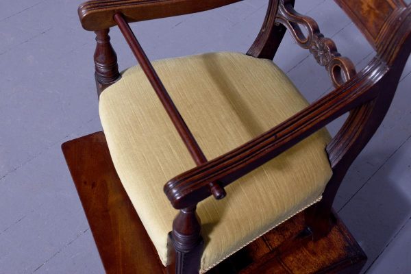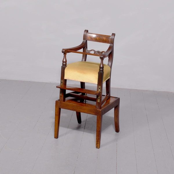Circa 1810. A late George III mahogany child’s armchair on stand, with all the features of an adults, the tablet top rail with reeding on ribbed uprights, the pierced and carved back, the stuff-over upholstered seat, the retaining rod secured to the arms, with an adjustable footrest, the chair is resting on a mahogany base with splayed back legs with a small brass bolt for locking the chair in position, with great colour and excellent patination.