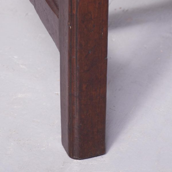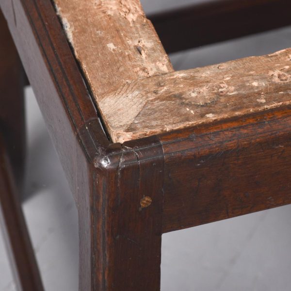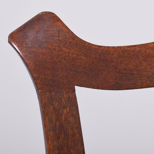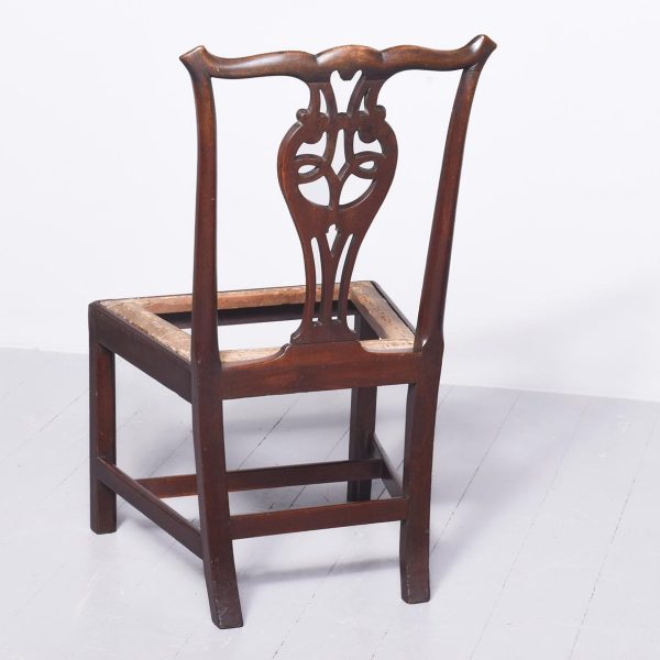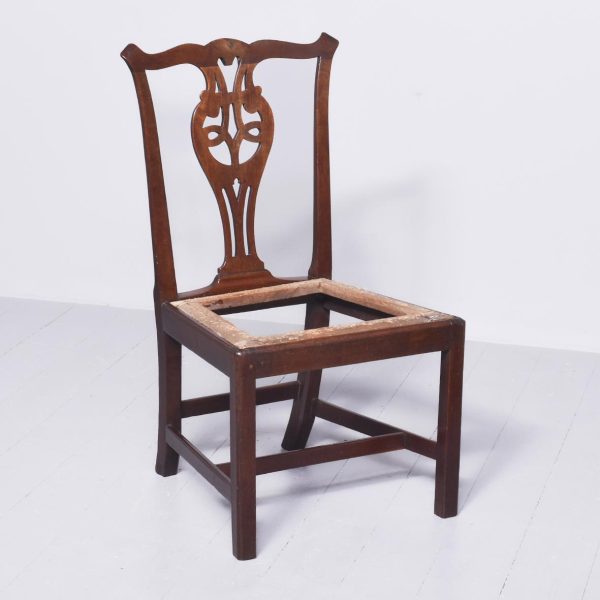 Circa 1790. George III country Chippendale-style mahogany chair. The shaped top rail above a central pierced splat and shaped side supports. With a lift-out seat (needs upholstery) and supported on chamfered square legs with a H stretcher. An attractive vernacular piece of furniture with lovely colour and patina.