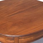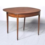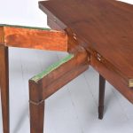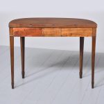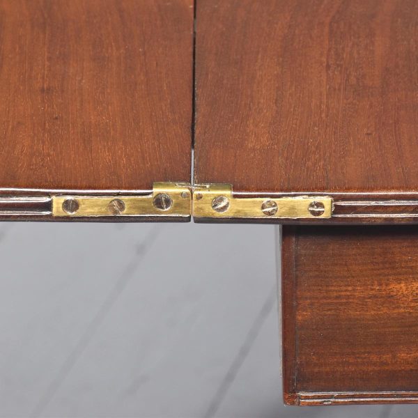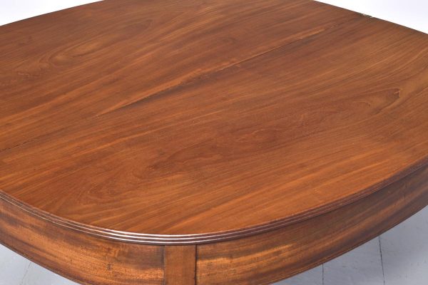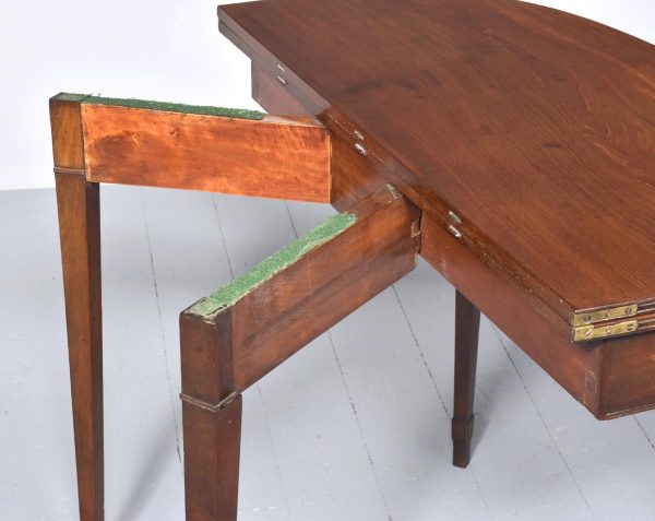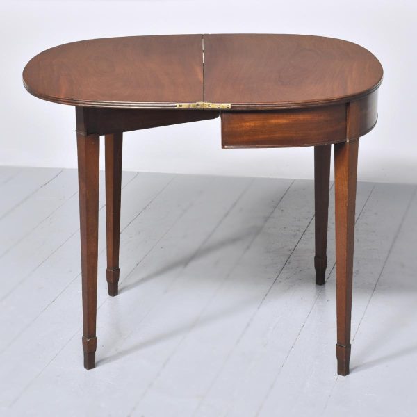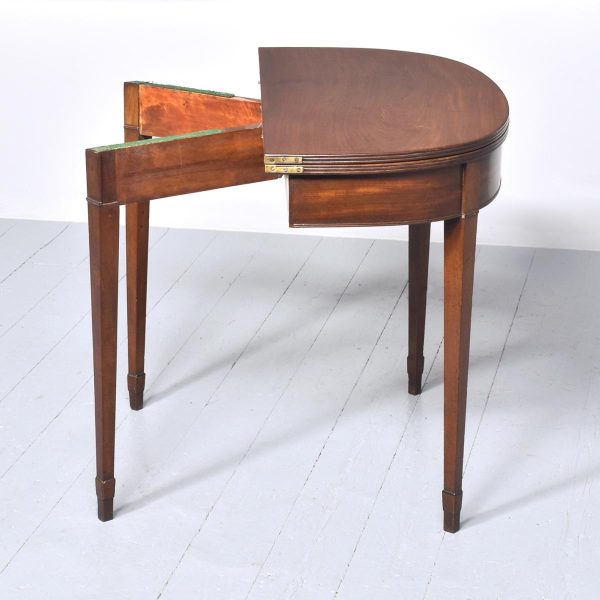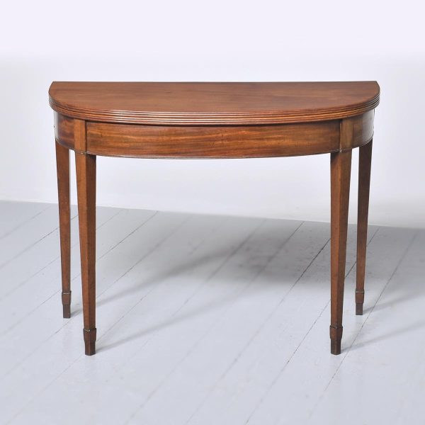 Circa 1800, a neat sized mahogany George III, D shaped fold over tea table. The solid hinged top with ribbed foredge opening to reveal two well figured mahogany tops, with a simple frieze with a reeded beading to the base, the table rest on four square tapering legs with mahogany socks towards the base. The back legs are hinged and sweep out to support the table when open.