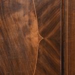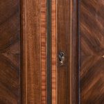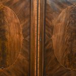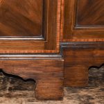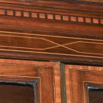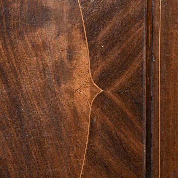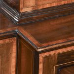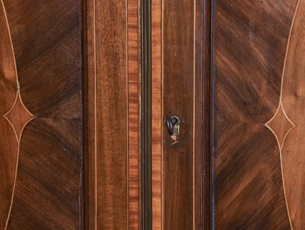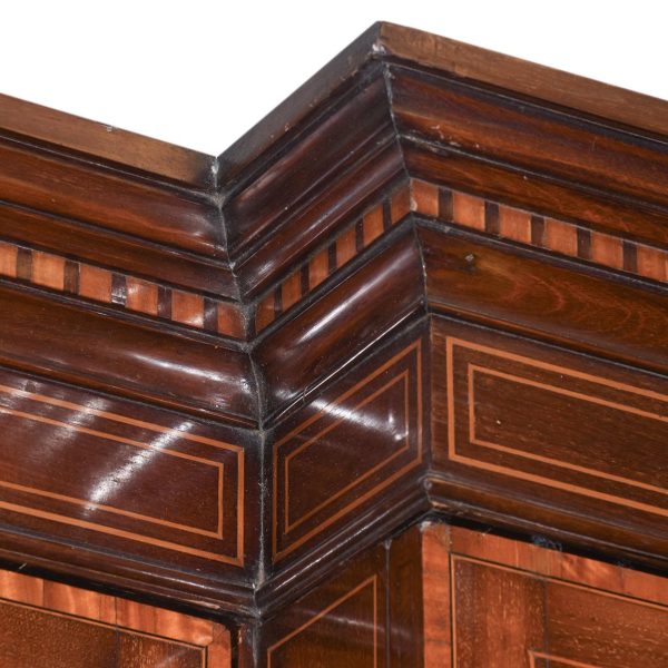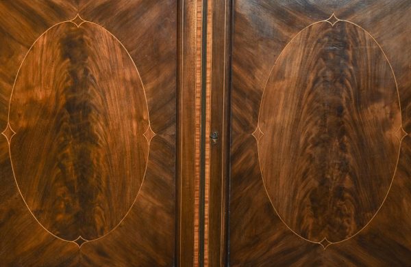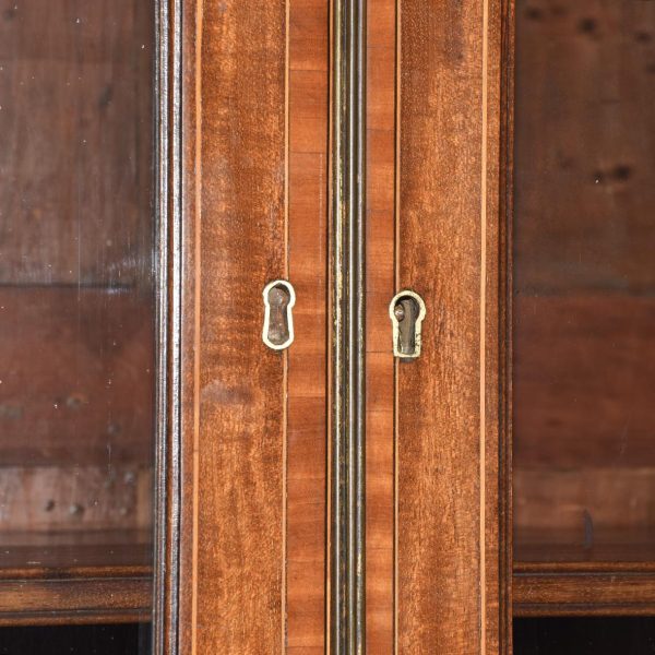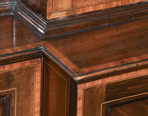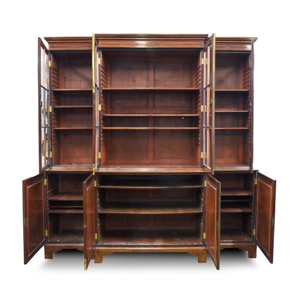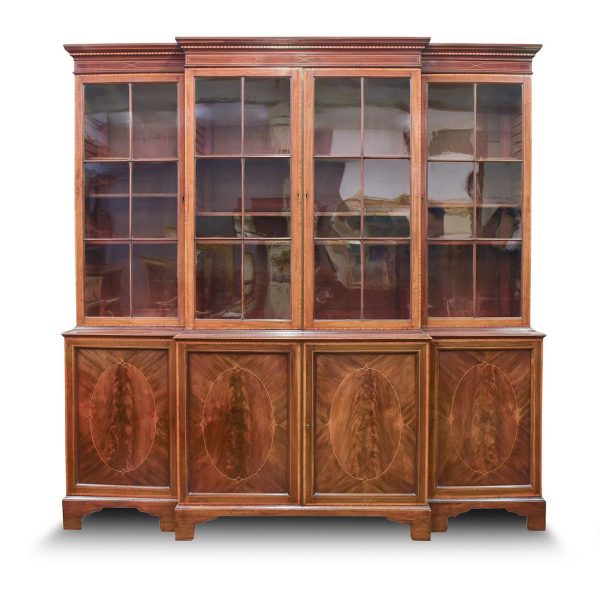 Circa 1790. A George III mahogany and inlaid four door and breakfront cabinet bookcase, with an elegant cornice with chequered inlay and frieze is a geometric box inlay, the four glazed doors with rectangular astragals and the original glass, with inlay on the frames, banding and a brass beading separating the doors in the center, each section with adjustable shelves, The flat section with similar satinwood banding, the base with four panelled doors with a flame mahogany oval panels in the center framed in boxwood, insides with adjustable shelves, all resting on a base with eight bracket feet which follow the form of the bookcase. The bookcase comes in several pieces for moving.