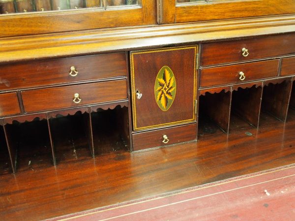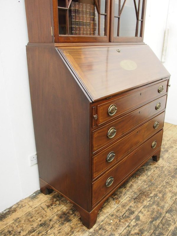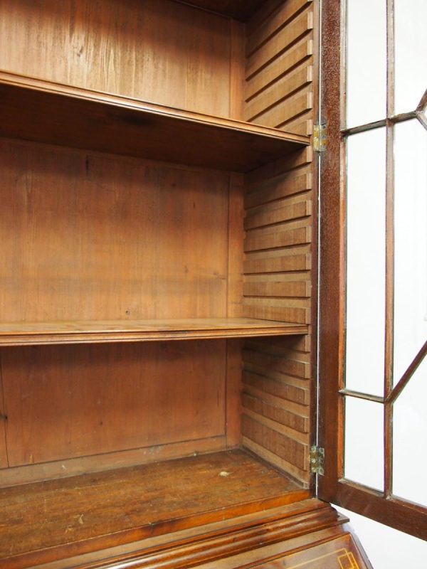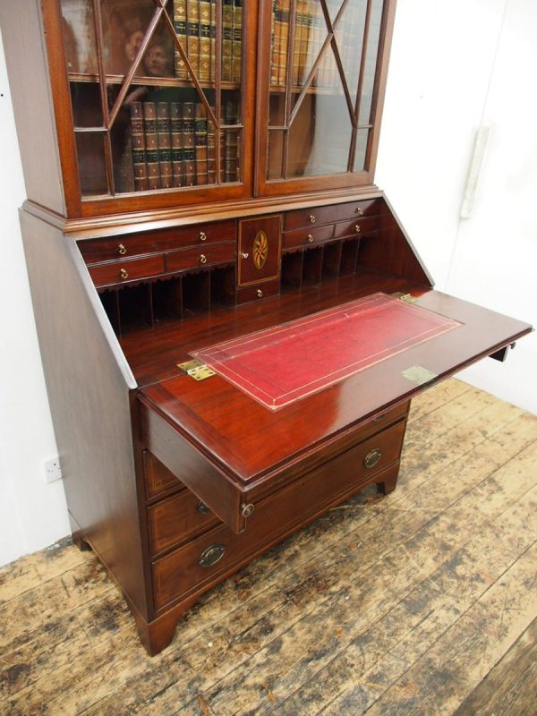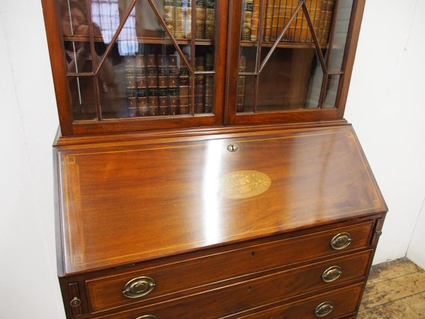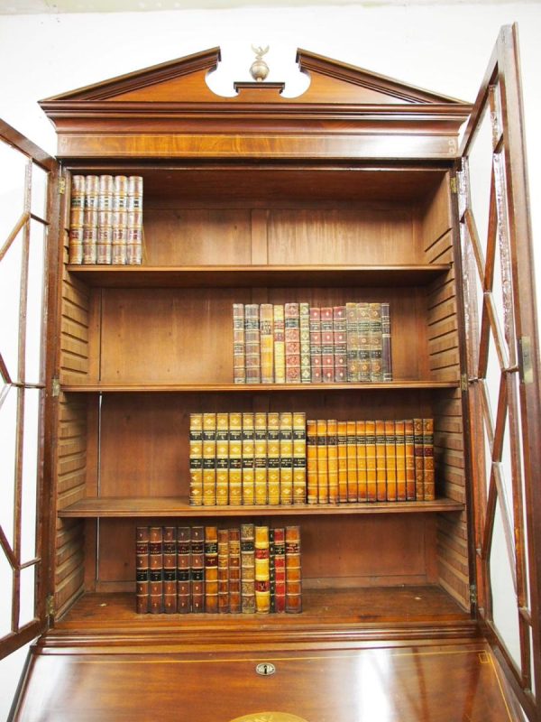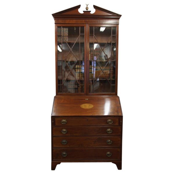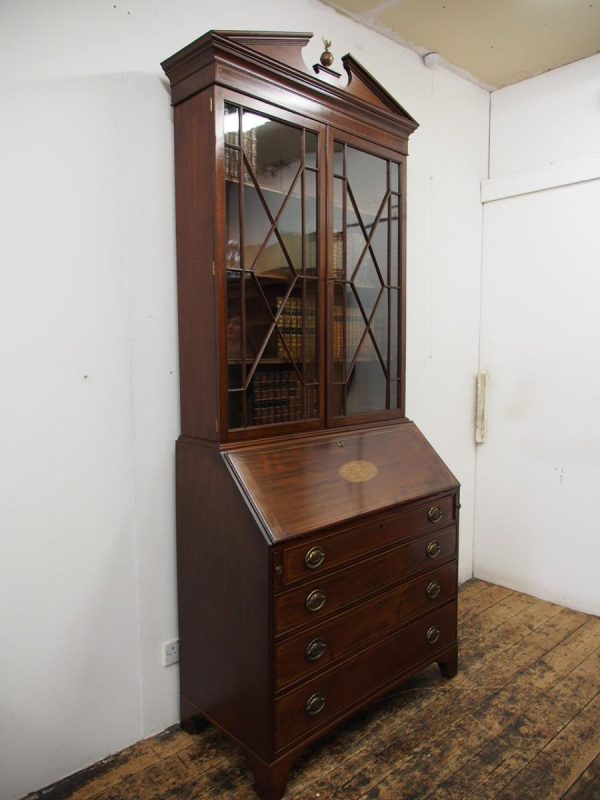 Circa 1790 with minor adaptations, George III inlaid mahogany bureau bookcase. Surmounted by a broken arched pediment over a moulded cornice and inlaid frieze, it has twin astragal glazed doors with original glazing, and the interior with 3 sliding adjustable shelves. The bureau has an oval inlaid panel to the flap, and inside is an inlaid door, drawers, pigeonholes and secret drawer. There are 4 graduated inlaid drawers with oval brass handles and a moulded base with bracket feet.