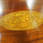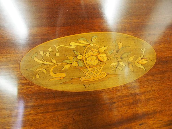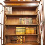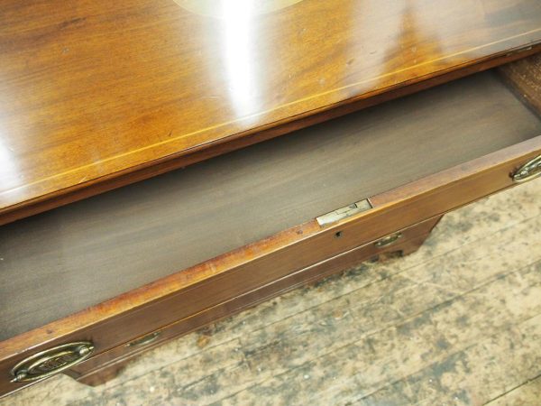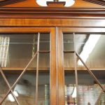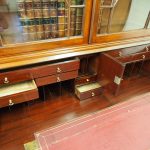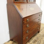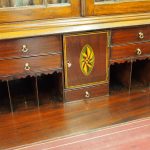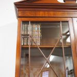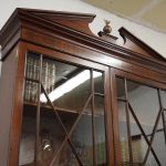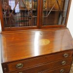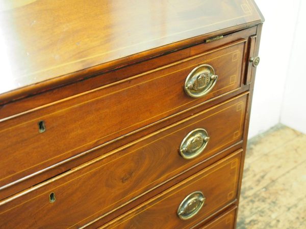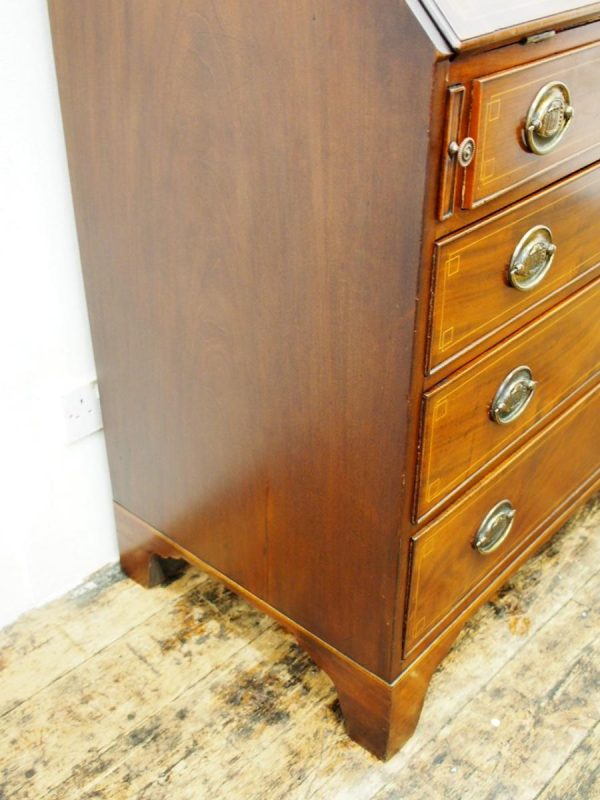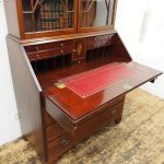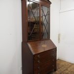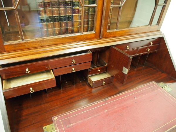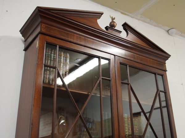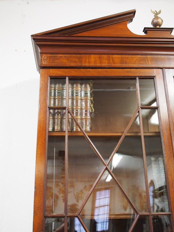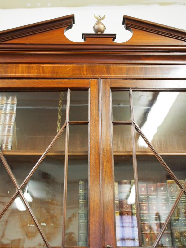 Circa 1790 with minor adaptations, George III inlaid mahogany bureau bookcase. Surmounted by a broken arched pediment over a moulded cornice and inlaid frieze, it has twin astragal glazed doors with original glazing, and the interior with 3 sliding adjustable shelves. The bureau has an oval inlaid panel to the flap, and inside is an inlaid door, drawers, pigeonholes and secret drawer. There are 4 graduated inlaid drawers with oval brass handles and a moulded base with bracket feet.